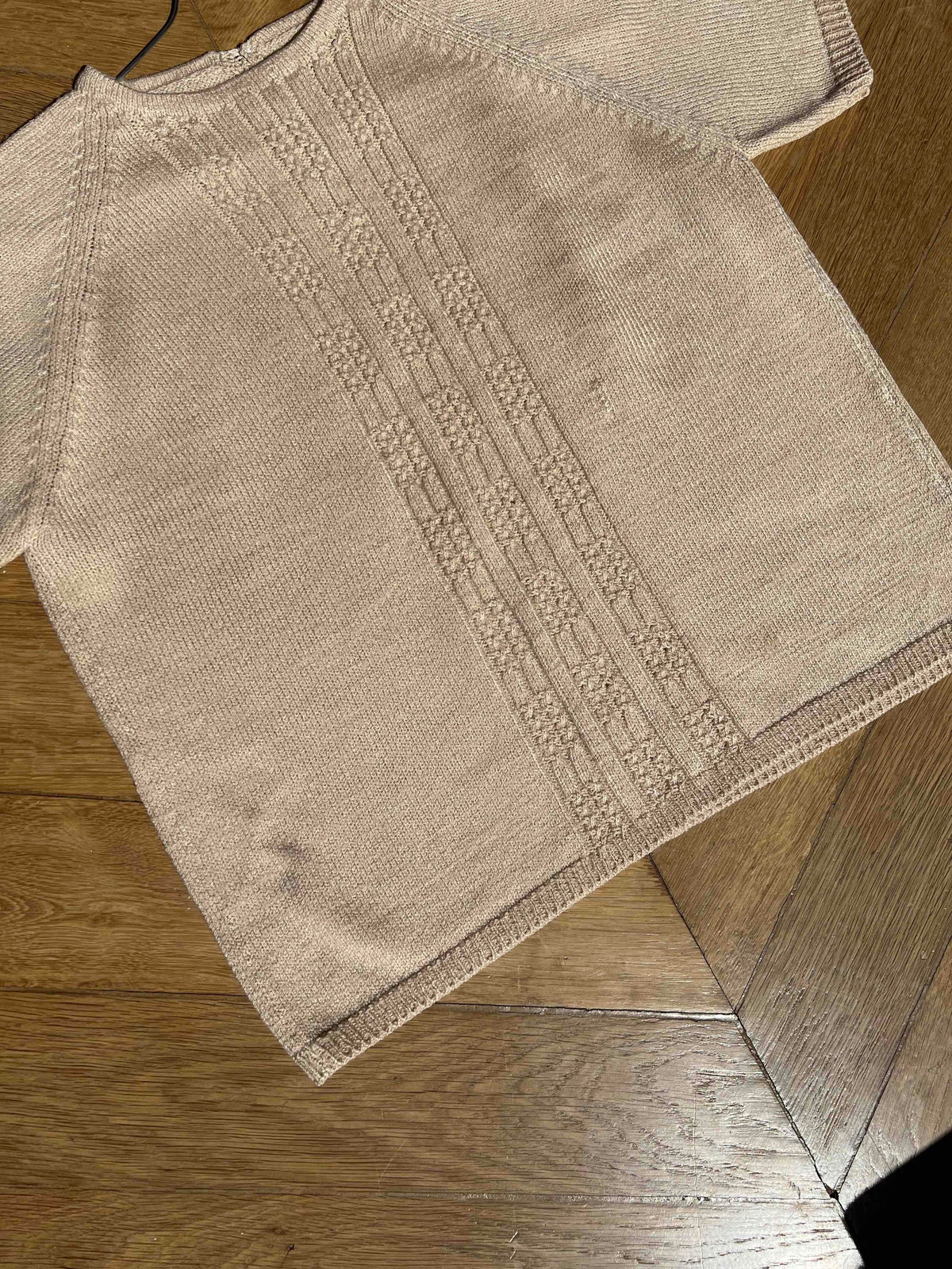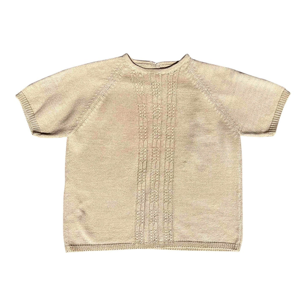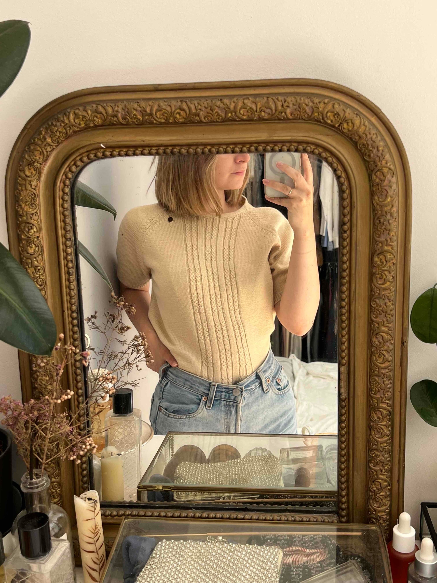 Prix unitaire parTop en maille à manches courtes beige clair, détails de deux boutons nacrés dans le cou. Couleur café au lait. Taille 36/38. Années 70s.