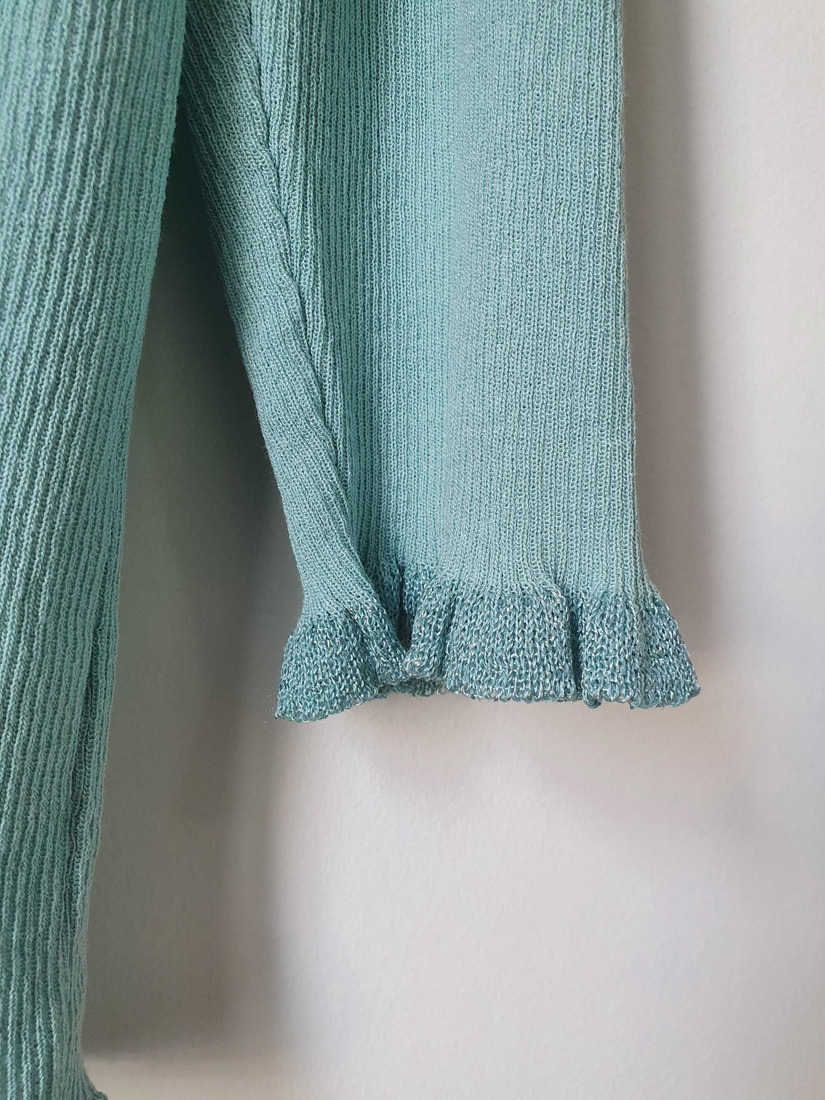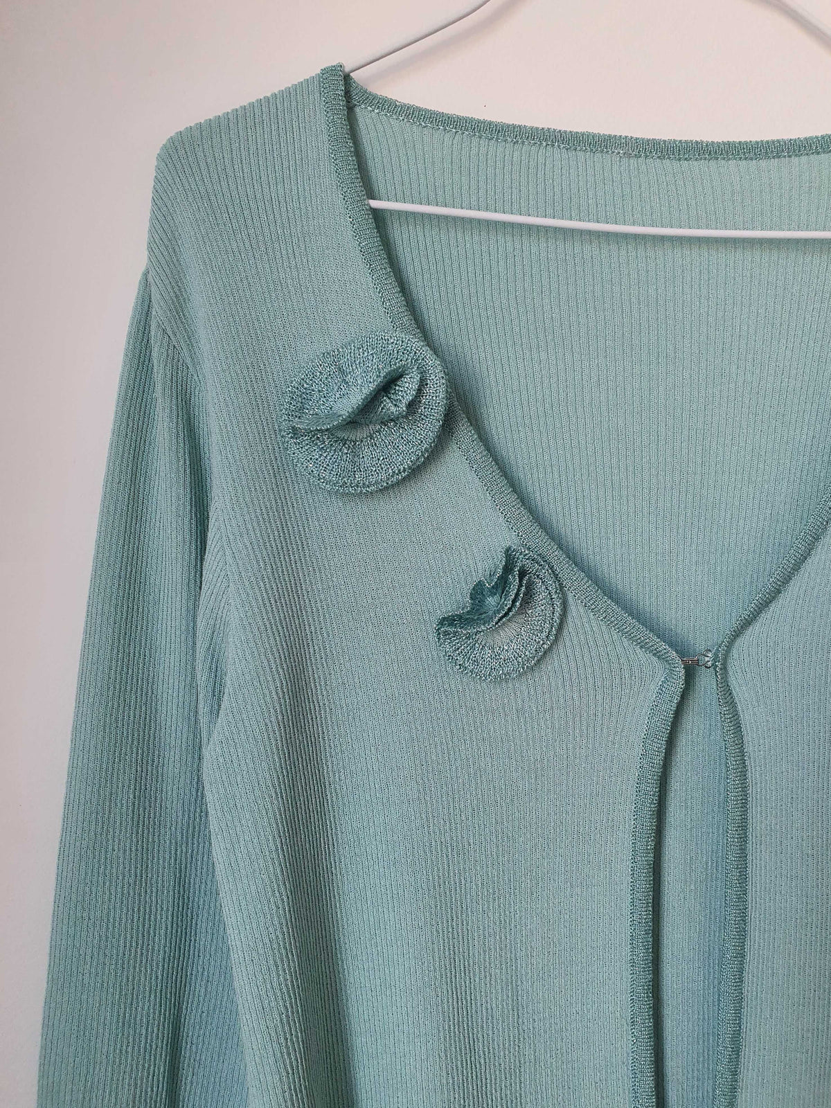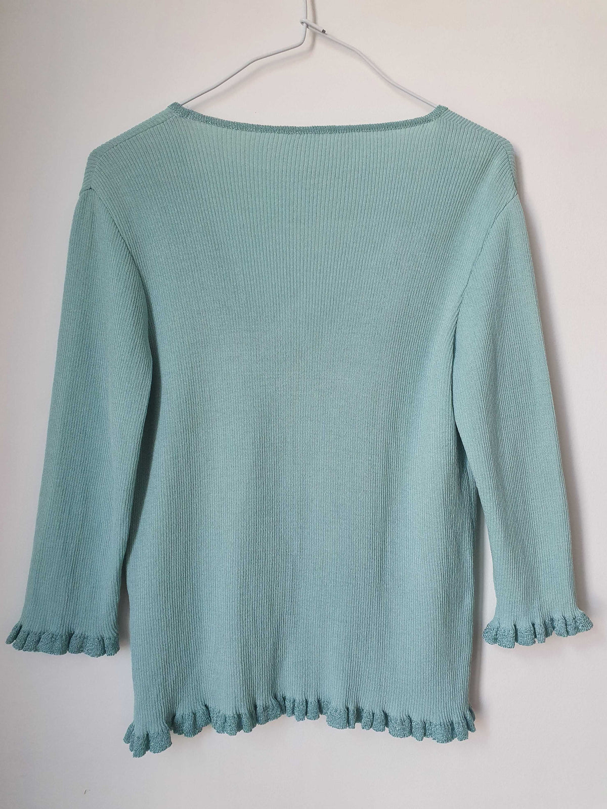 Top bleu turquoise. Se ferme par un petit crochet. Deux fleurs brodées. Liseré avec de légères paillettes. Manches 3/4. Très bon état. Taille 38 ou 40 si porté ajusté.
