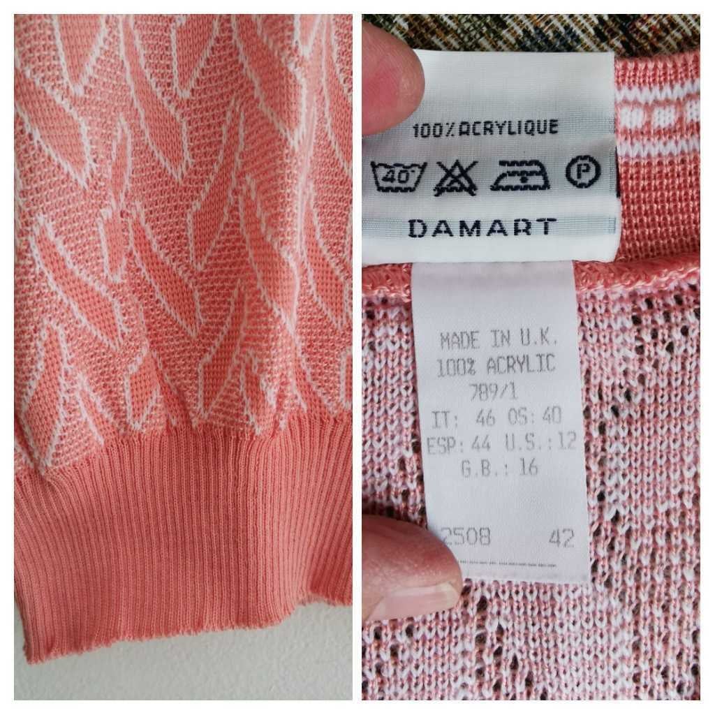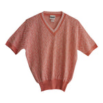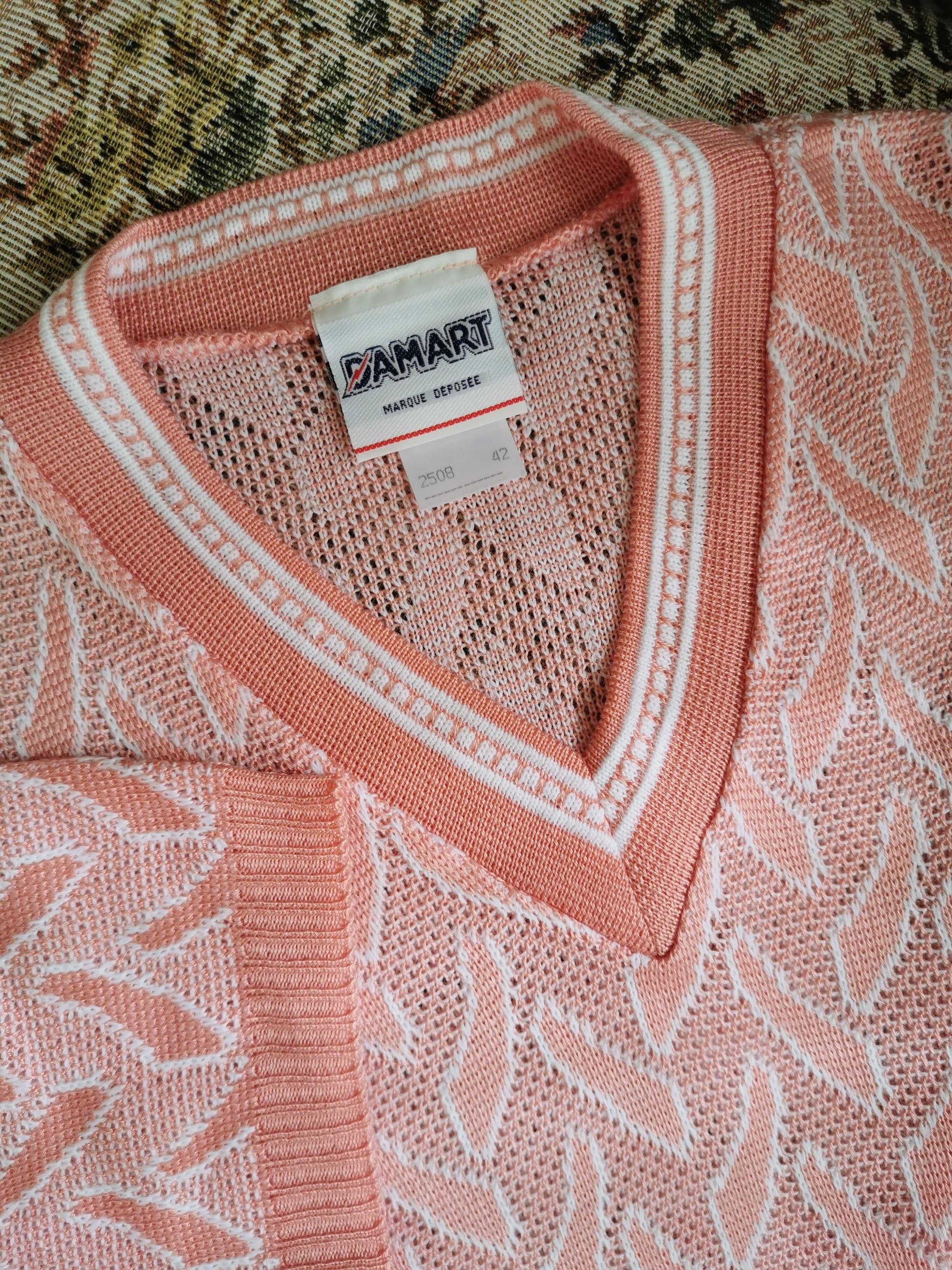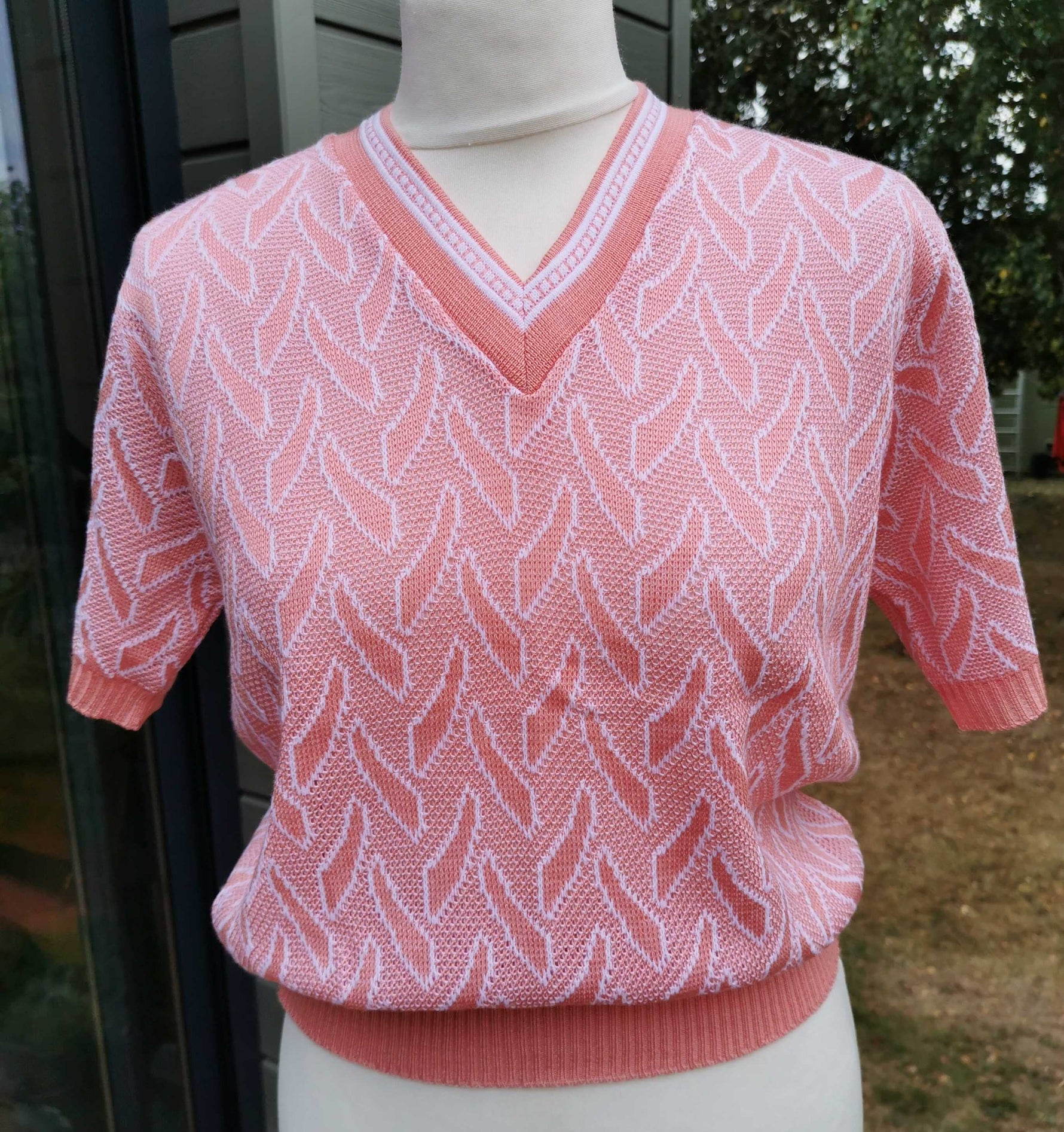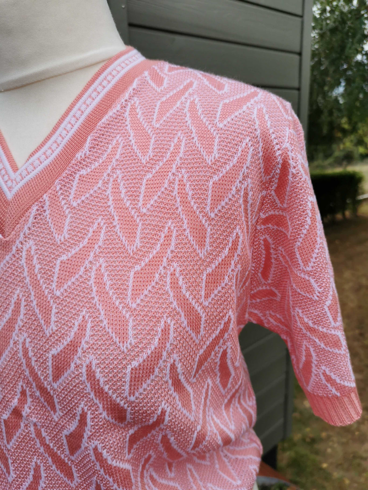Prix unitaire parTop en maille. Made in France. Manches courtes. Col V. Matière acrylique de qualité rose pastel avec motifs blancs. Bel état.
