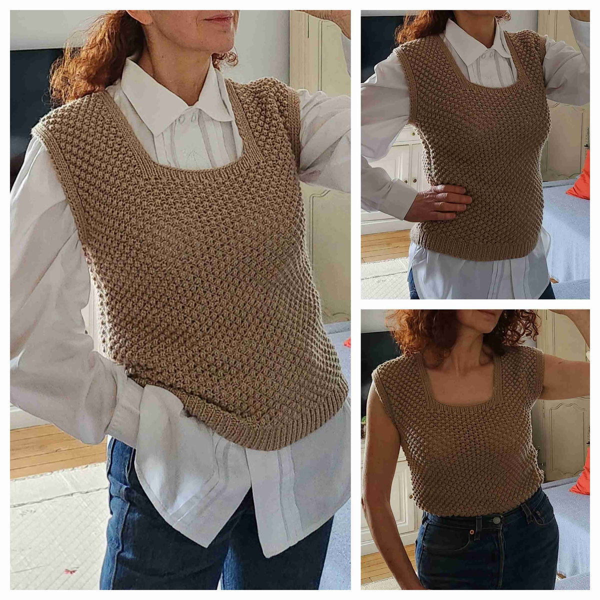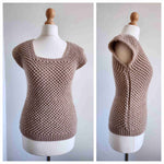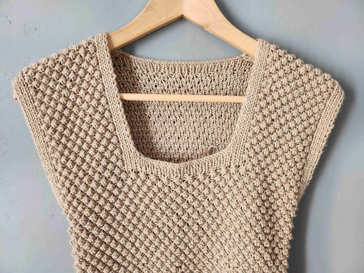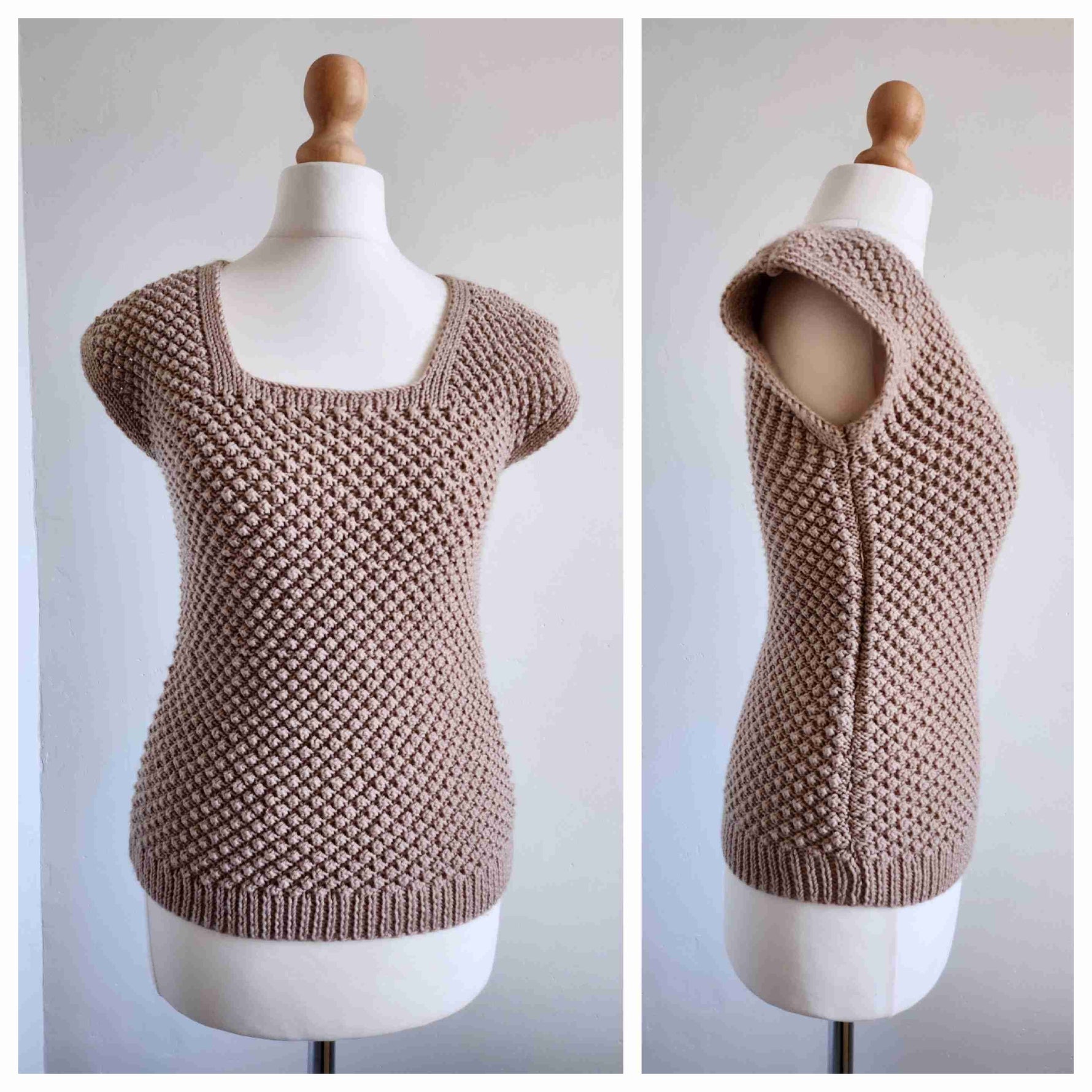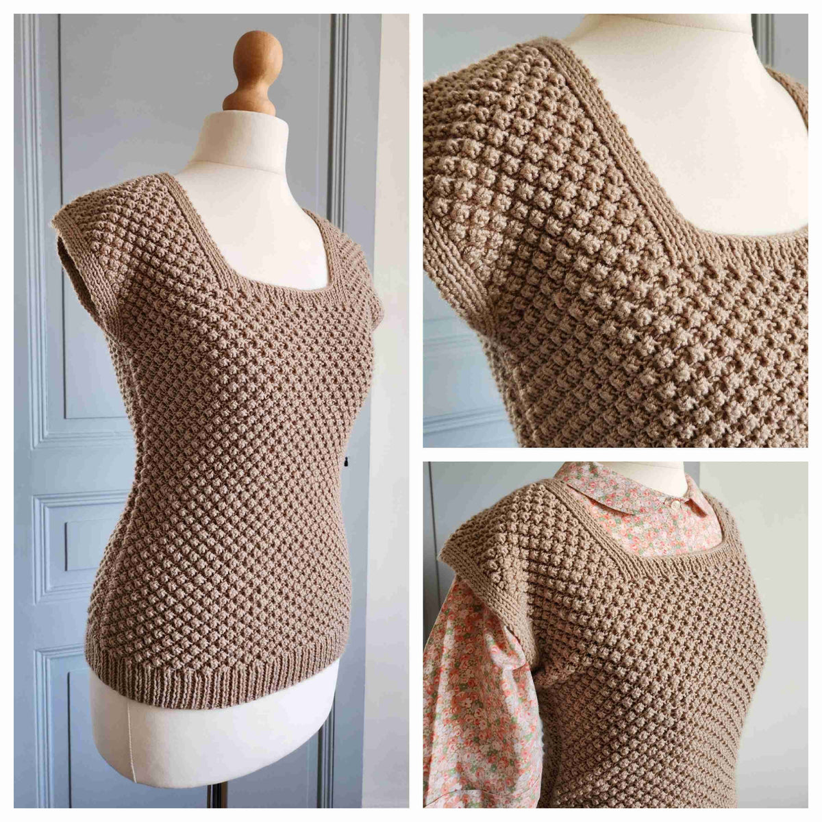 Pull en laine mélangée beige, à mini manches ne couvrant que les épaules, encolure carrée, matière douce. Point de mûre tricoté à la main. Porté sur les photos par une taille 36.