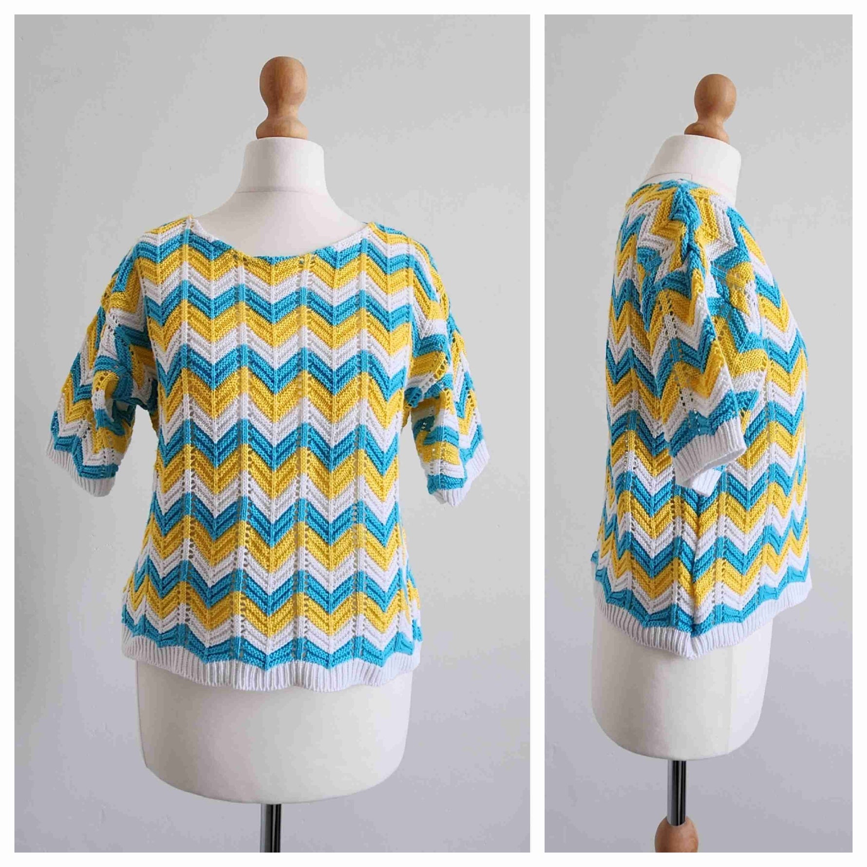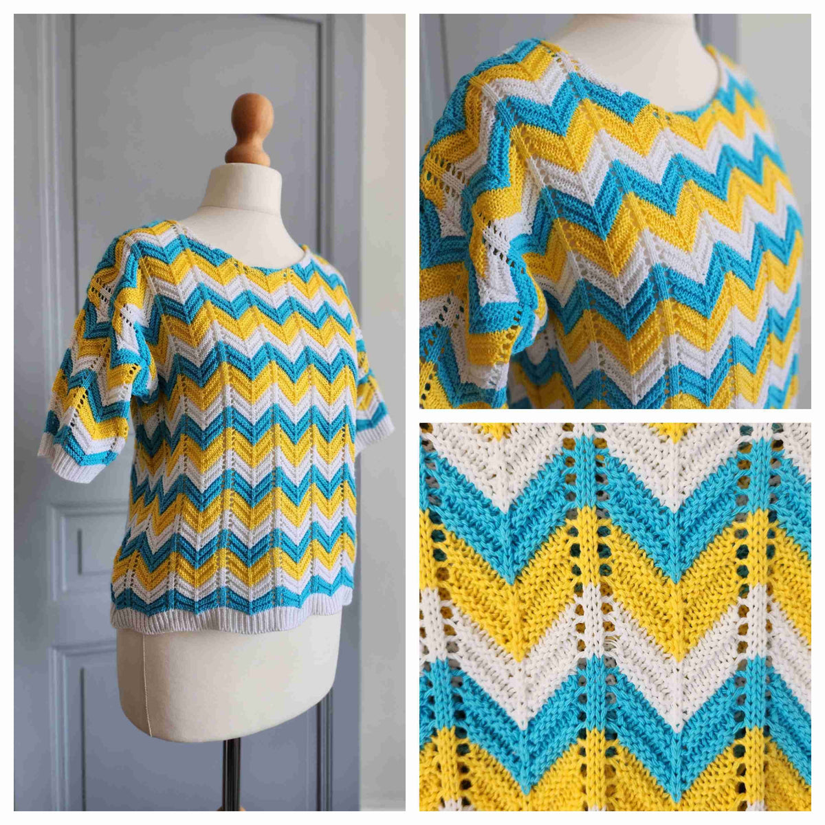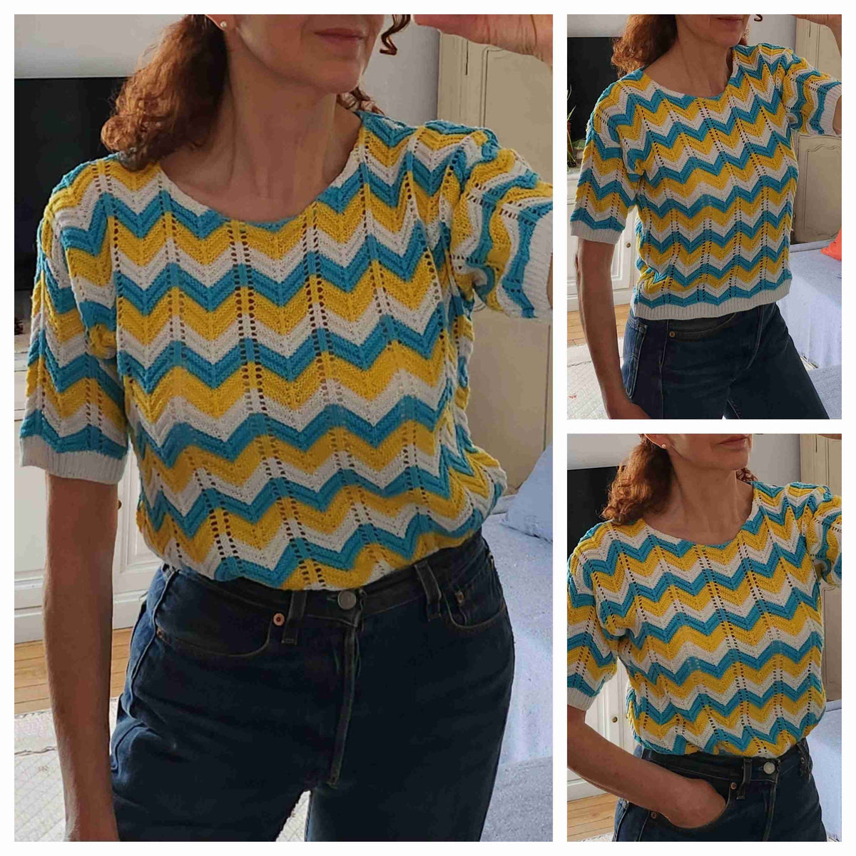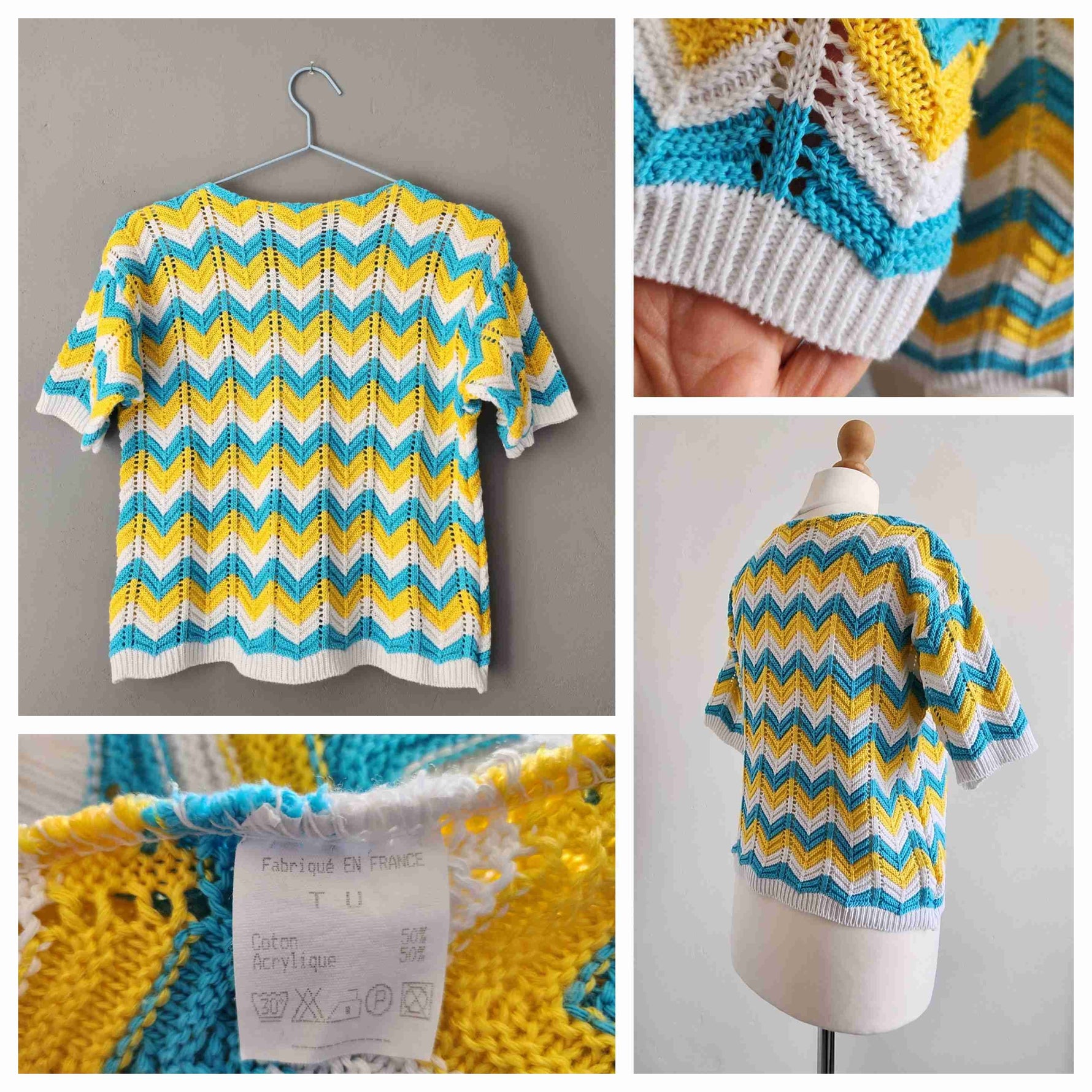 Top en maille coton mélangé, à motif géométrique blanc jaune et bleu, manches courtes, encolure ronde, finitions côtes. Porté sur les photos par une taille 36. Fabriqué en France.