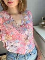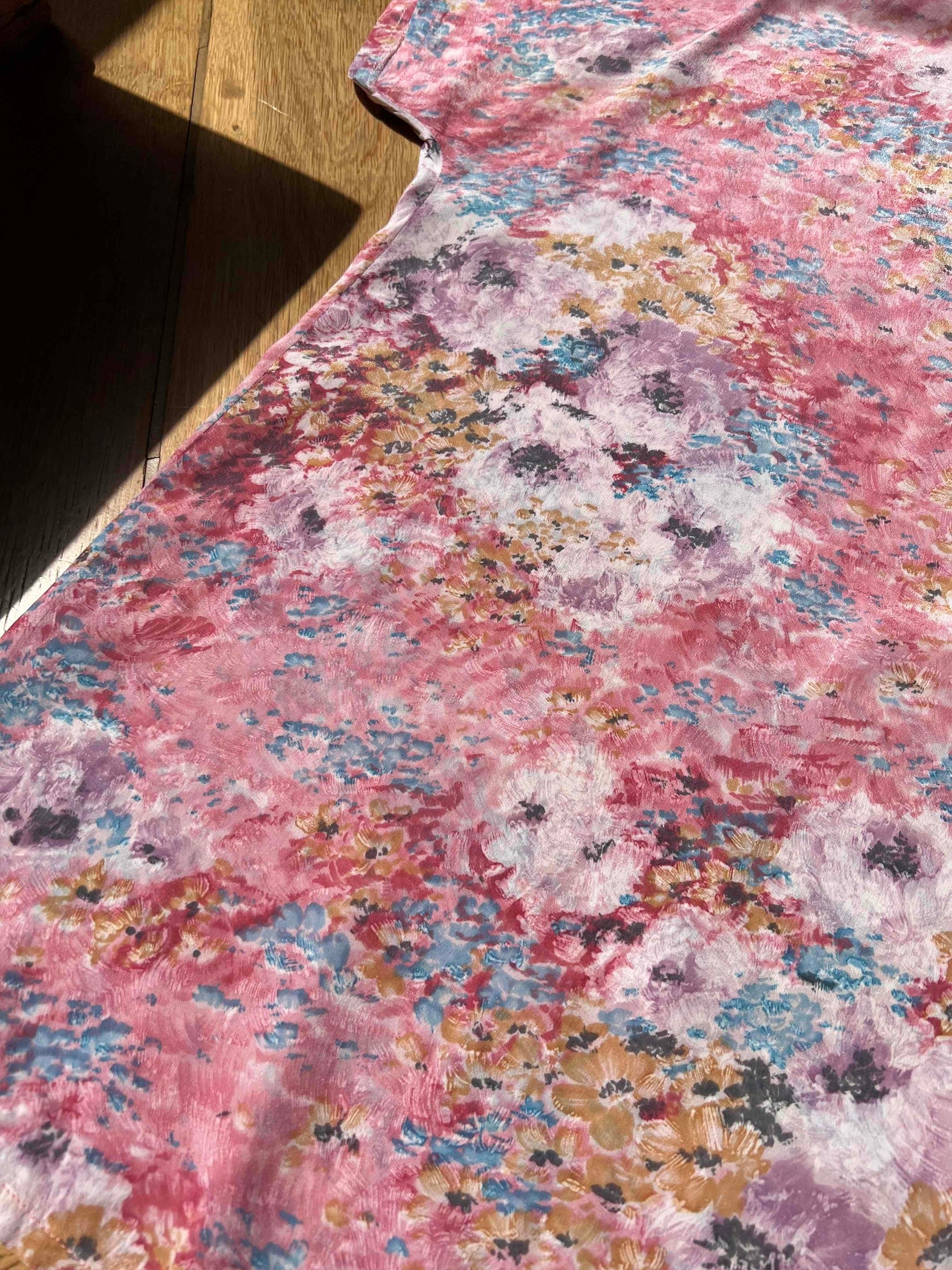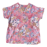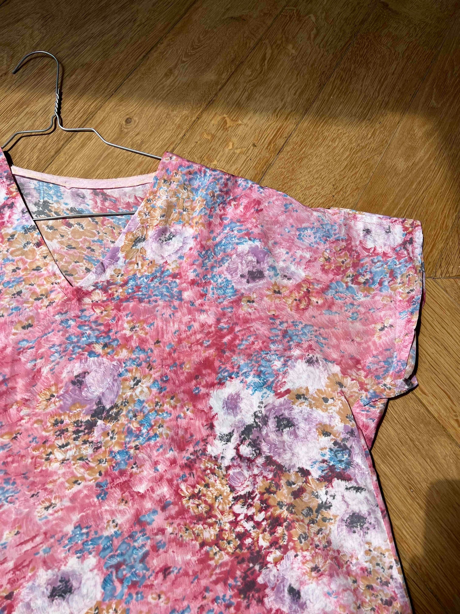 Prix unitaire parTop fluide à manches courtes en soie rose pastel à fleurs. Col V. Création d’une couturière. Années 70s - taille 36/38.