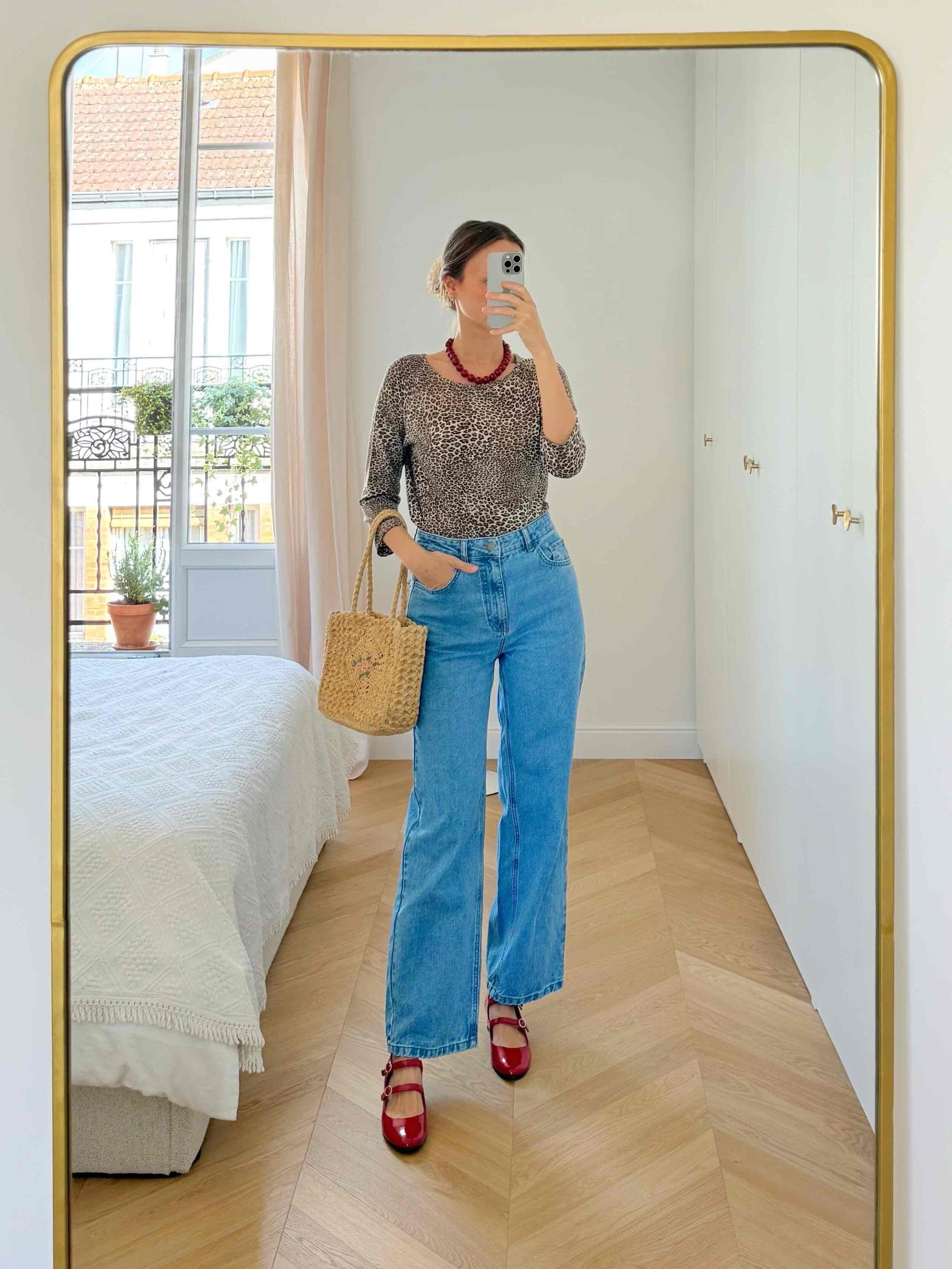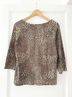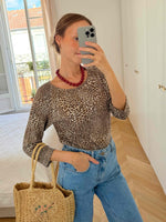 Prix unitaire parTop léopard en tissu doux et stretch, composé d’acrylique, laine et élasthanne. Col rond, manches longues. Porté ici sur une taille 36 (1m64).