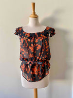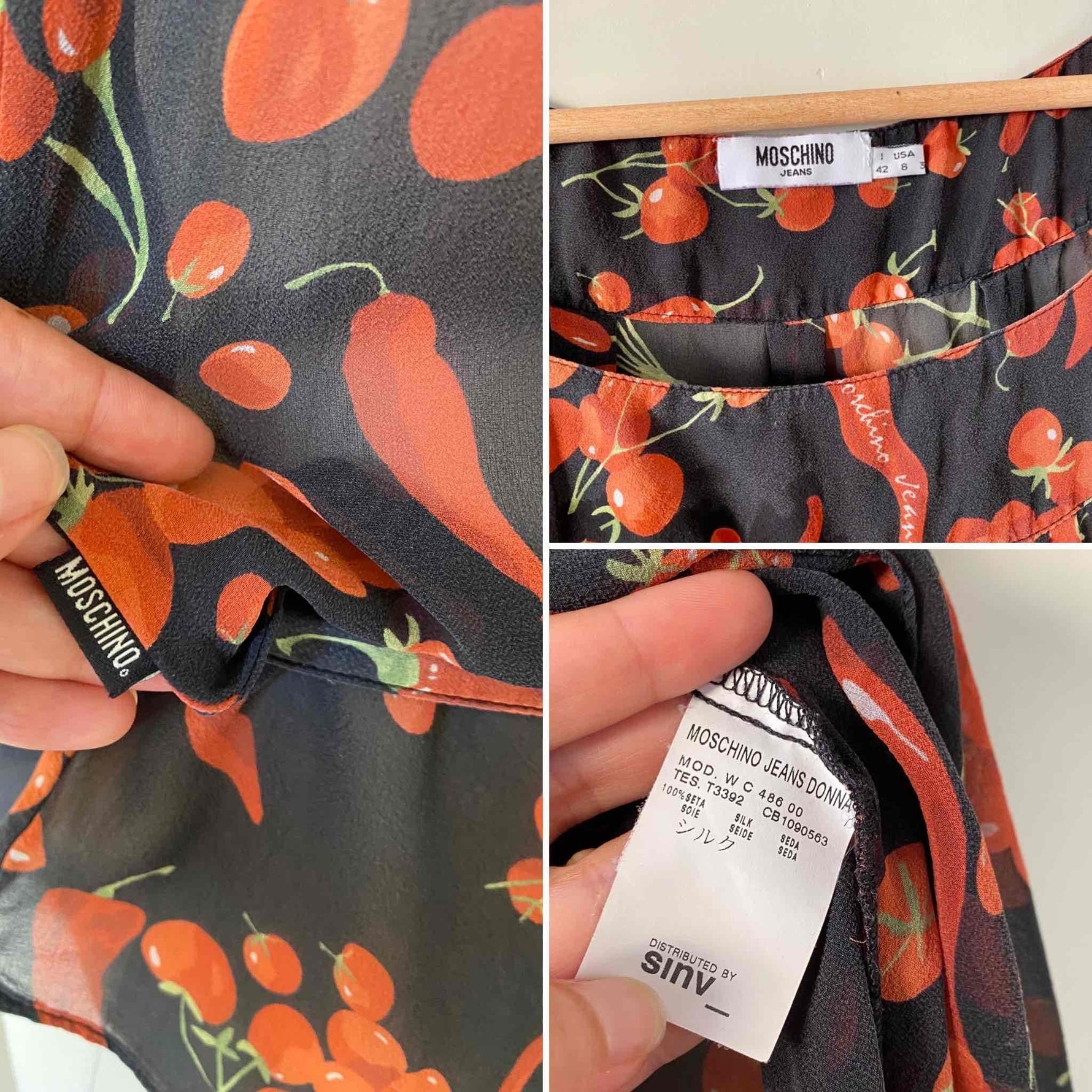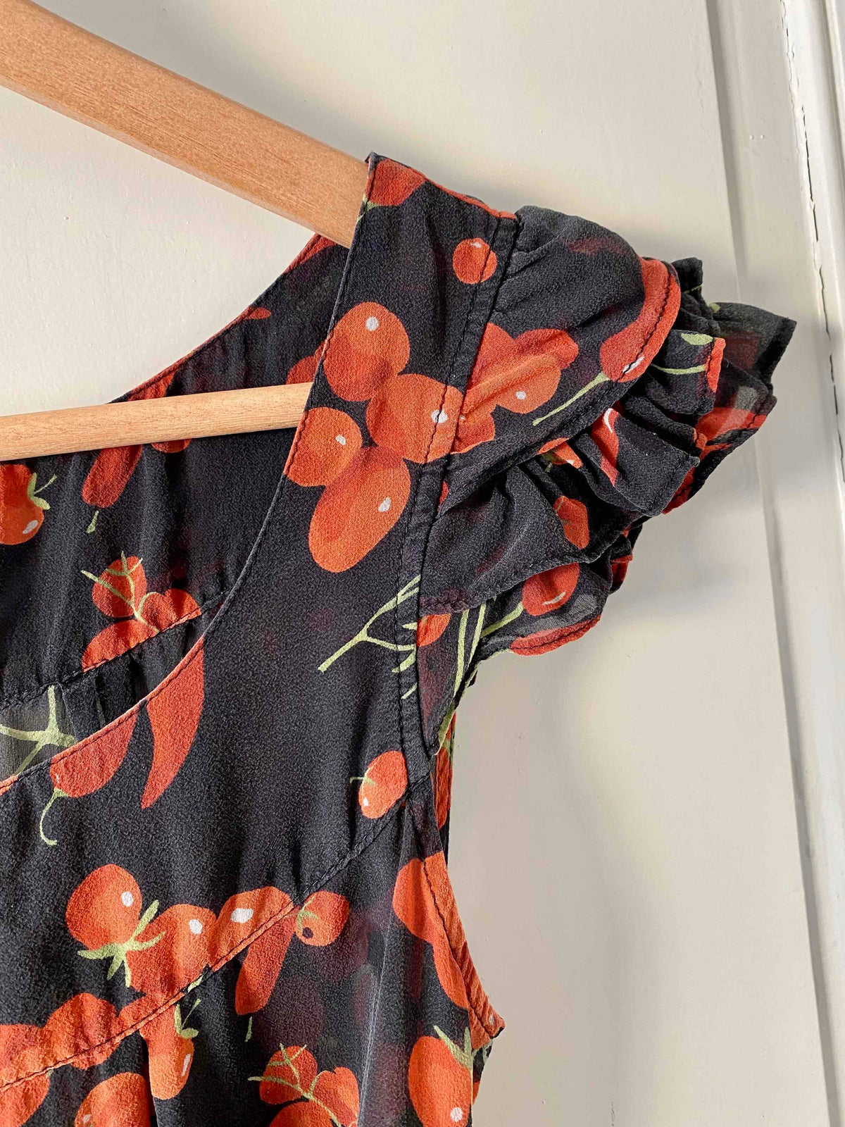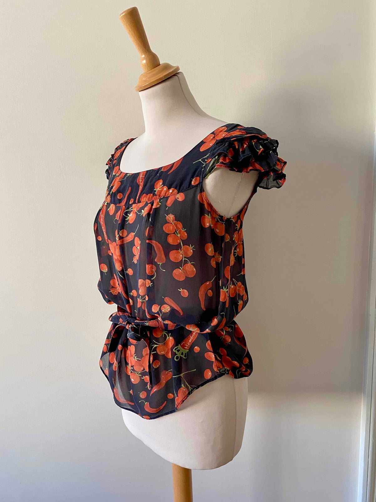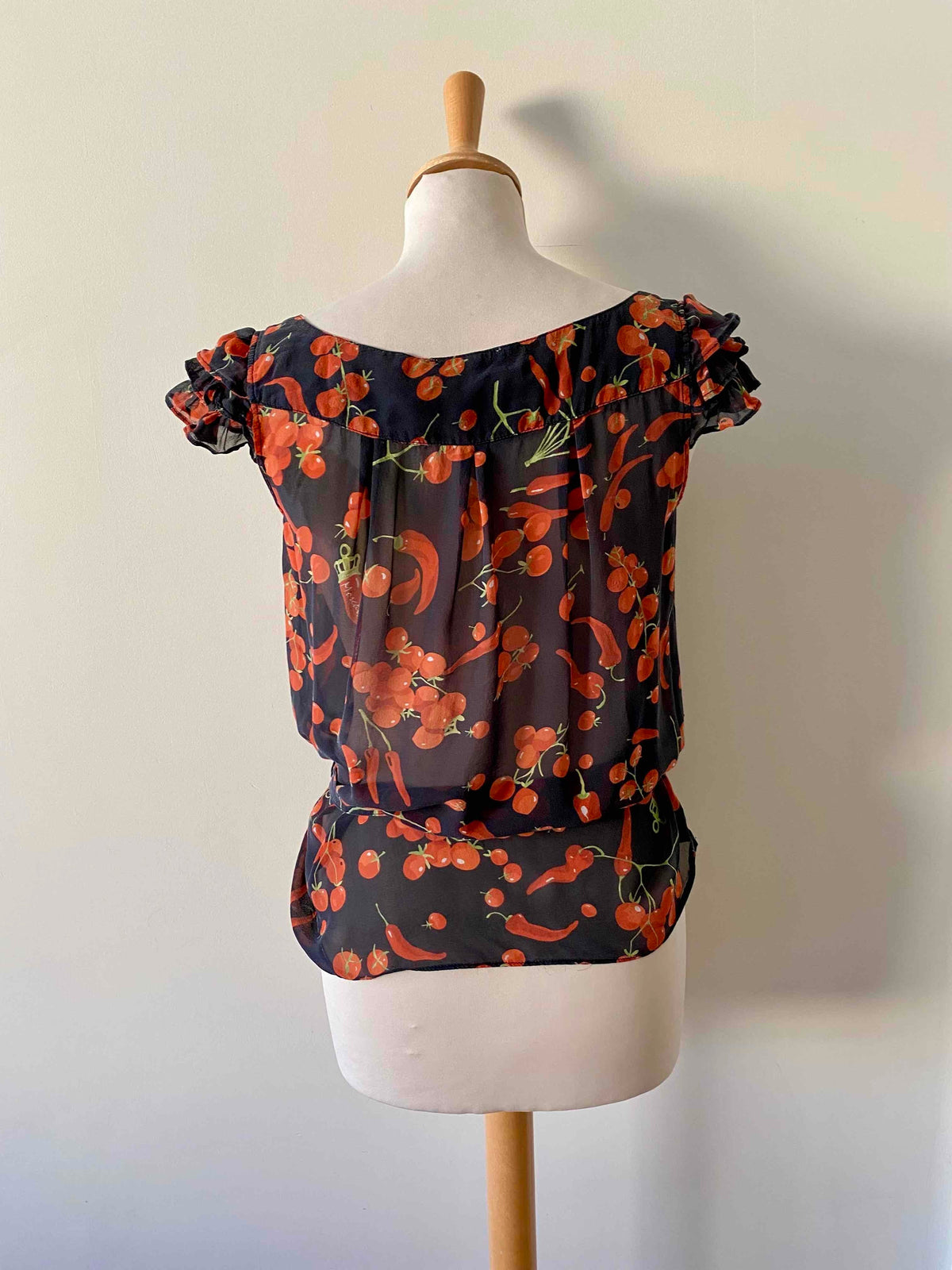 Prix unitaire parTop en soie Moschino Jeans en crêpe de soie noire imprimée cerises et piments rouges et verts, taille à nouer, manches volantées, taille 36 portée ici sur un mannequin T36.
