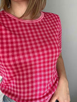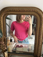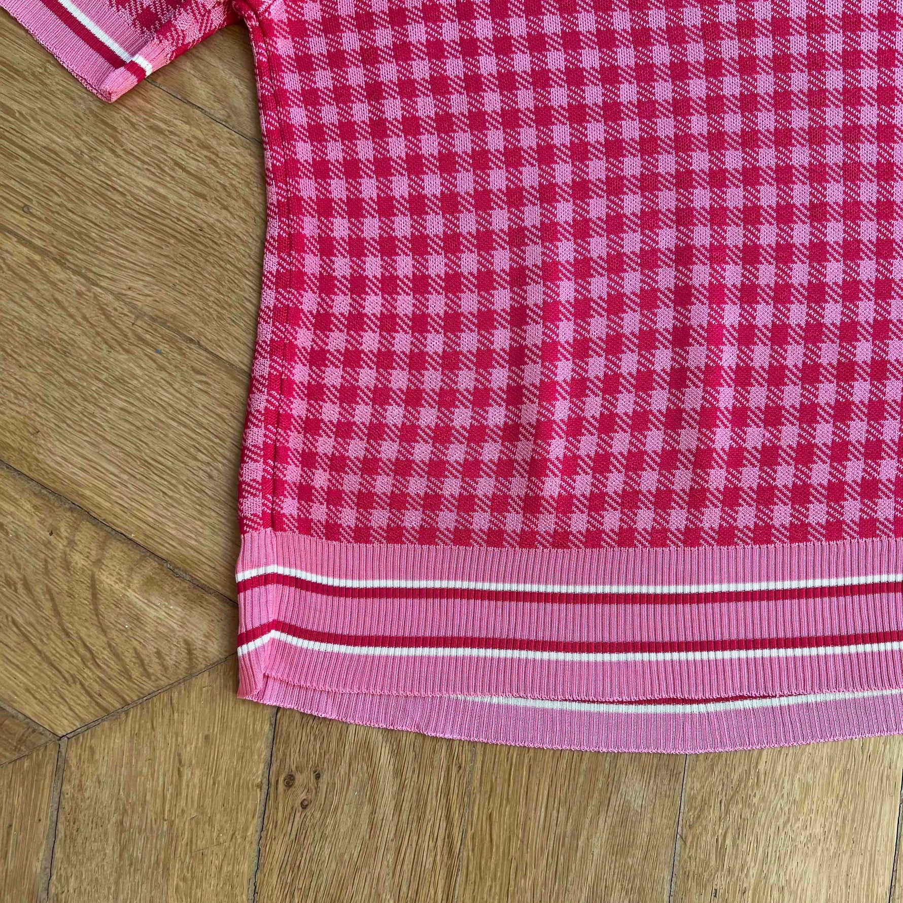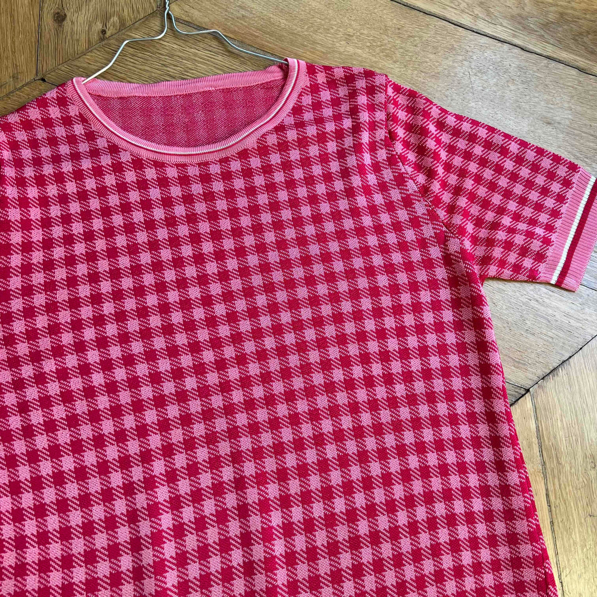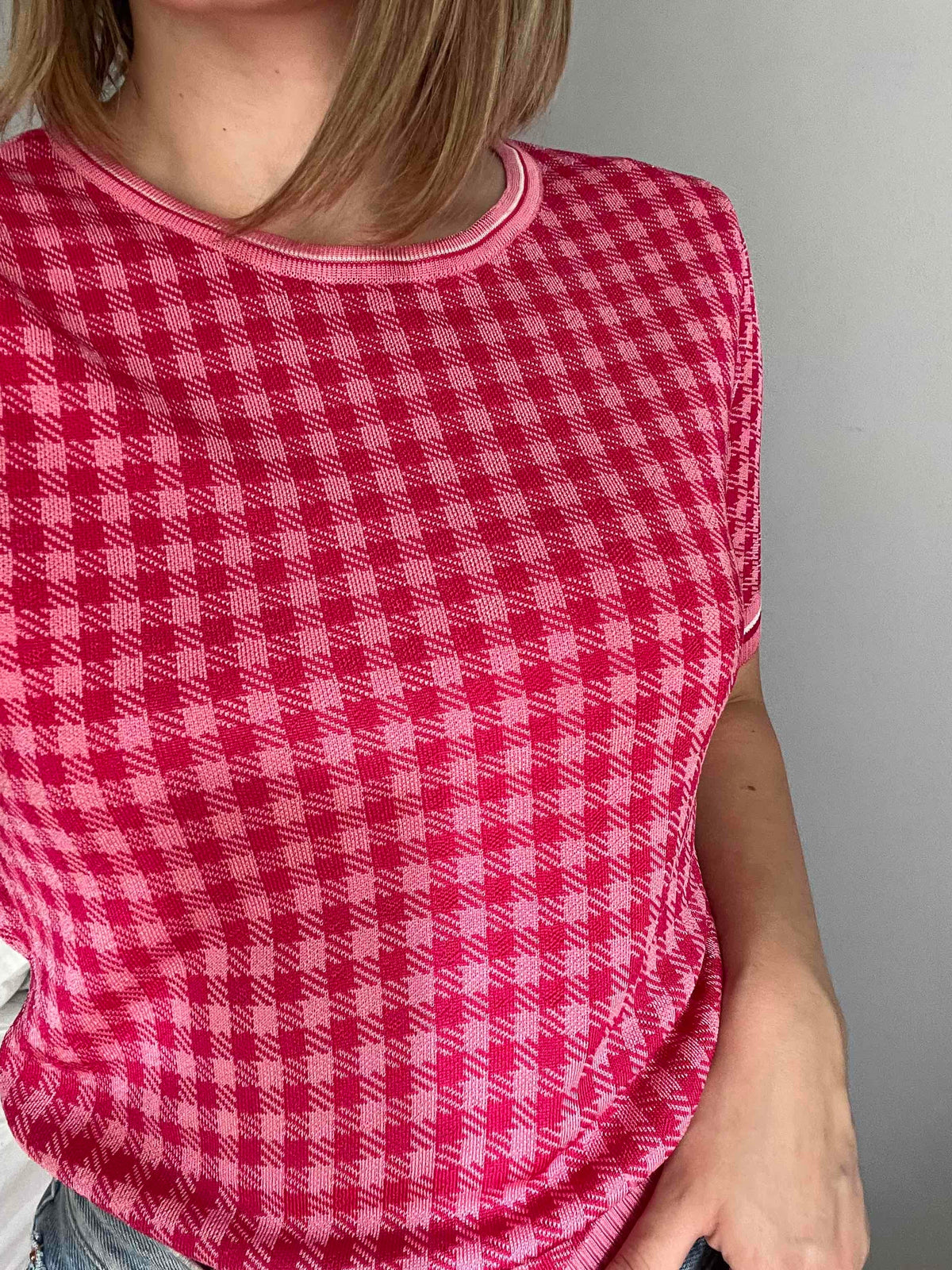 Prix unitaire parTop à manches courtes rose vif à motif pied de poule, viscose effet Maille. Aucune étiquette. Taille 36/38. Excellent état, aucun défaut années 90.