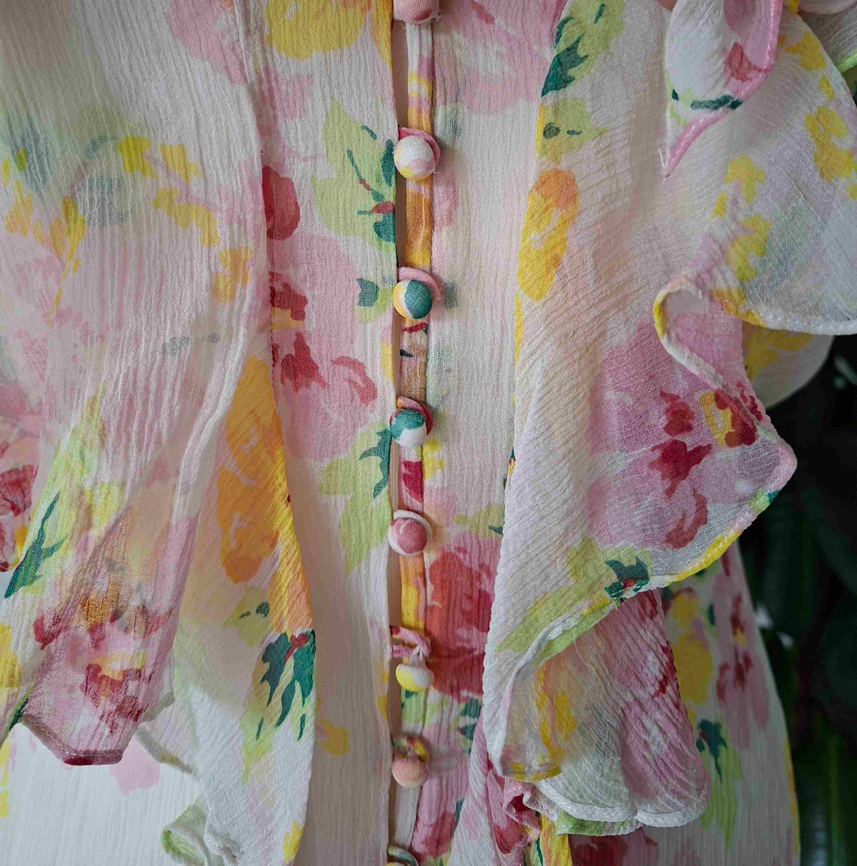 Bohème avec son large col à volants descendant en cascades le long des boutonnières