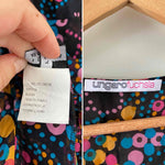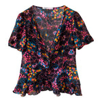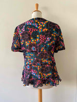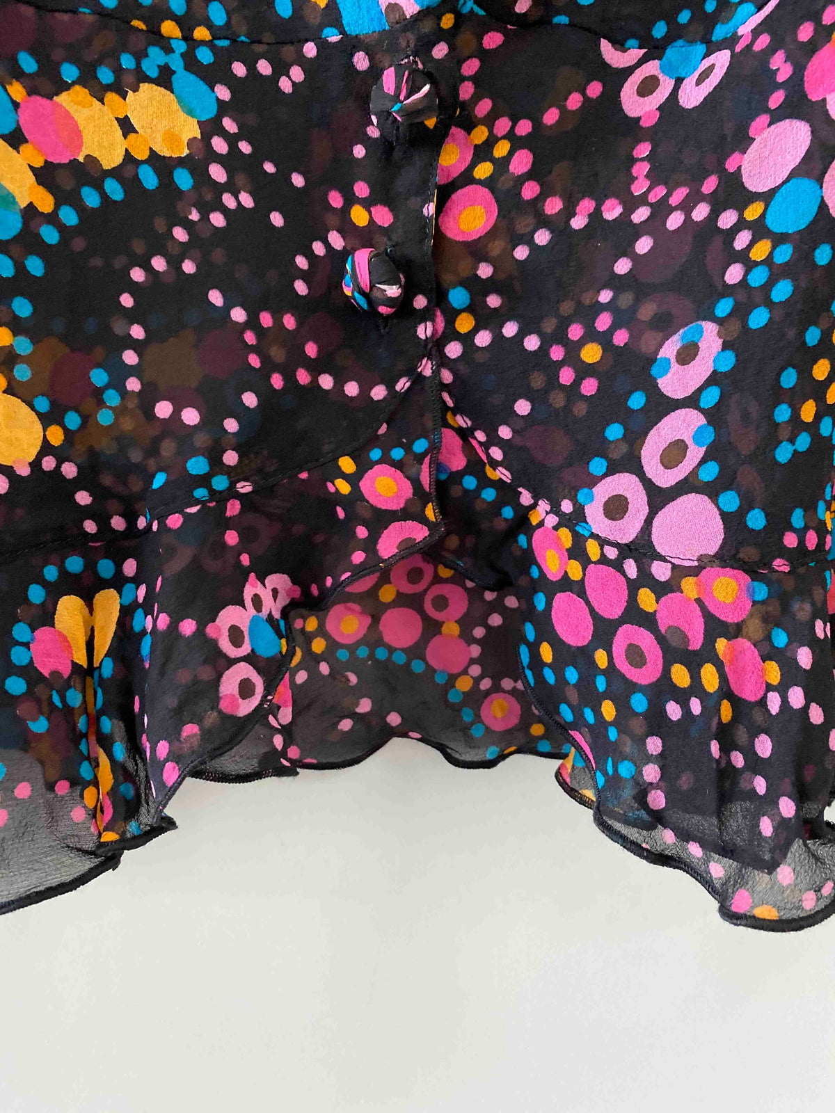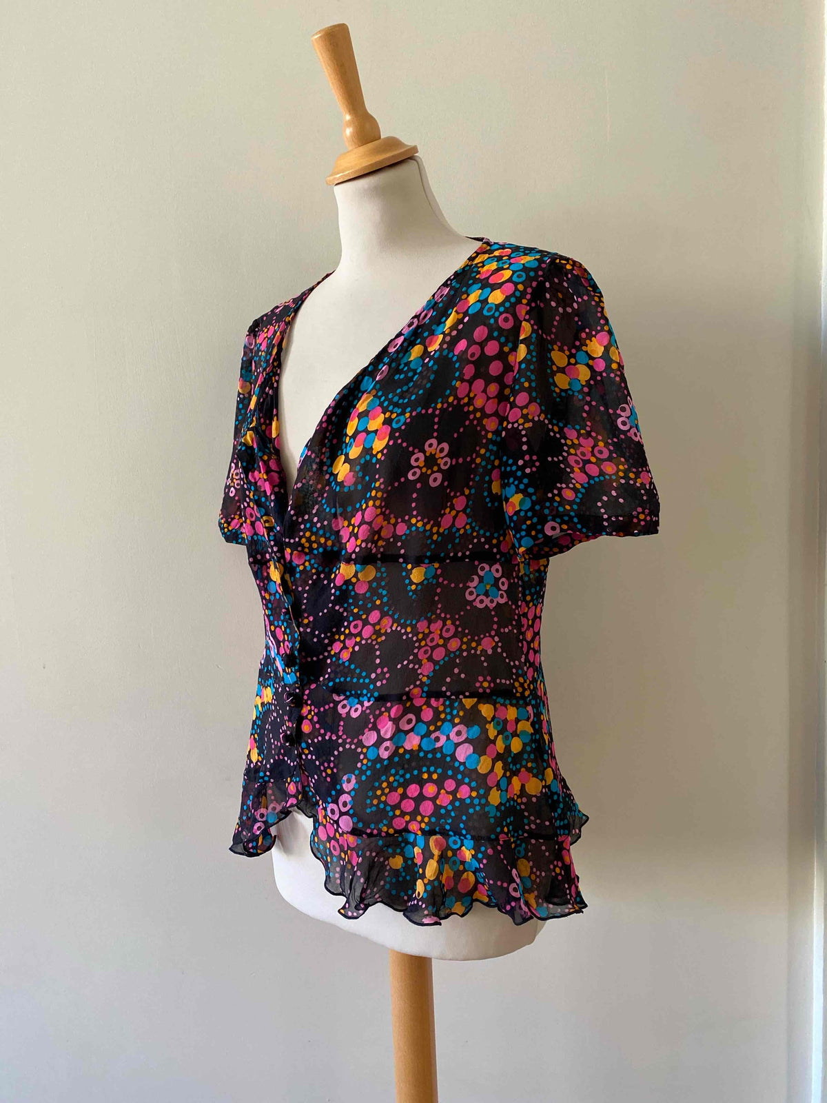 Prix unitaire parTop manches courtes en soie Ungaro en mousseline de soie imprimée pois multicolores, boutons recouverts, taille à basque volantée, fabriqué en Italie, taille 38 porté ici sur un mannequin T36.