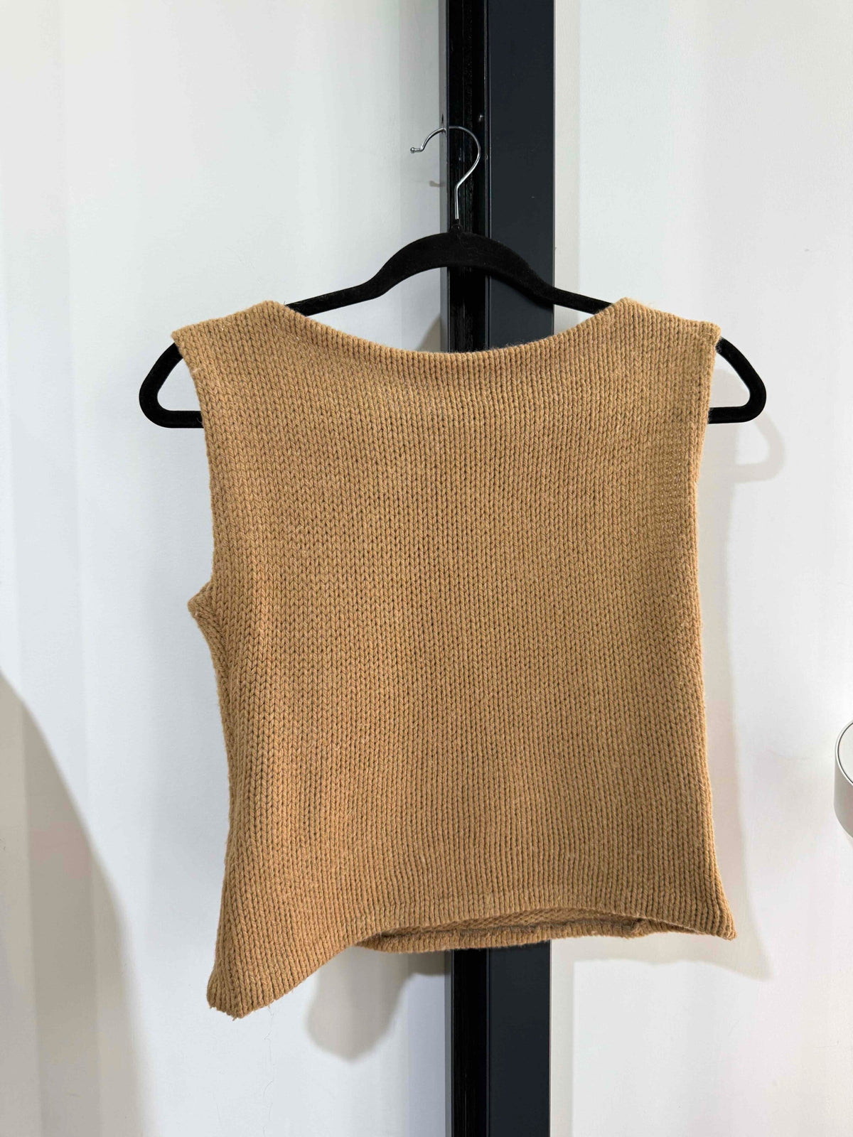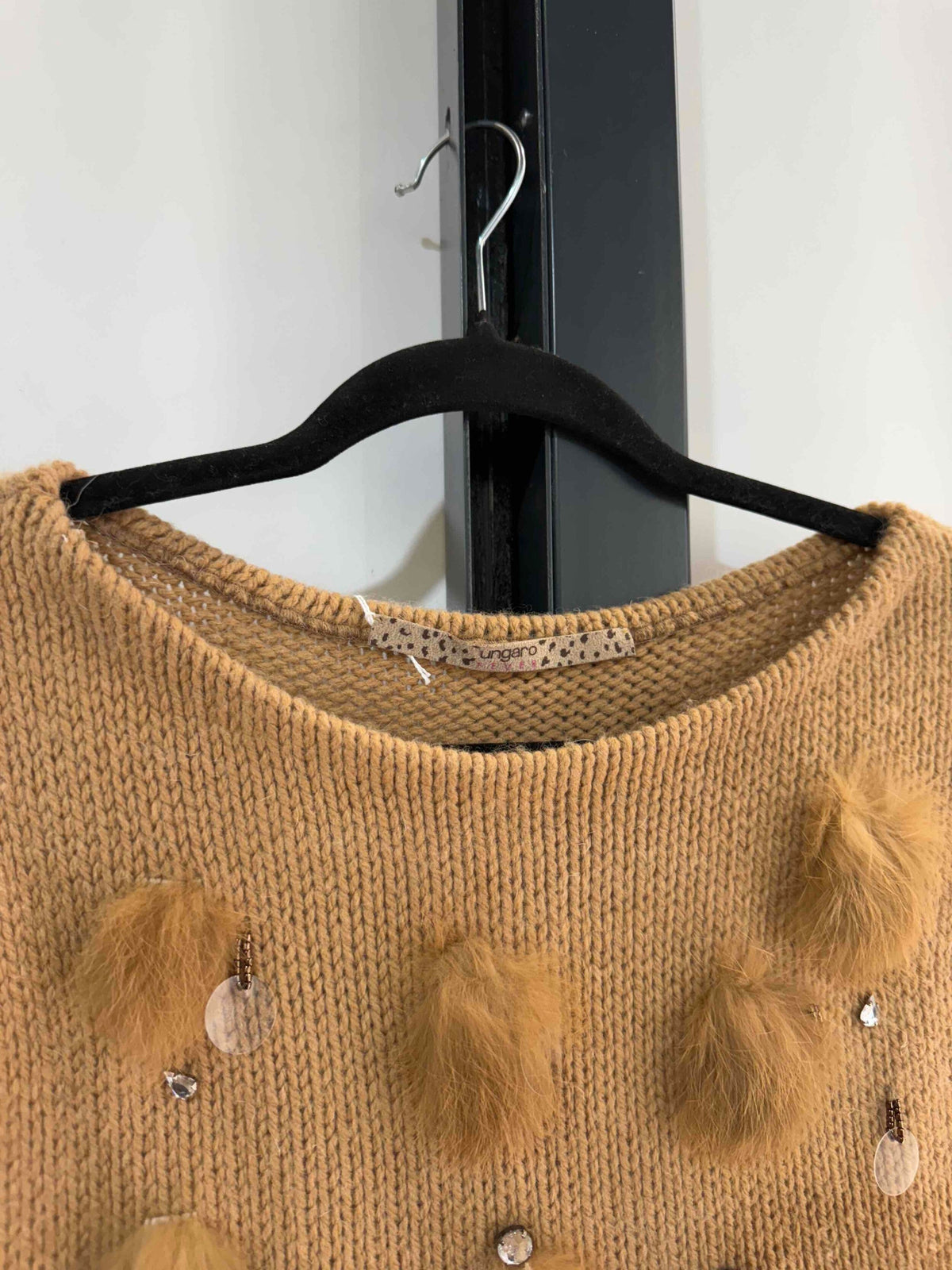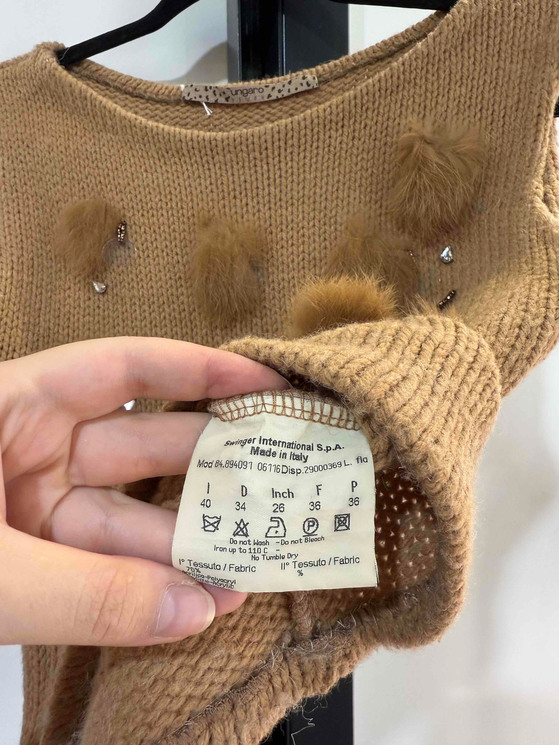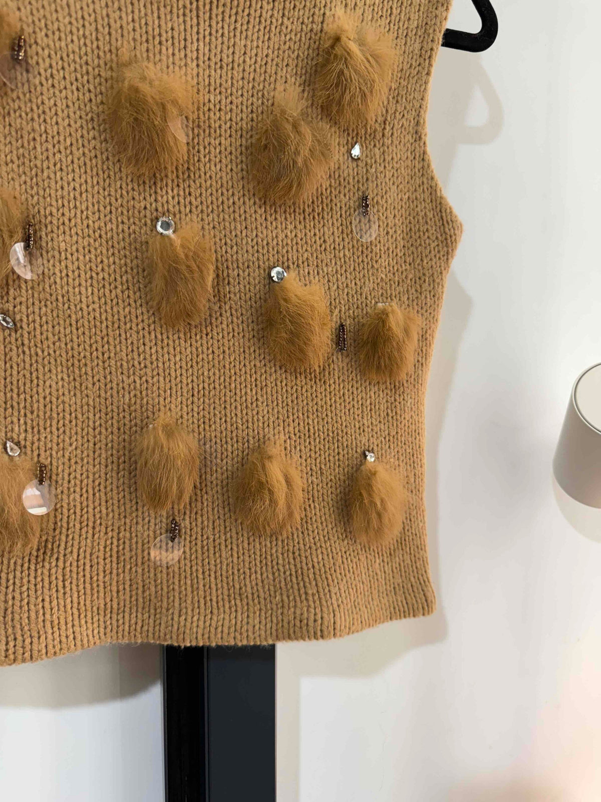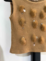 Prix unitaire parTop sans manche en maille avec des détails pompon en fourrure beige avec des perles. Marque Ungaro. 2000s, taille 36. Col bateau. Made in Italy.