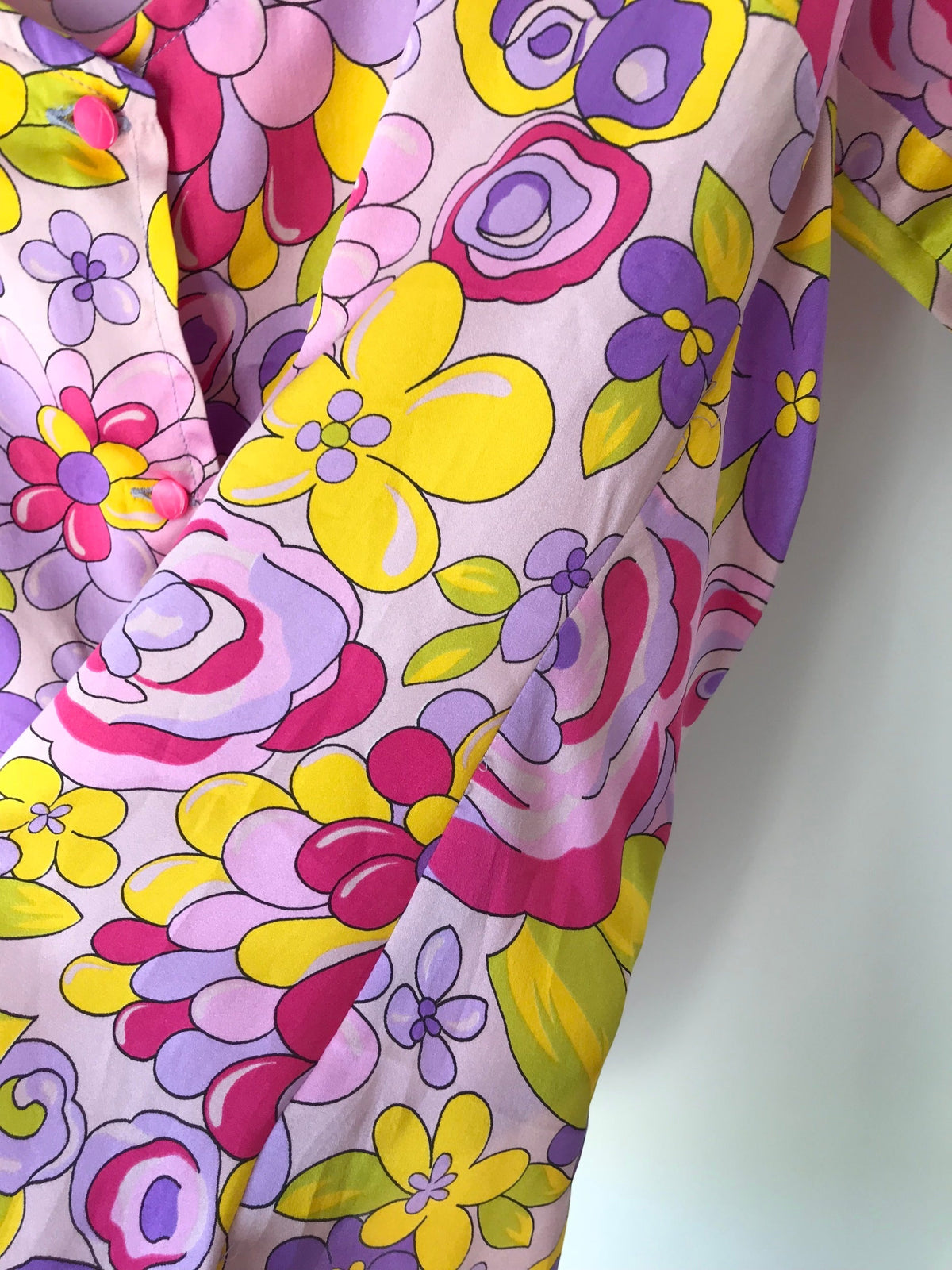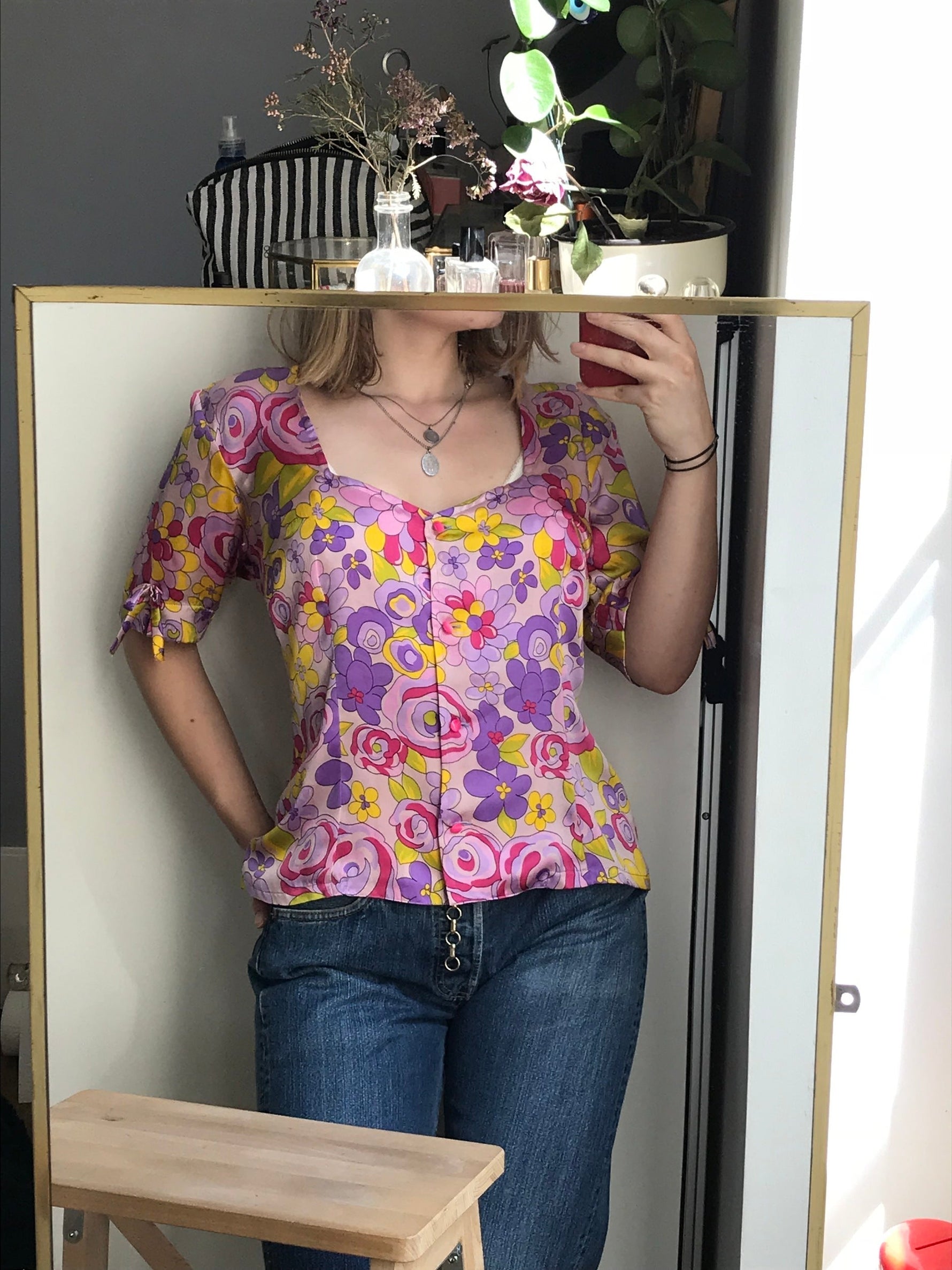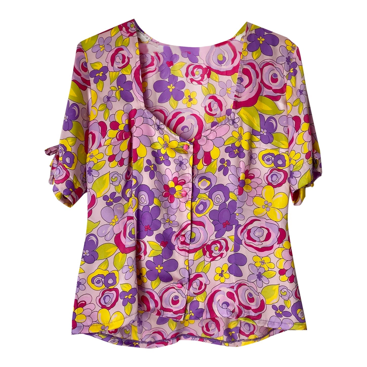 Prix unitaire parTop romantique en soie à fleurs dans des tons de violet rose orange. Boutonné devant, décolleté et noeud sur les manches. Valentino