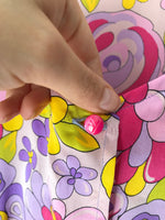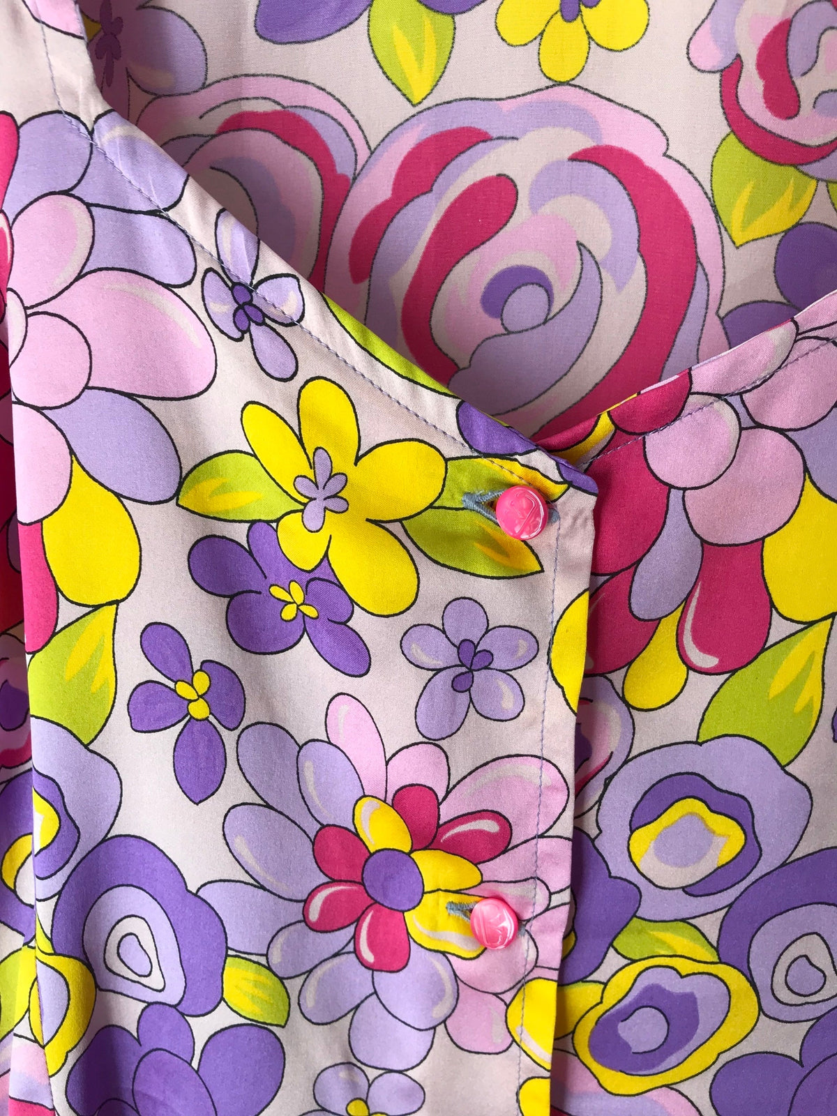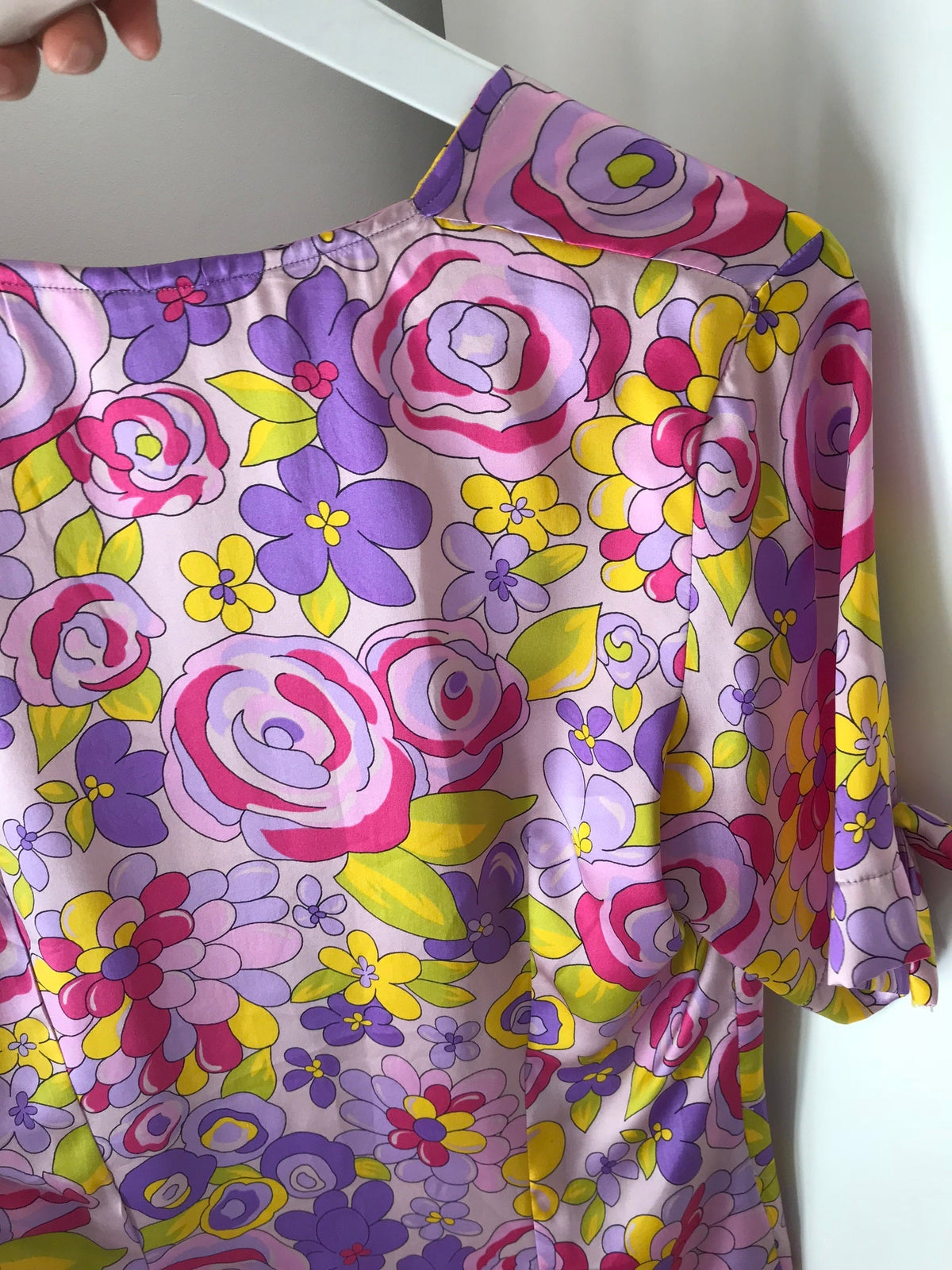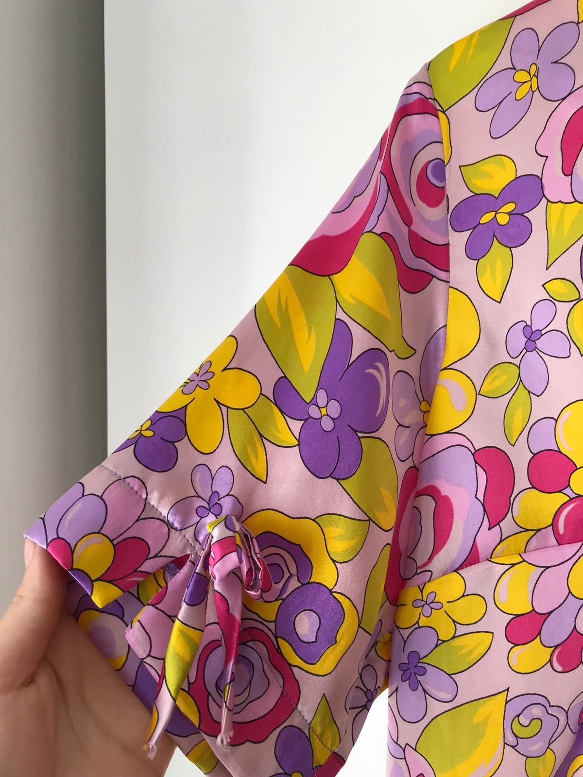 Prix unitaire parTop romantique en soie à fleurs dans des tons de violet rose orange. Boutonné devant, décolleté et noeud sur les manches. Valentino
