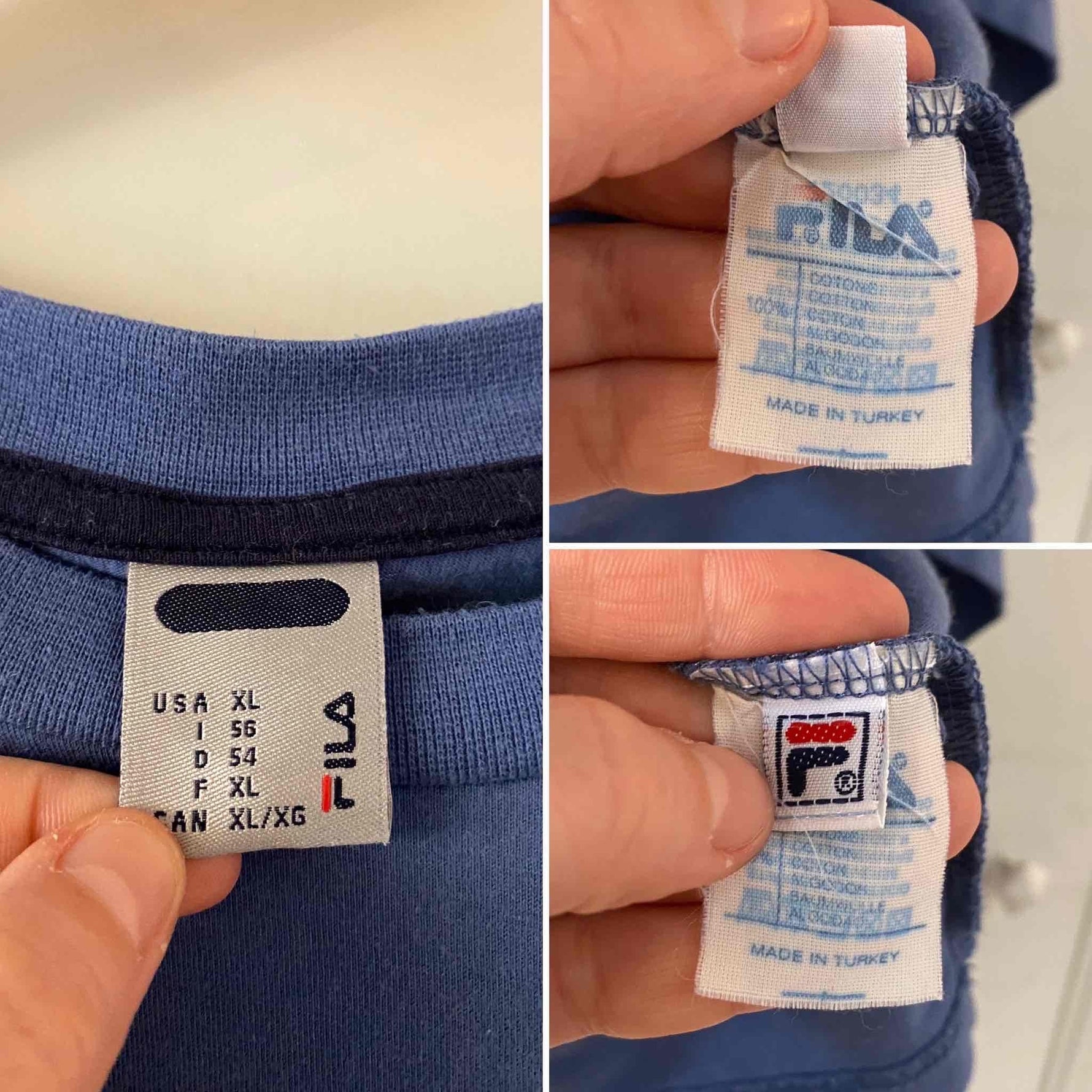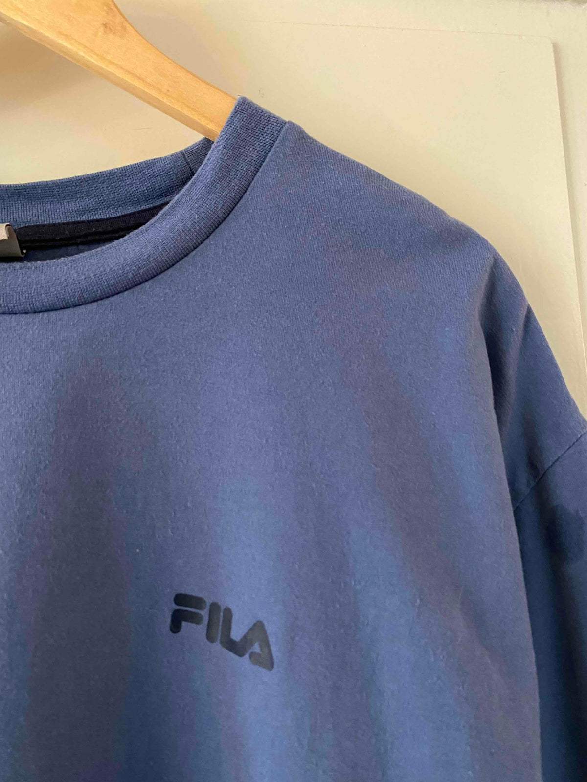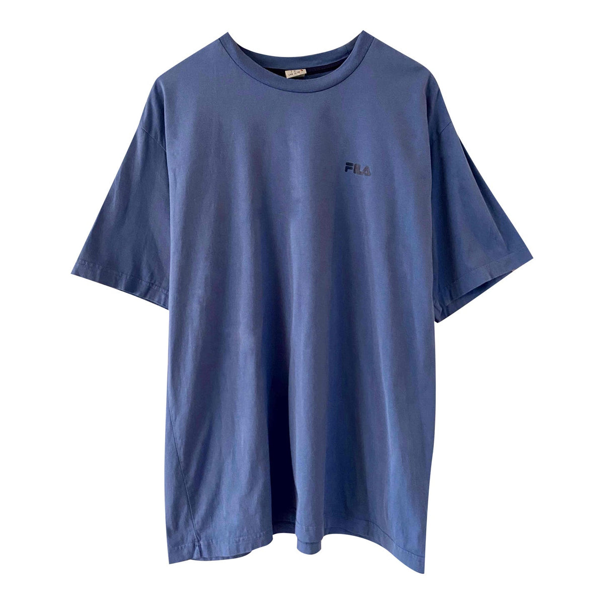Prix unitaire parTshirt Fila 90’s en coton bleu orage, logo poitrine bleu marine, fabriqué en Turquie, taille 38 au 42, porté ici sur une personne T40.
