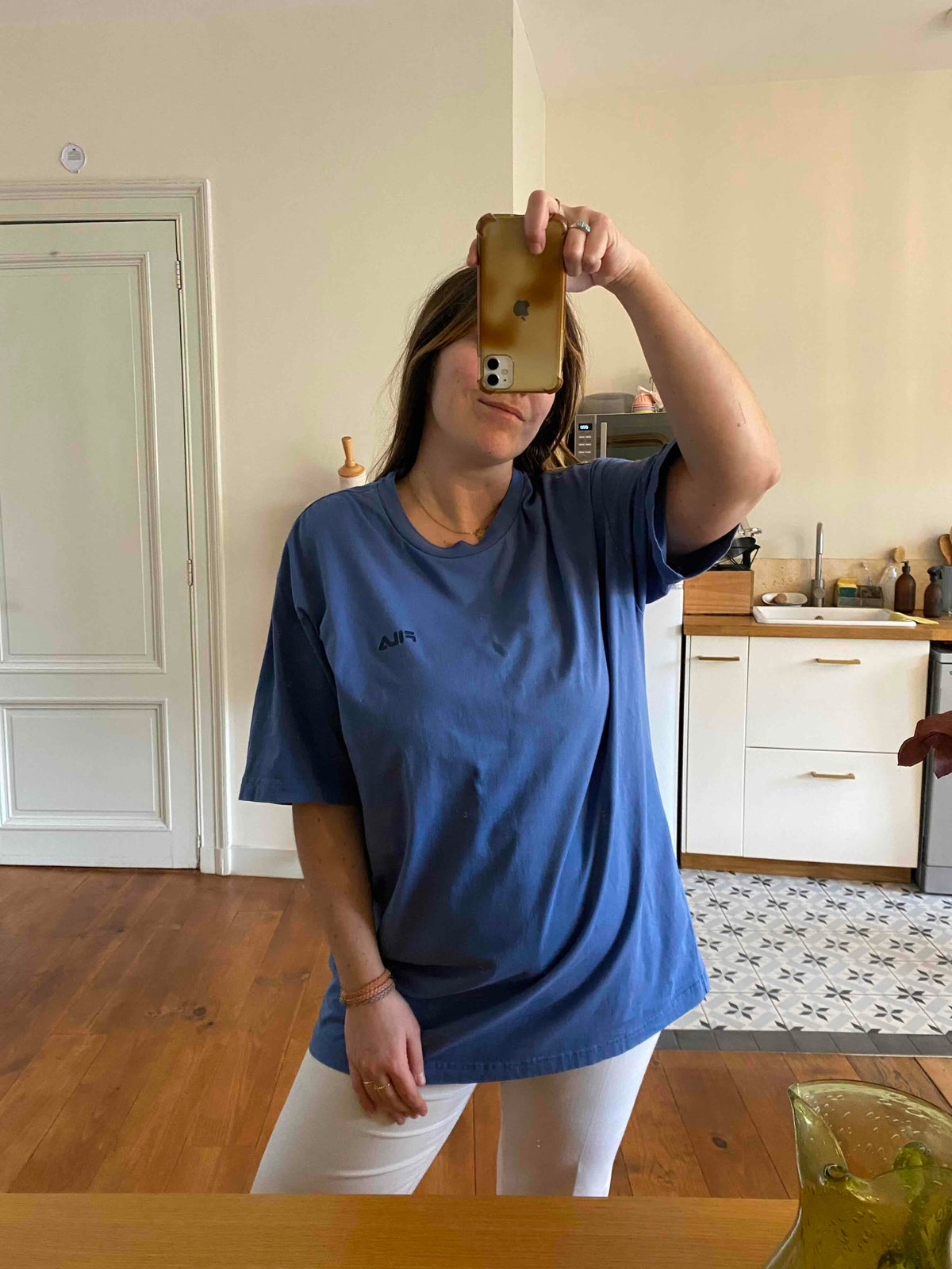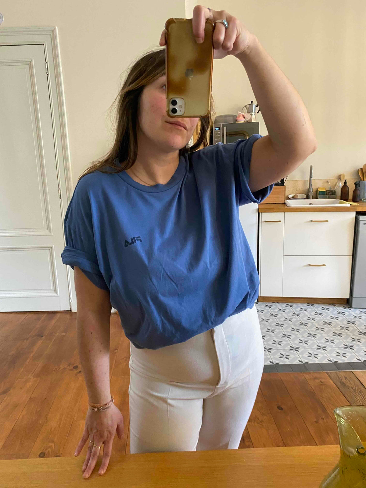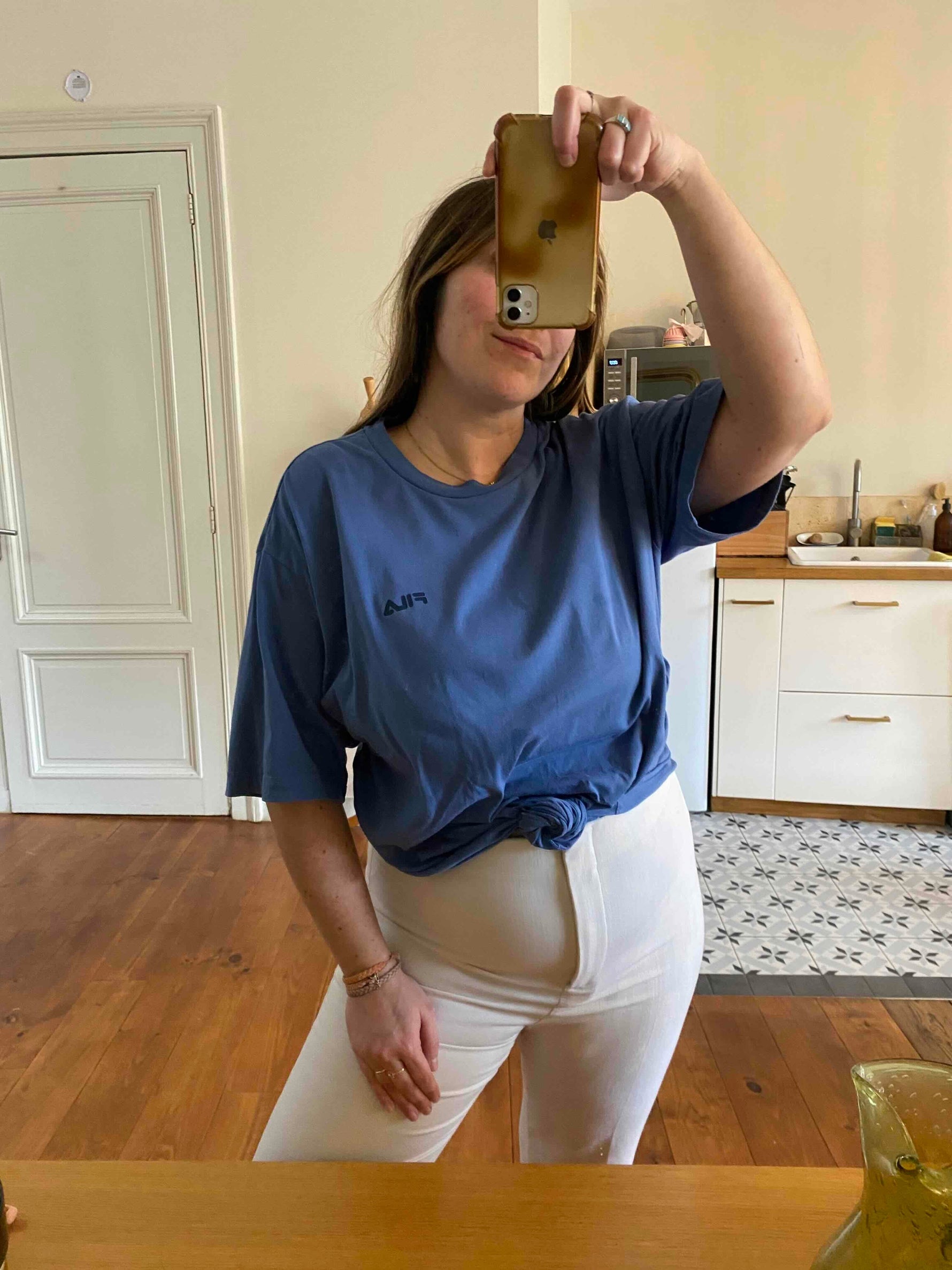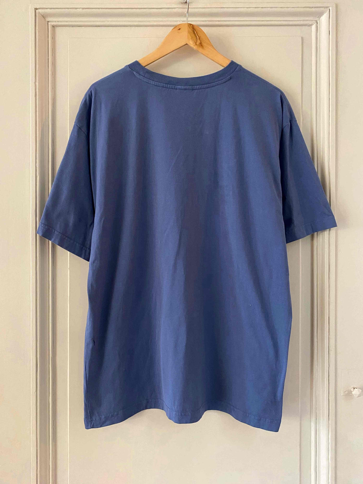 Prix unitaire parTshirt Fila 90’s en coton bleu orage, logo poitrine bleu marine, fabriqué en Turquie, taille 38 au 42, porté ici sur une personne T40.