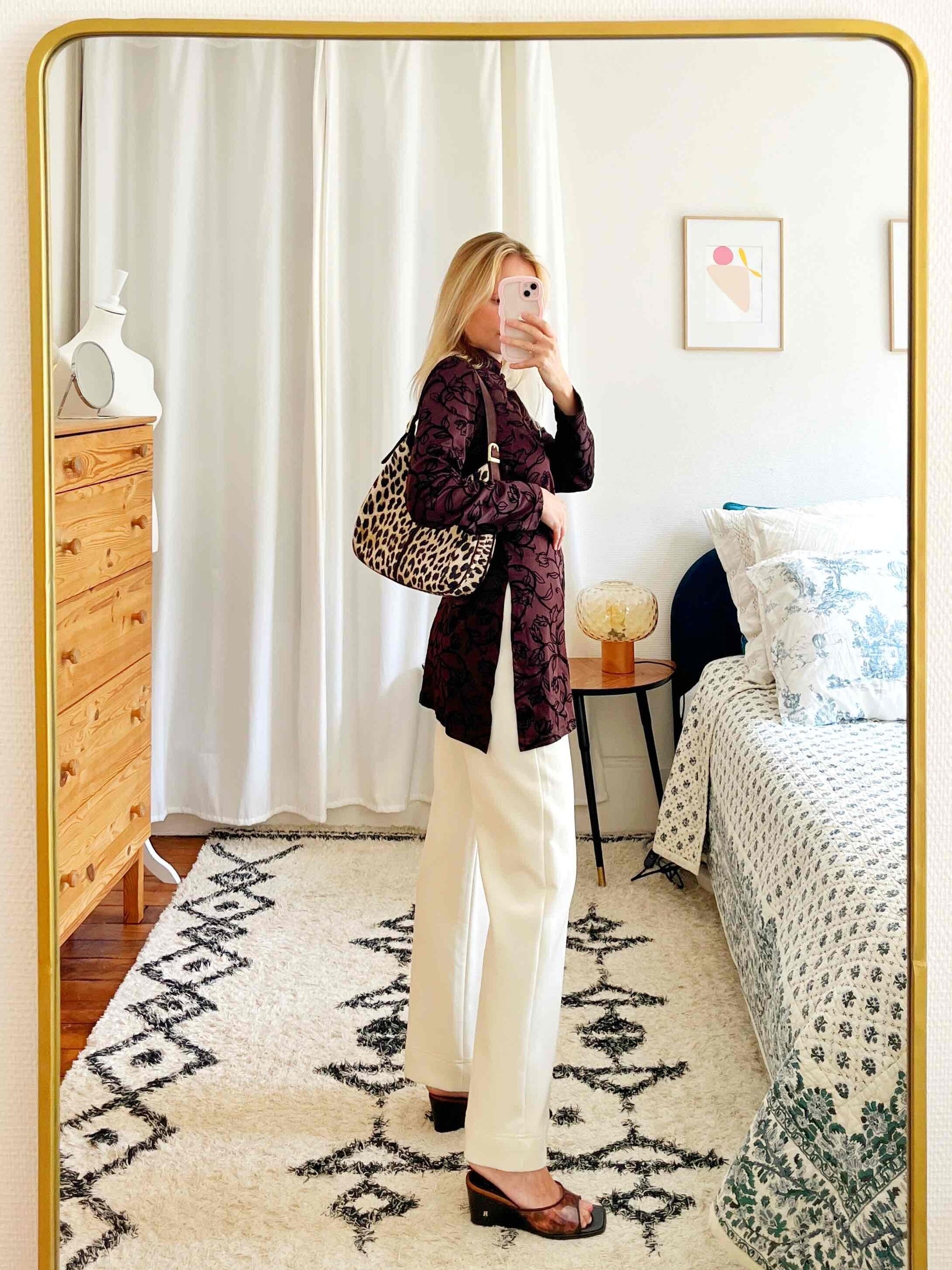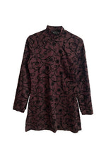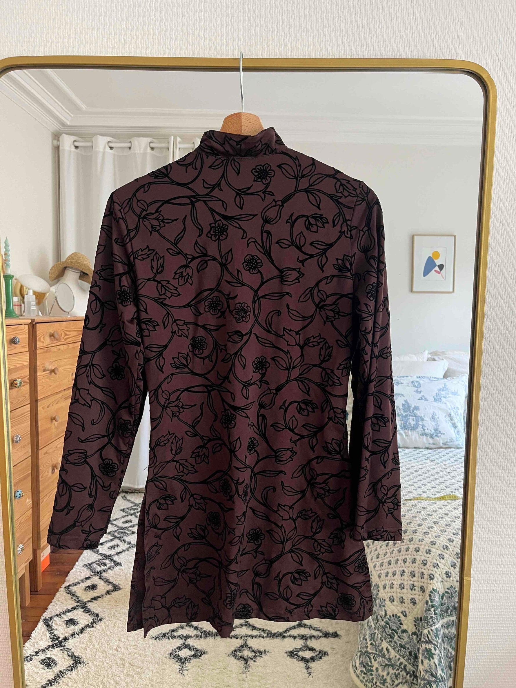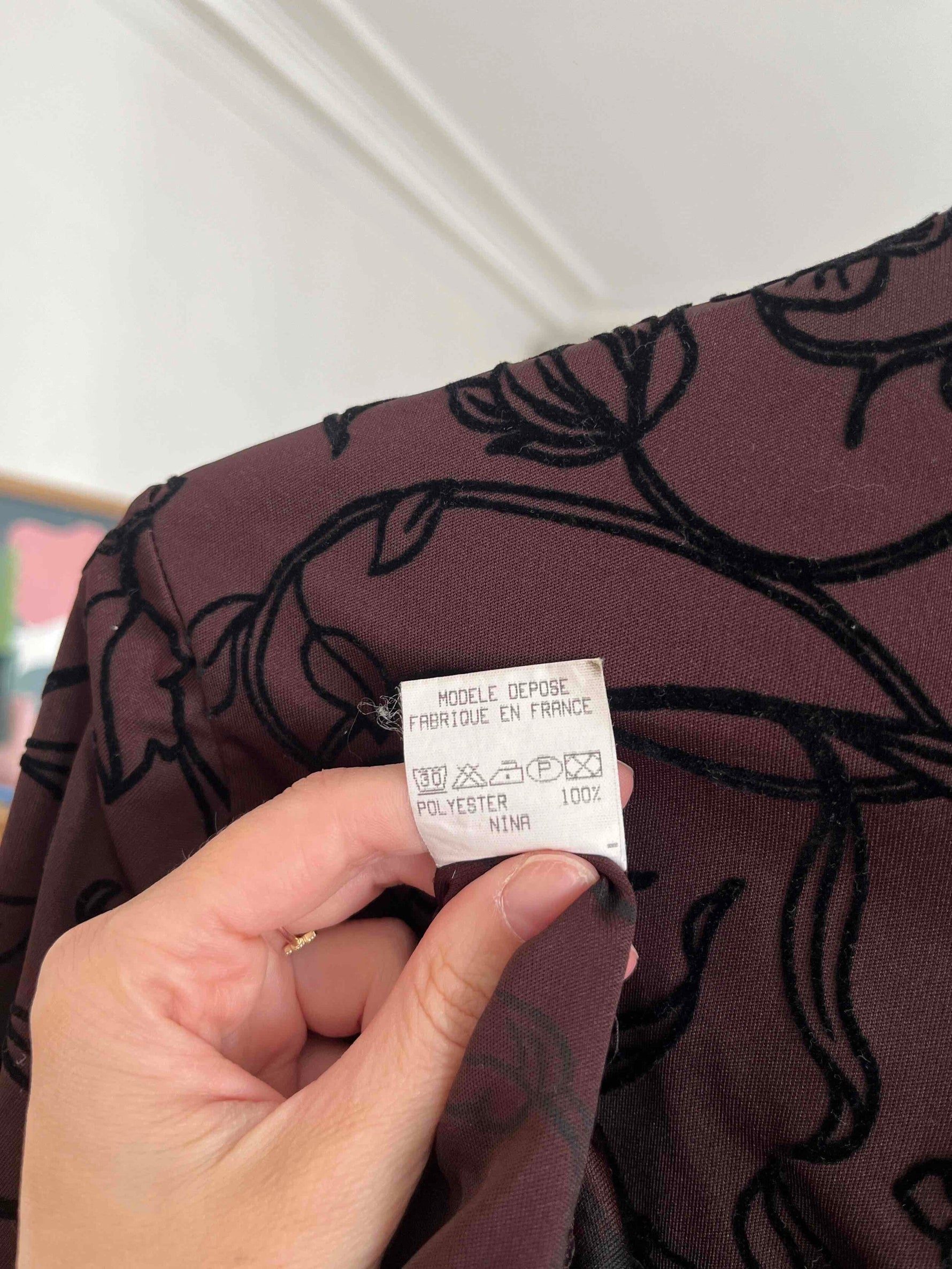 Prix unitaire parTunique marron, imprimée de fleurs en velours noir, col montant boutonné, fente des deux côtés, fabriqué en France. Portée ici sur une T36 pour 1,64 m