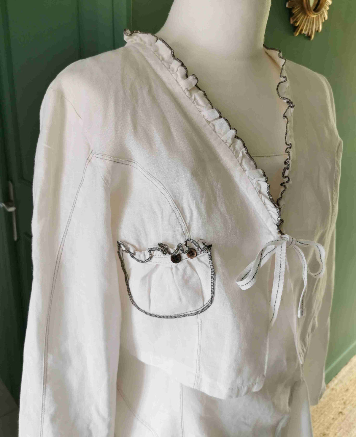 L'ensemble est en lin avec finitions en fil taupe