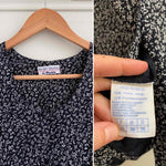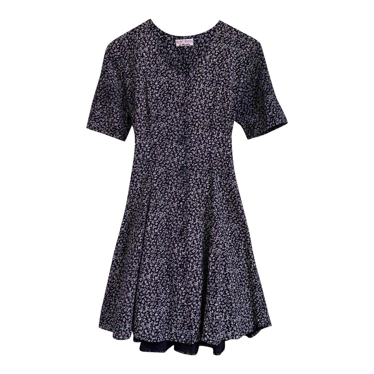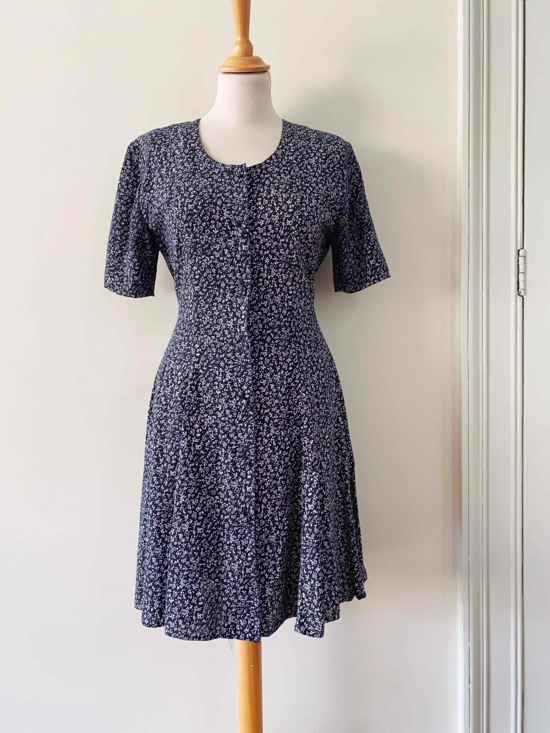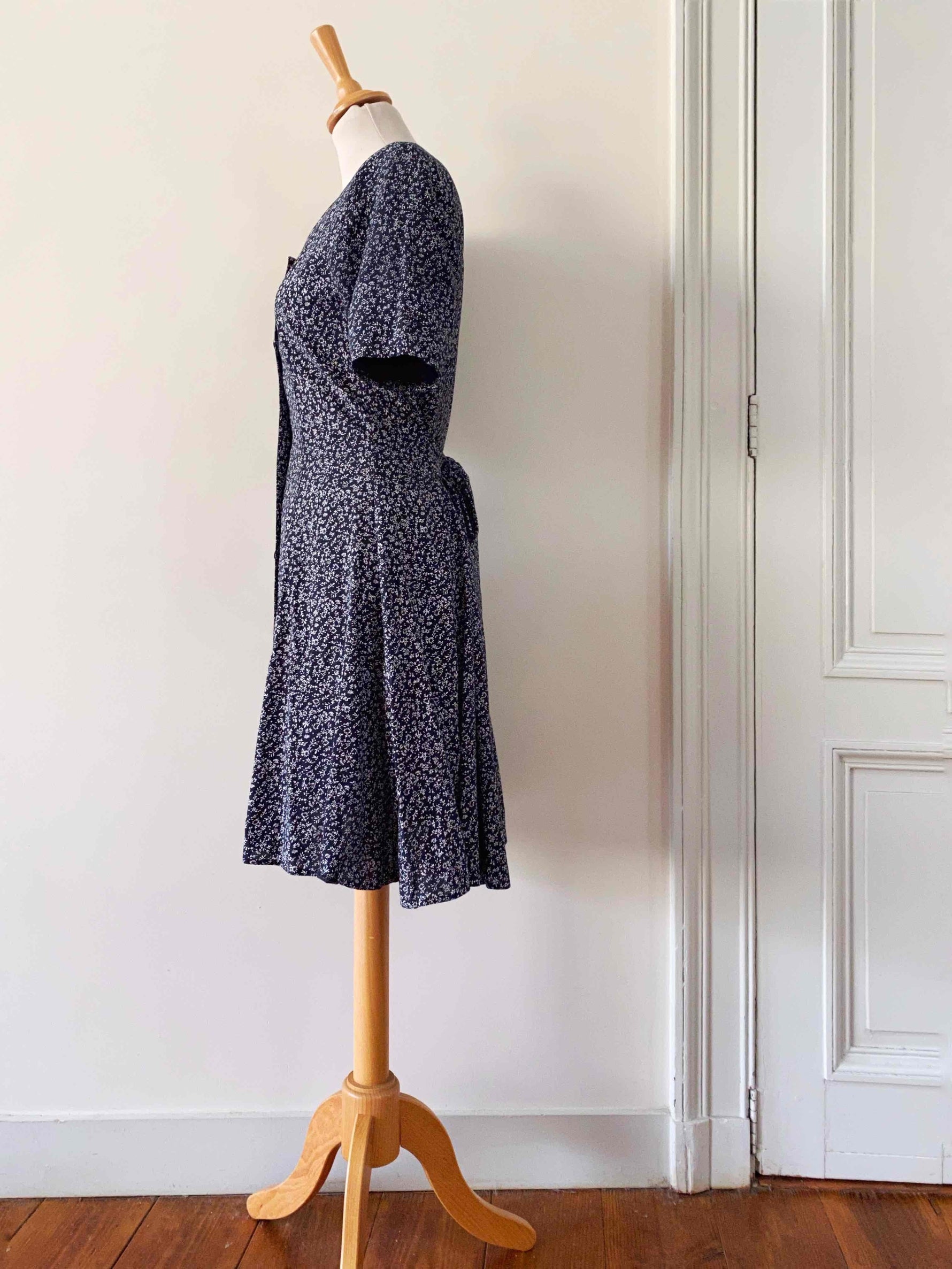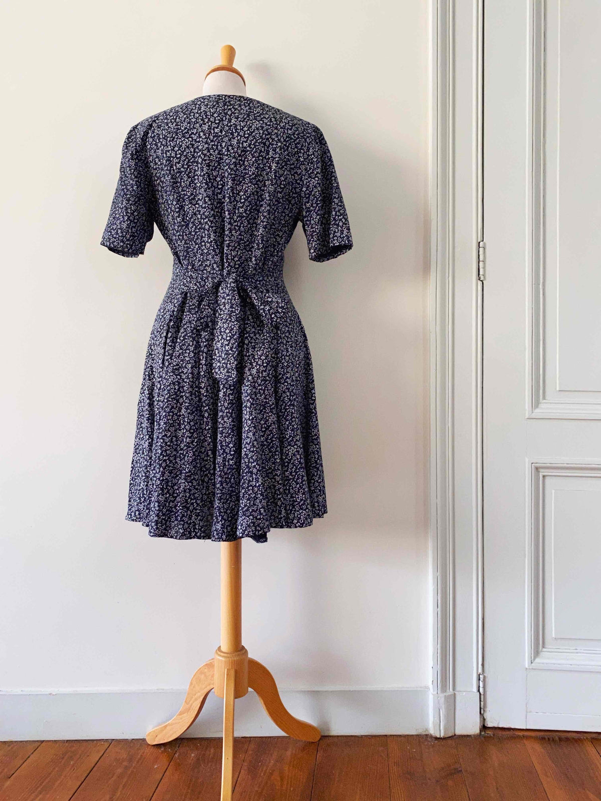 Prix unitaire parMini Robe à Fleurs en viscose noire imprimée petites fleurs blanches, boutons recouverts, ceinture large à nouer dos, taille 36 portée ici sur un mannequin T36, aisselles 46cm.