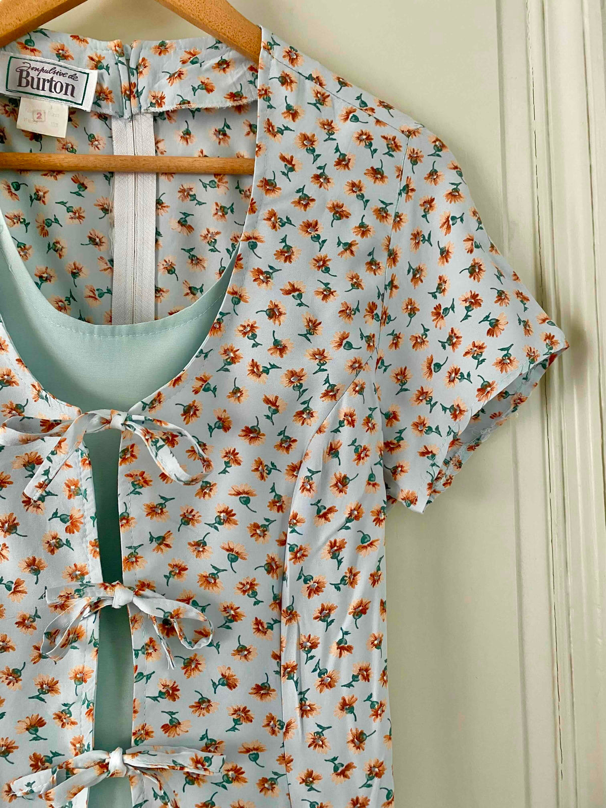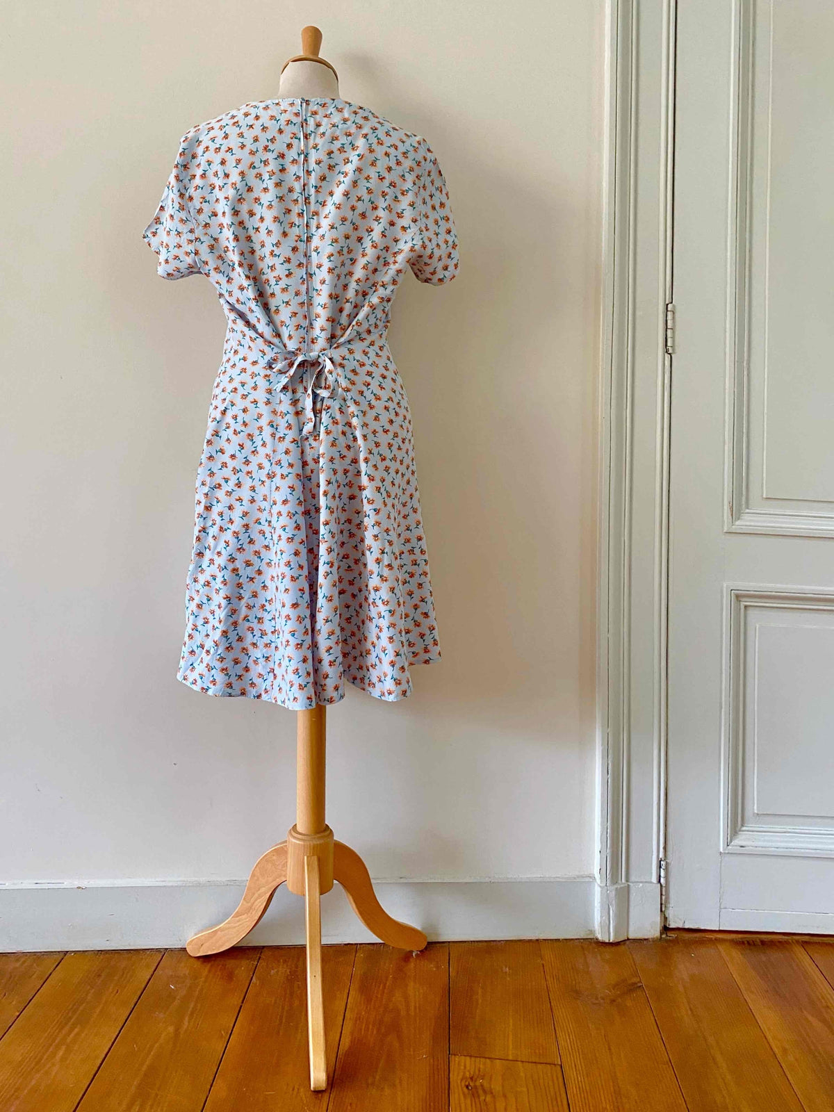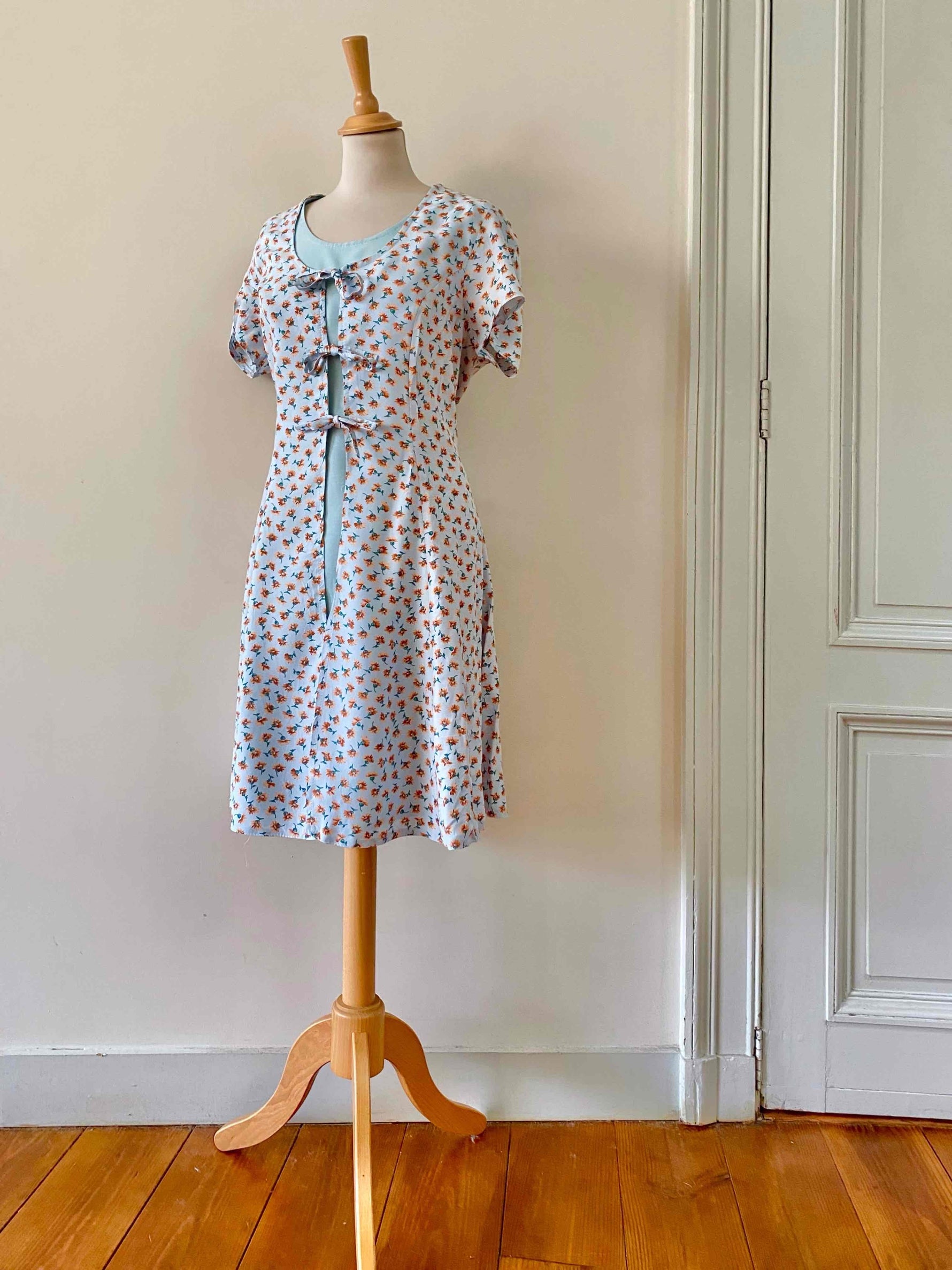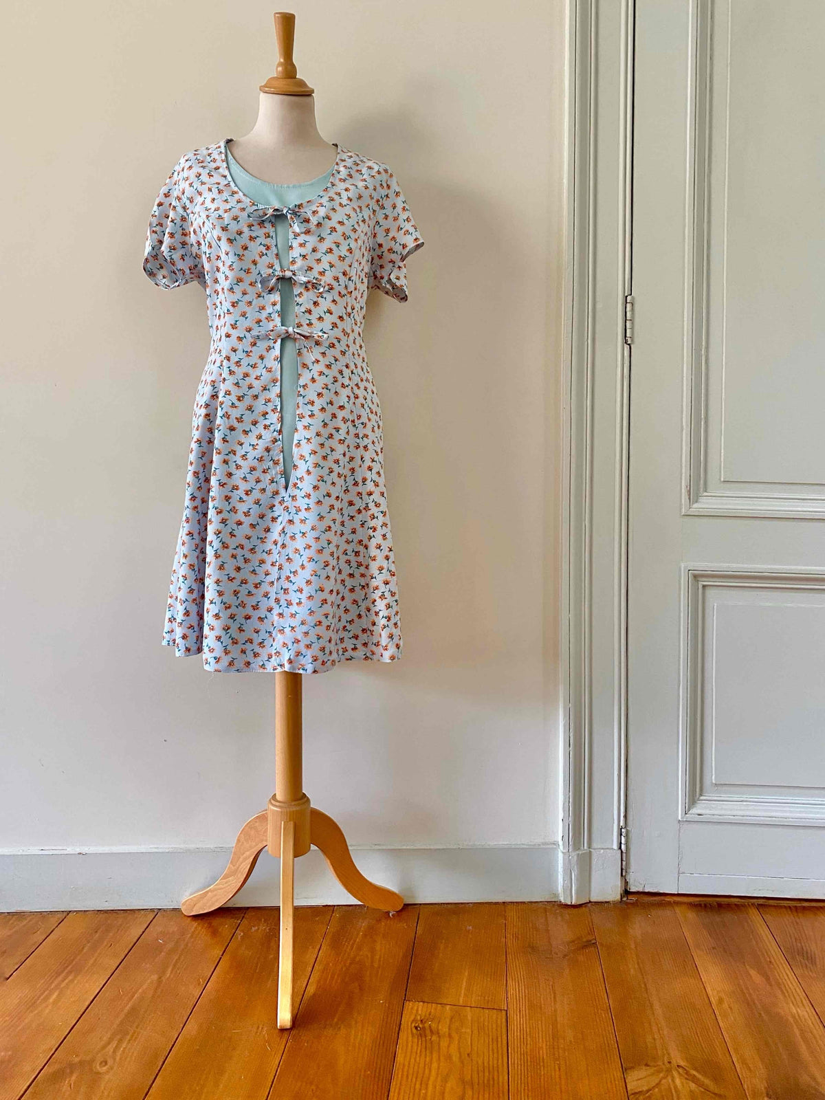 Prix unitaire parMini robe à fleurs en viscose bleue ciel imprimée petites fleurs roses orangées, devant à nouer par 3 petit liens effet 2 en 1, dos à nouer et fermeture éclaire, fabriquée en France, taille 36 et 38 portée ici sur un mannequin T36, aisselles 46cm.