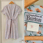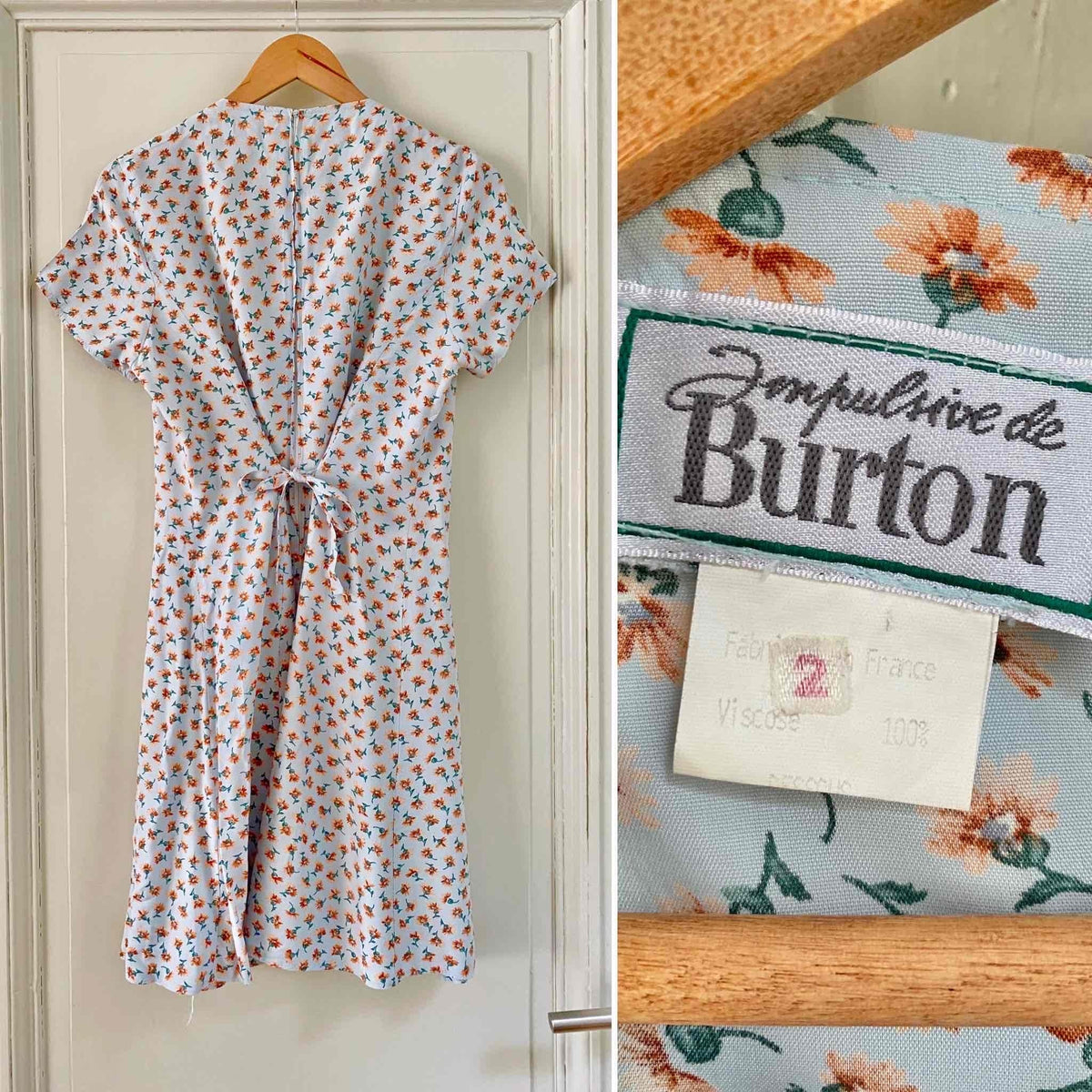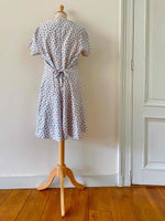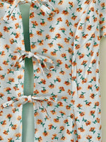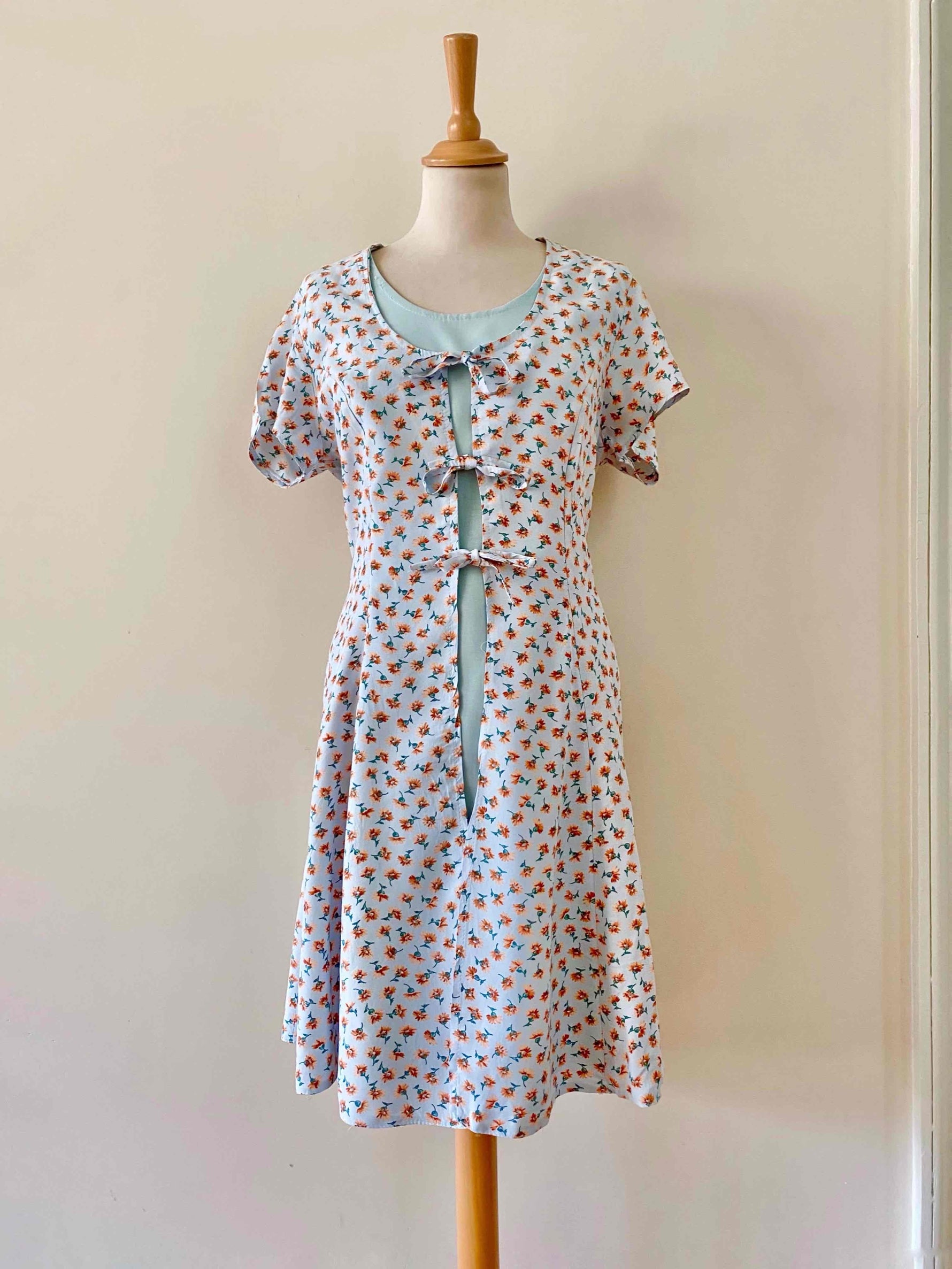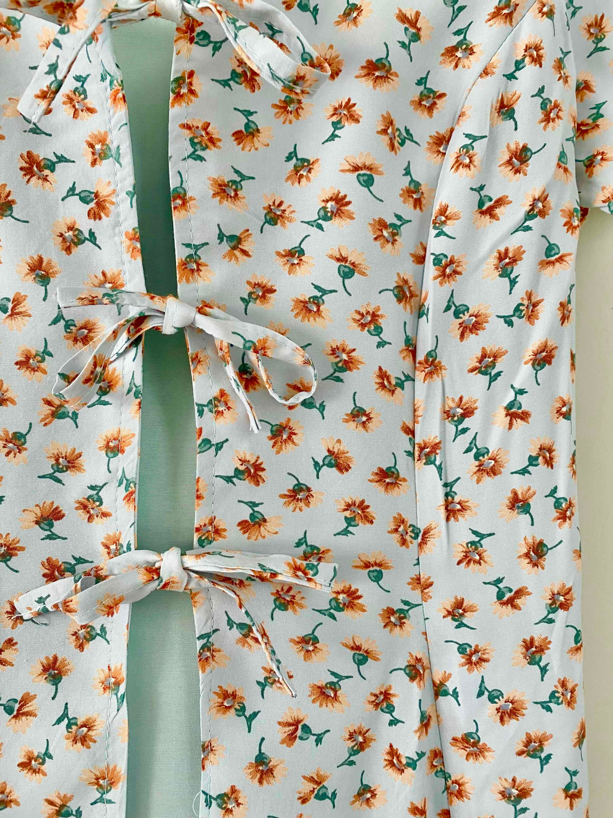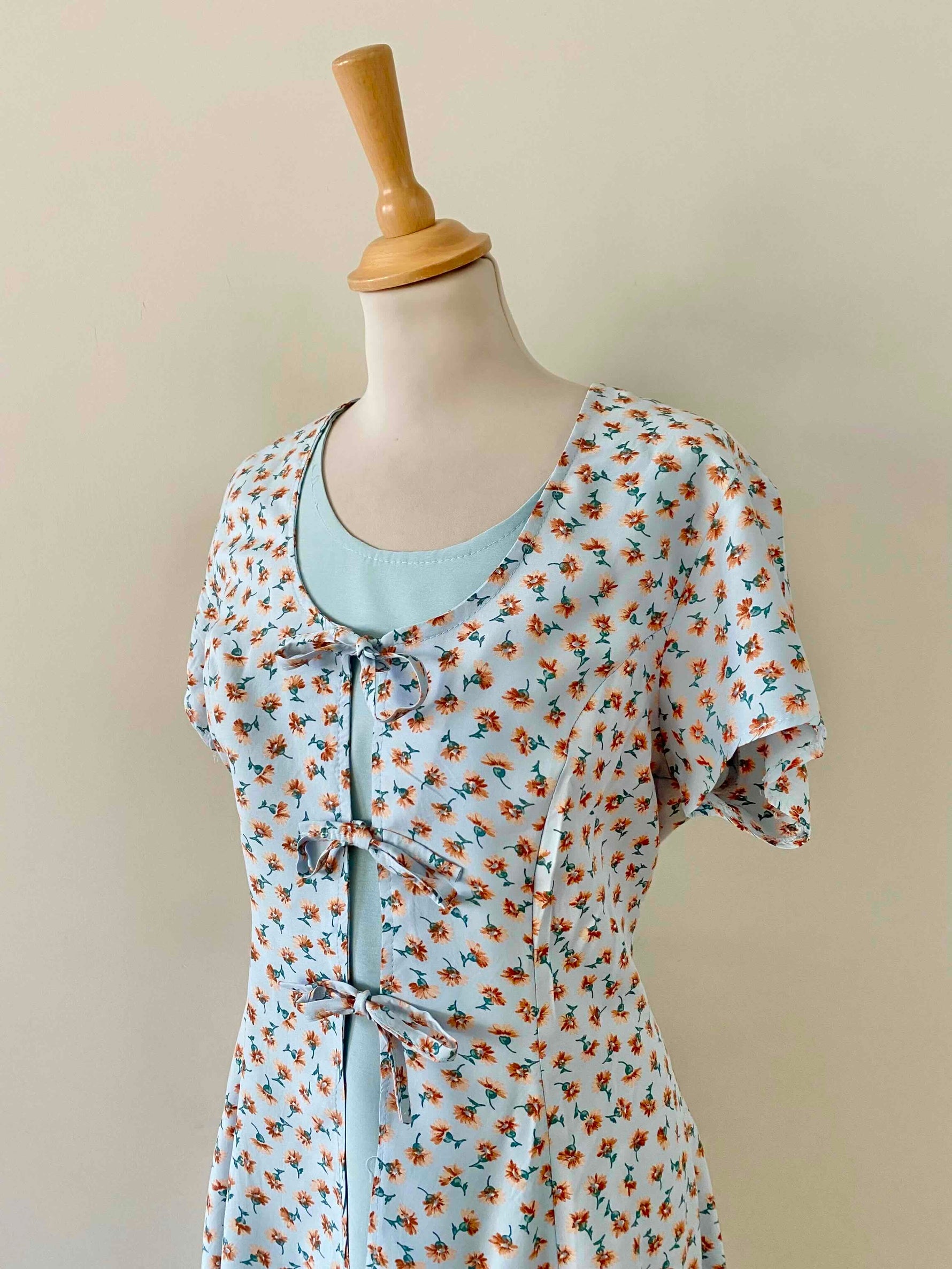 Prix unitaire parMini robe à fleurs en viscose bleue ciel imprimée petites fleurs roses orangées, devant à nouer par 3 petit liens effet 2 en 1, dos à nouer et fermeture éclaire, fabriquée en France, taille 36 et 38 portée ici sur un mannequin T36, aisselles 46cm.