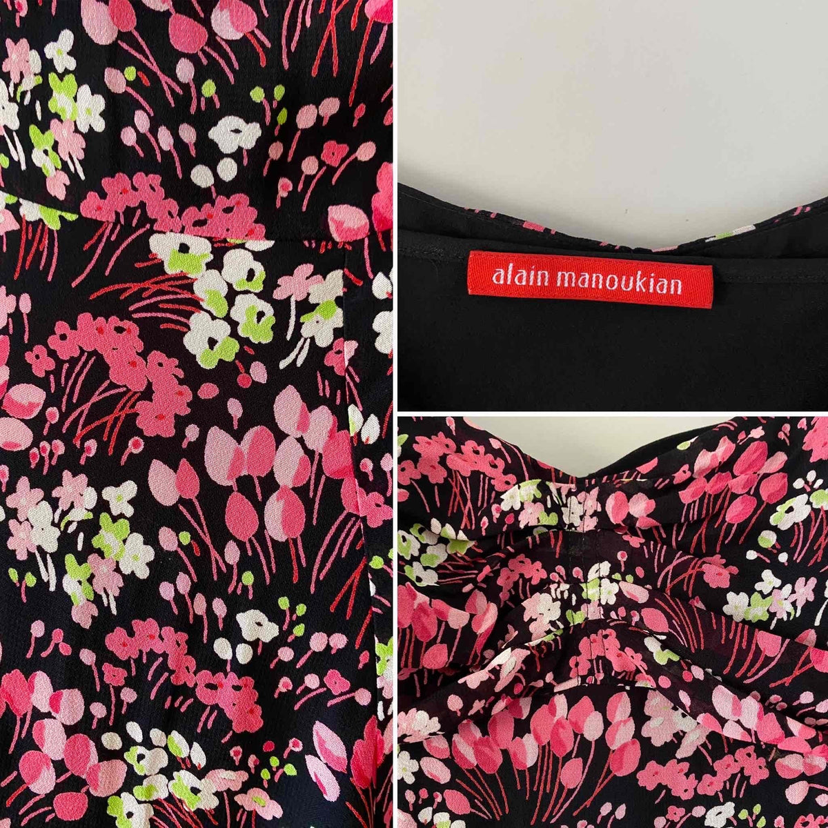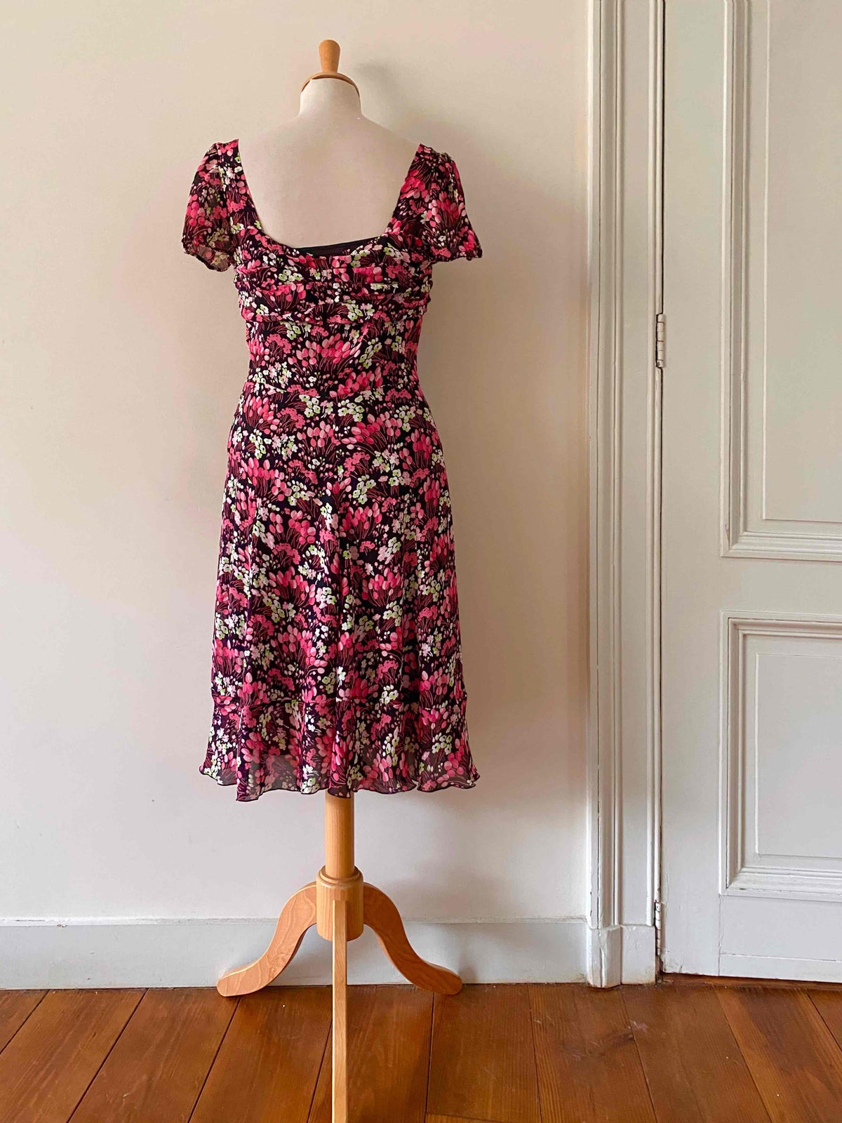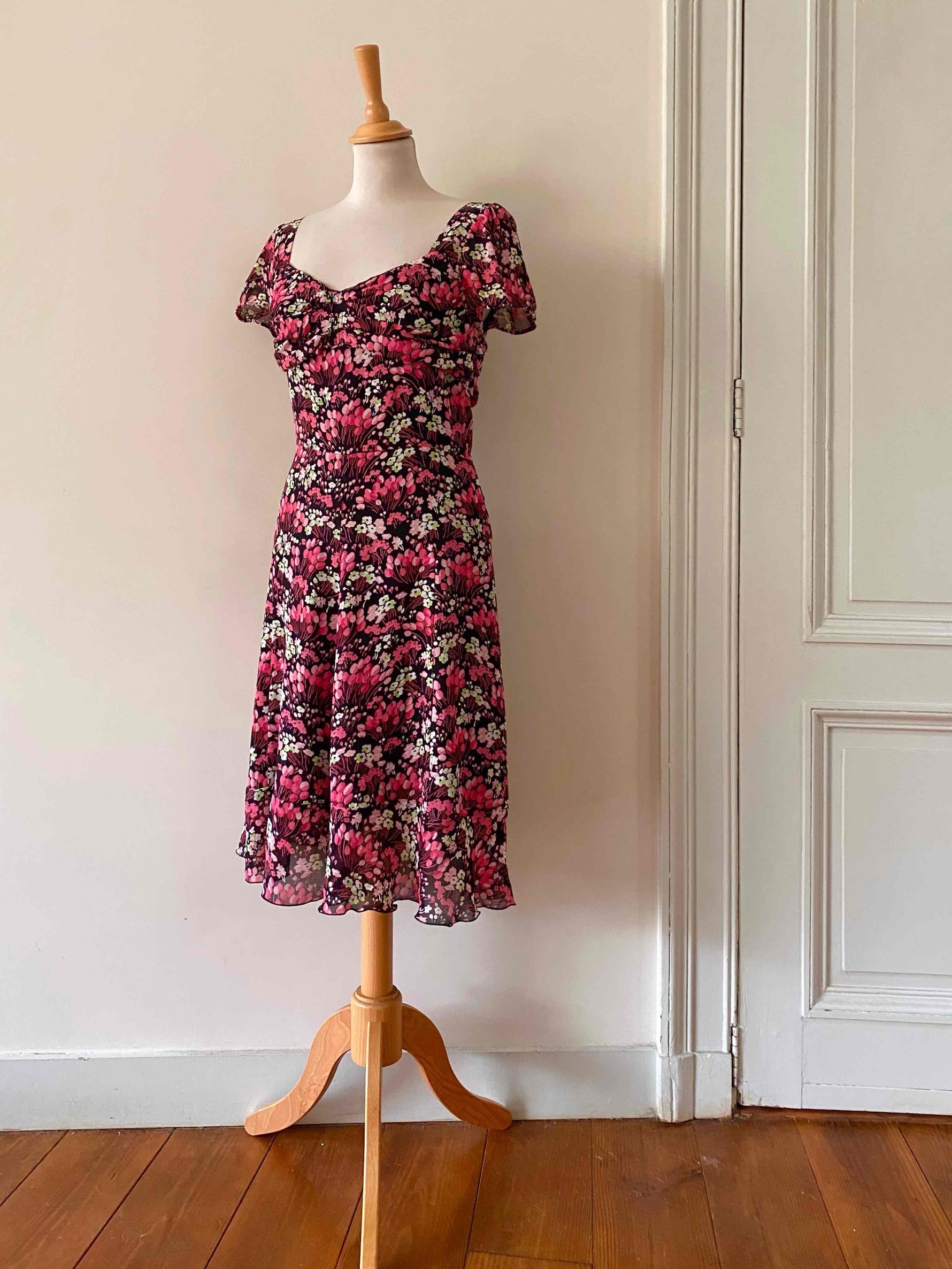 Prix unitaire parMini robe à fleurs en voile viscose noire imprimée petites fleurs roses fuschias et vert anis, doublée par un fond de robe à bretelles réglables, poitrine cosage froncée, manches et bas volantés, fermeture éclaire sur le côté, alain manoukian y2k, taille 36 portée ici sur un mannequin T36.