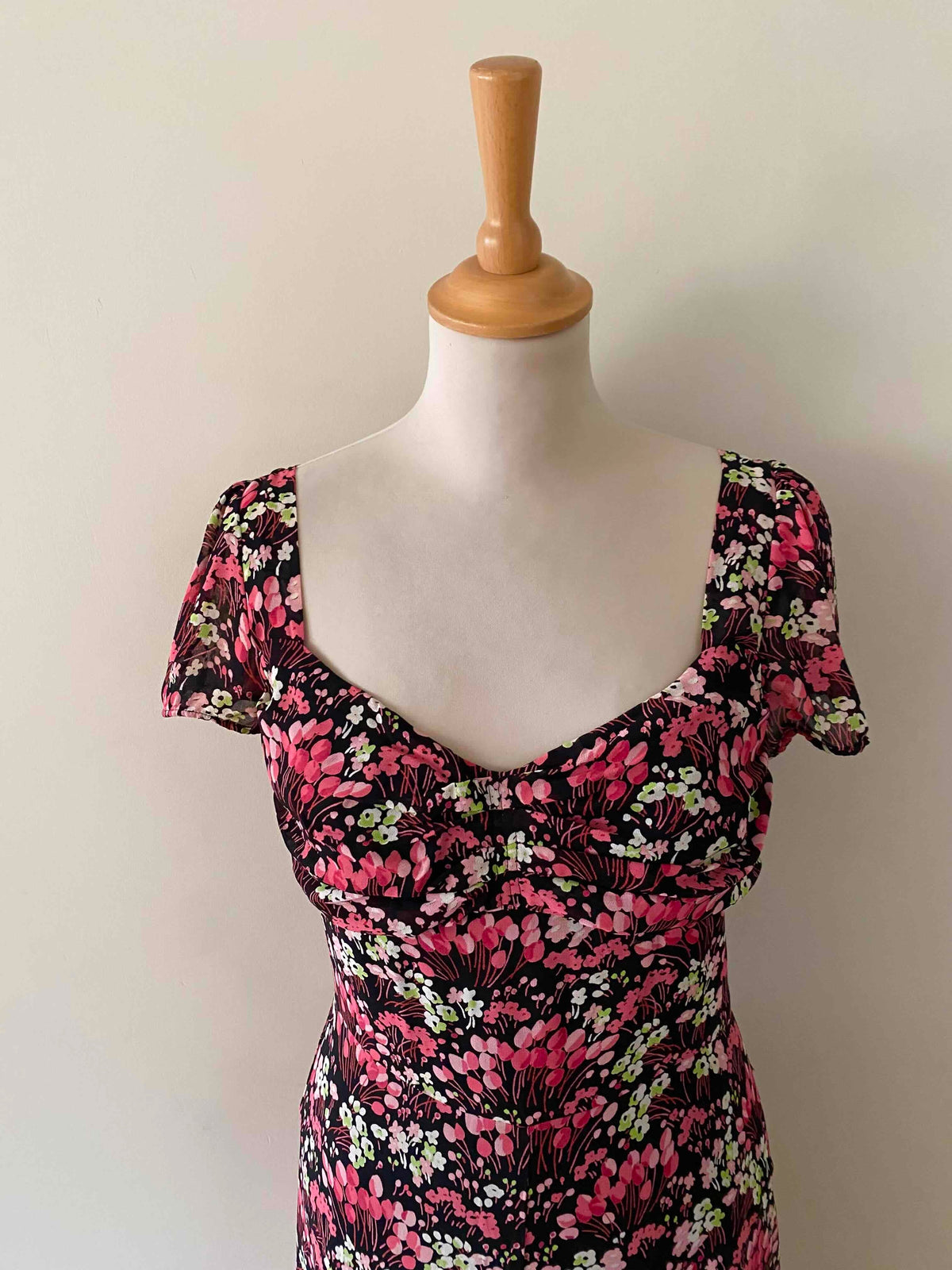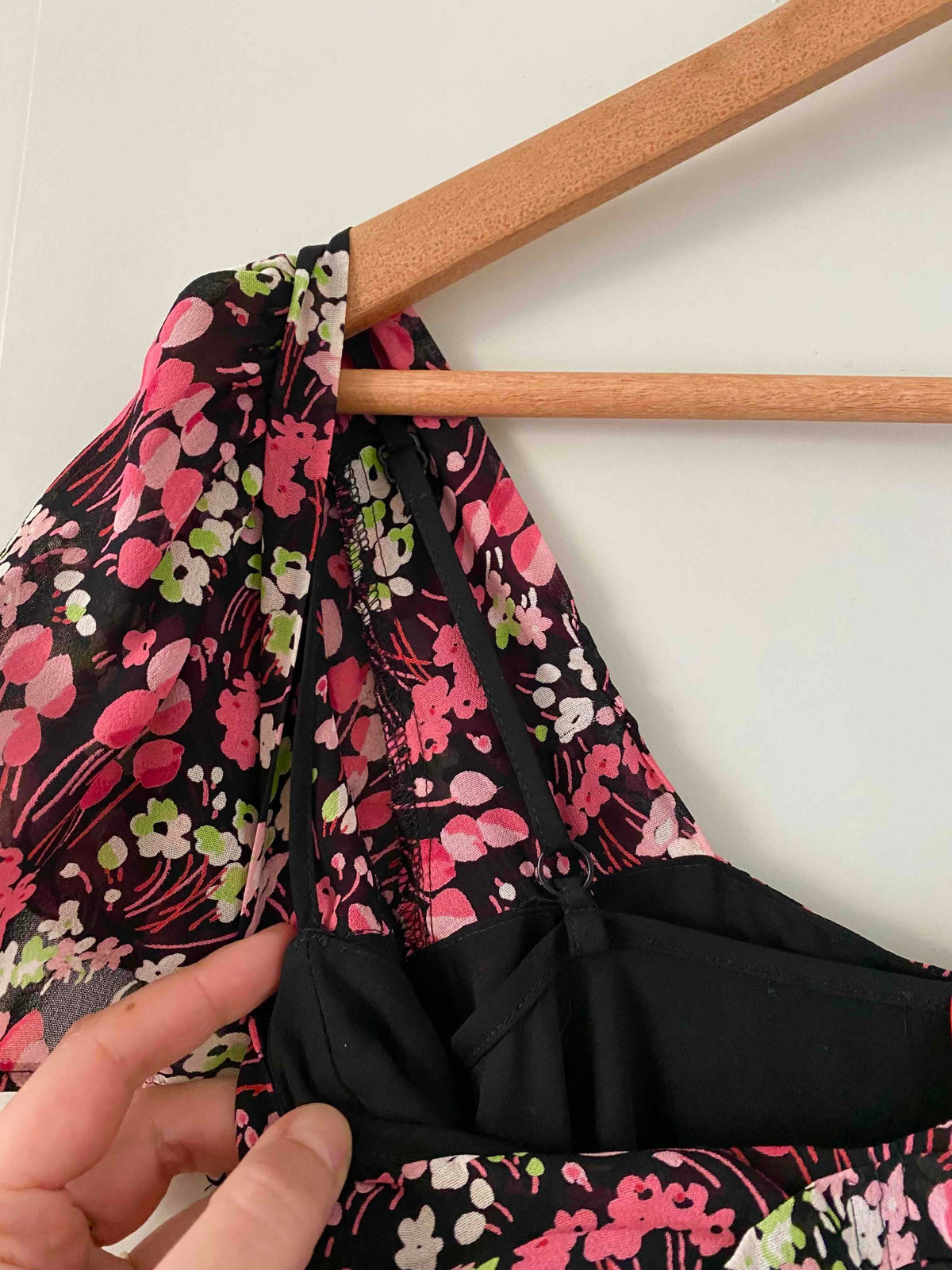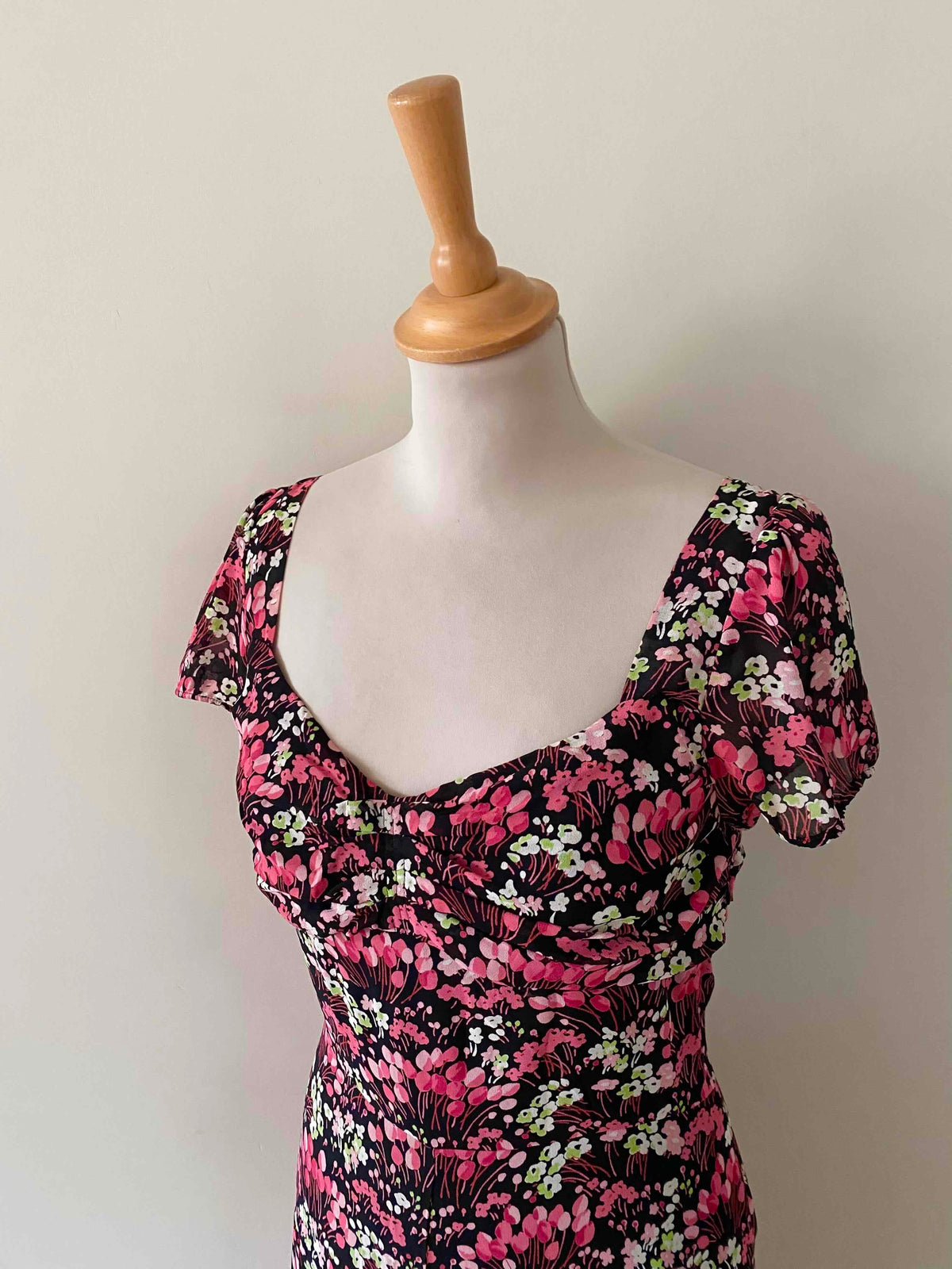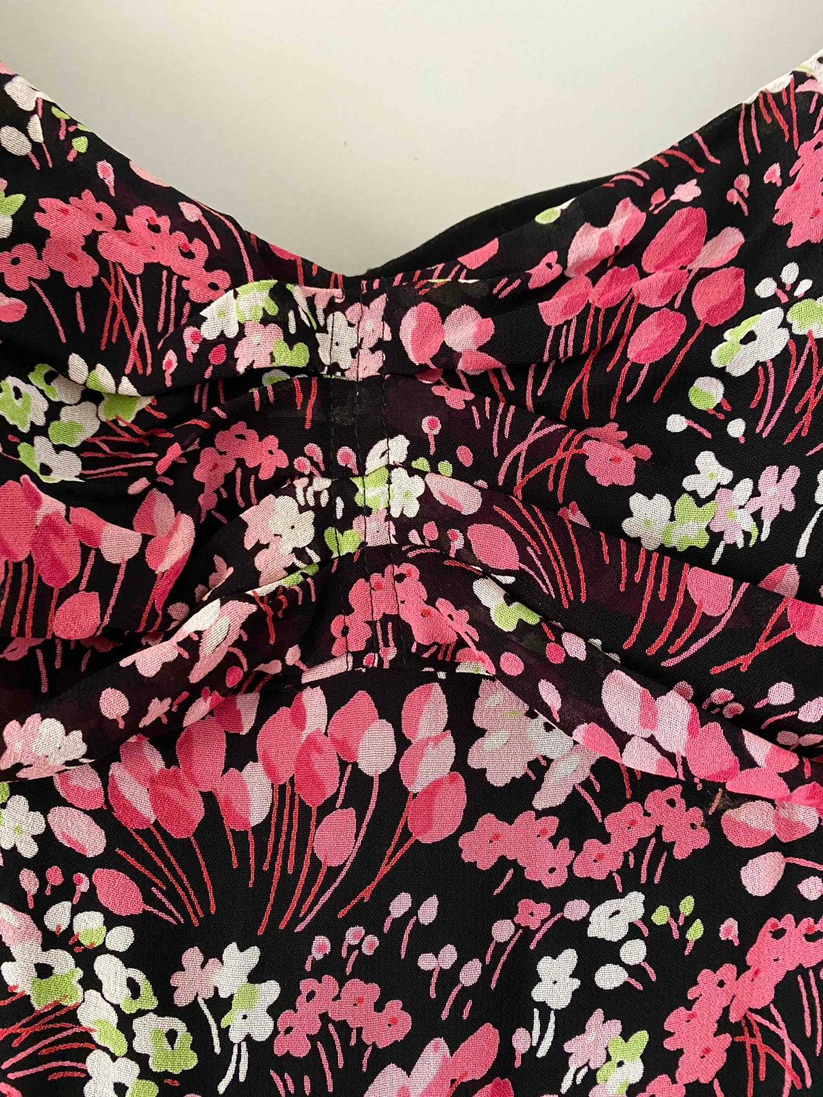 Prix unitaire parMini robe à fleurs en voile viscose noire imprimée petites fleurs roses fuschias et vert anis, doublée par un fond de robe à bretelles réglables, poitrine cosage froncée, manches et bas volantés, fermeture éclaire sur le côté, alain manoukian y2k, taille 36 portée ici sur un mannequin T36.