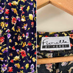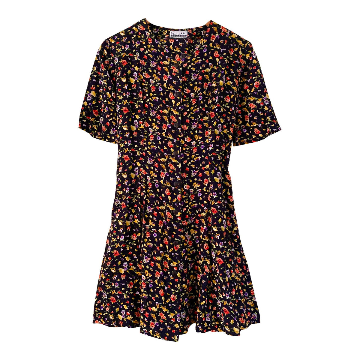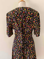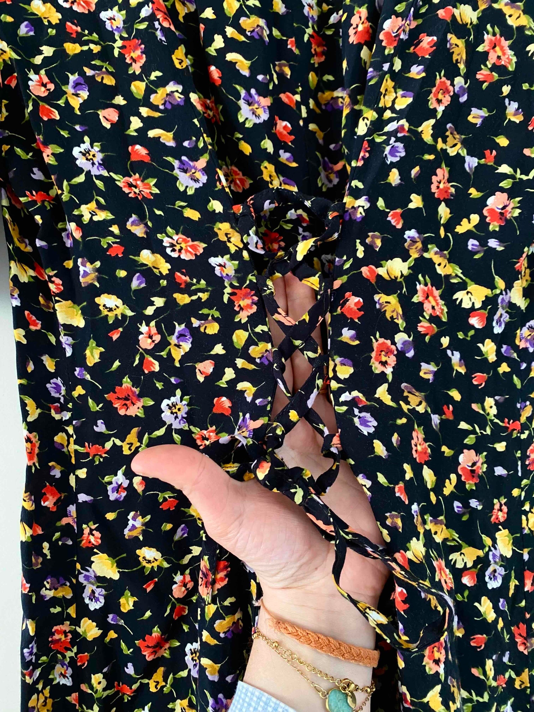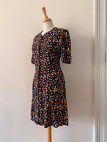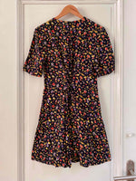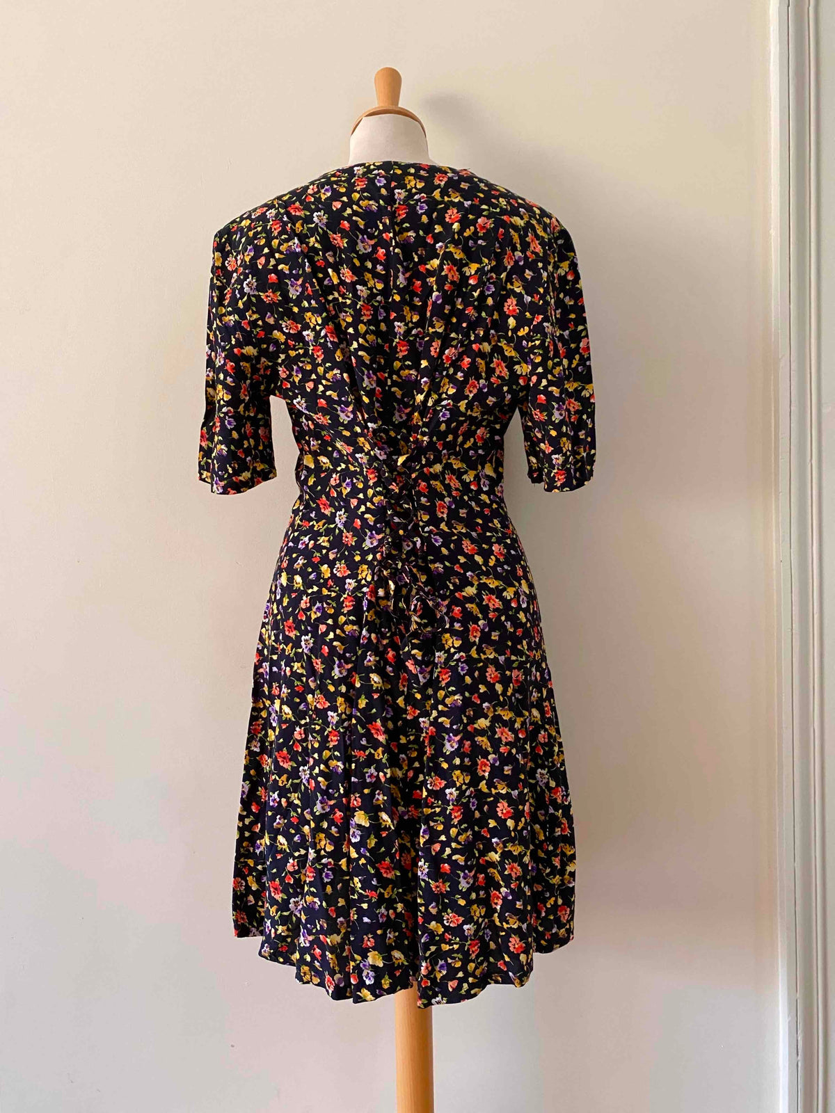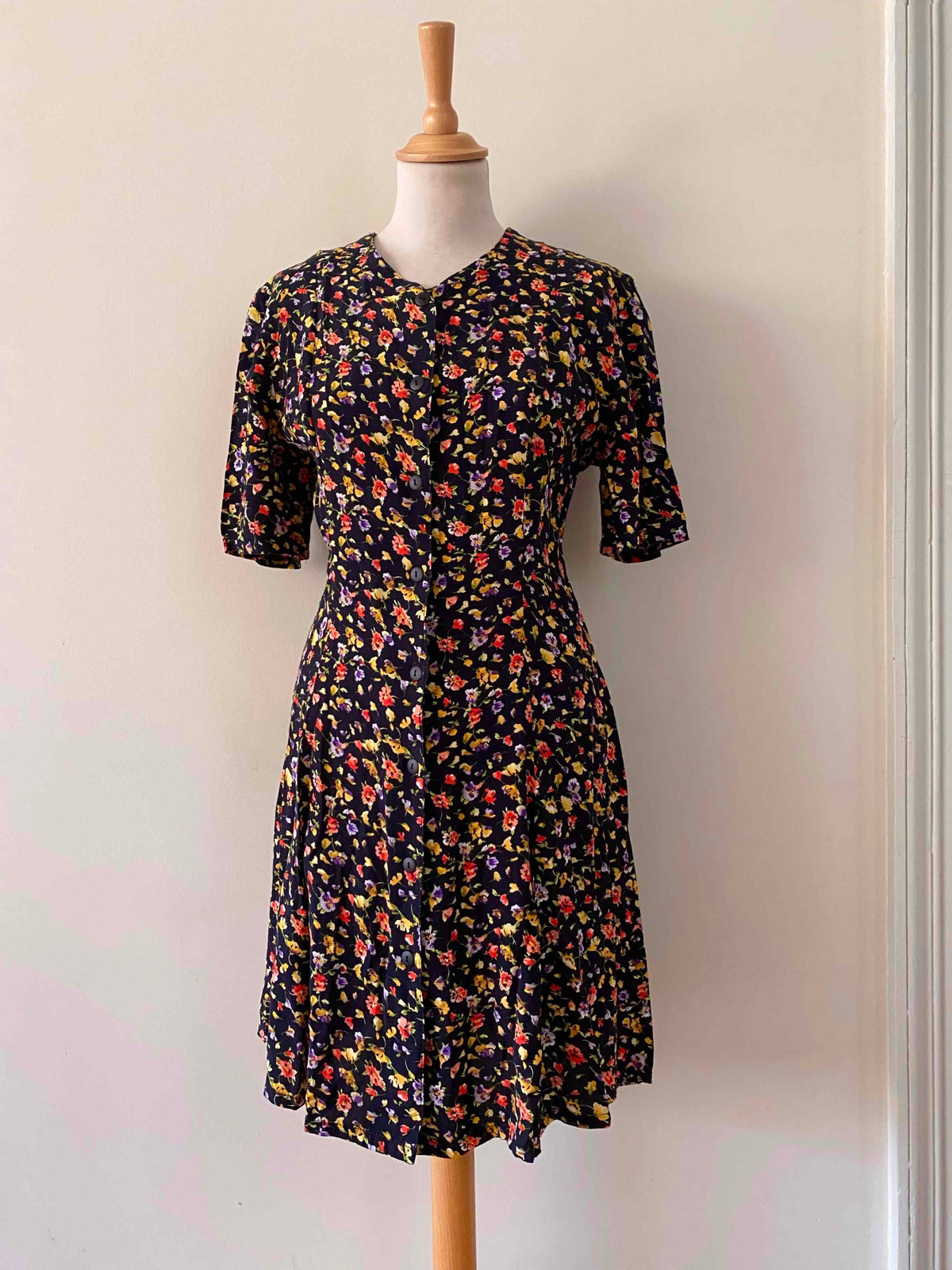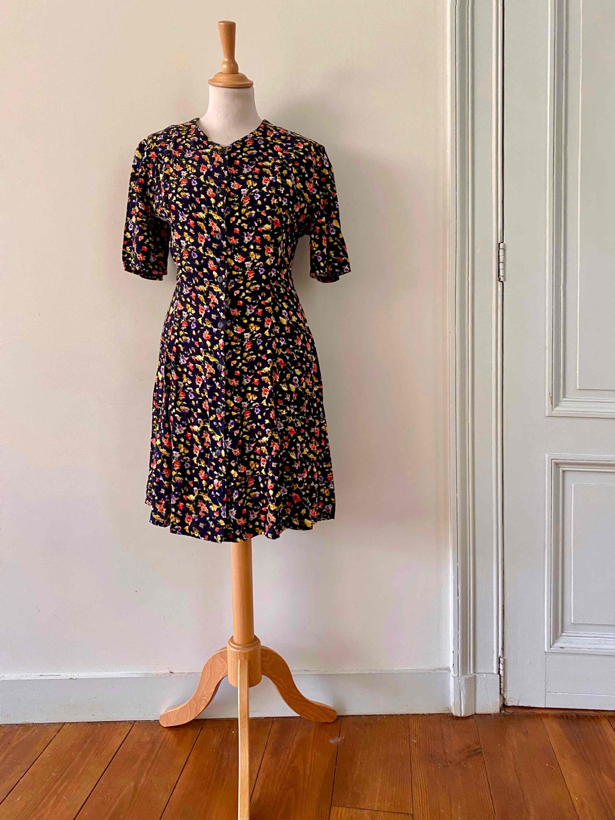 Prix unitaire parMini robe à fleurs en viscose noire imprimée fleurs multicolores lilas, violettes, jaunes et roses, dos à lacets, boutonnée, fabriquée en France, taille 36 ou petit 38 portée ici sur un mannequin T36, aisselles 46cm.