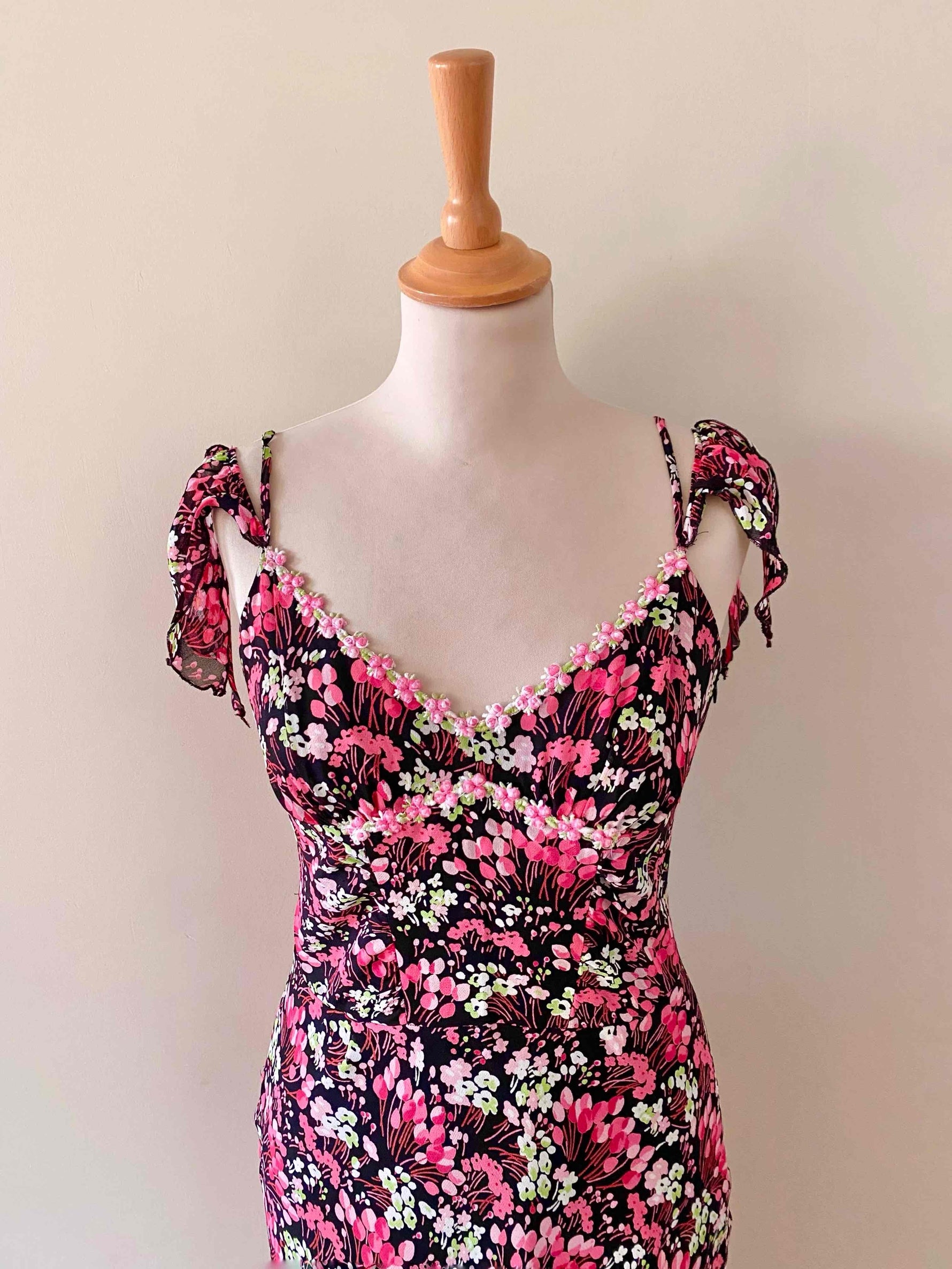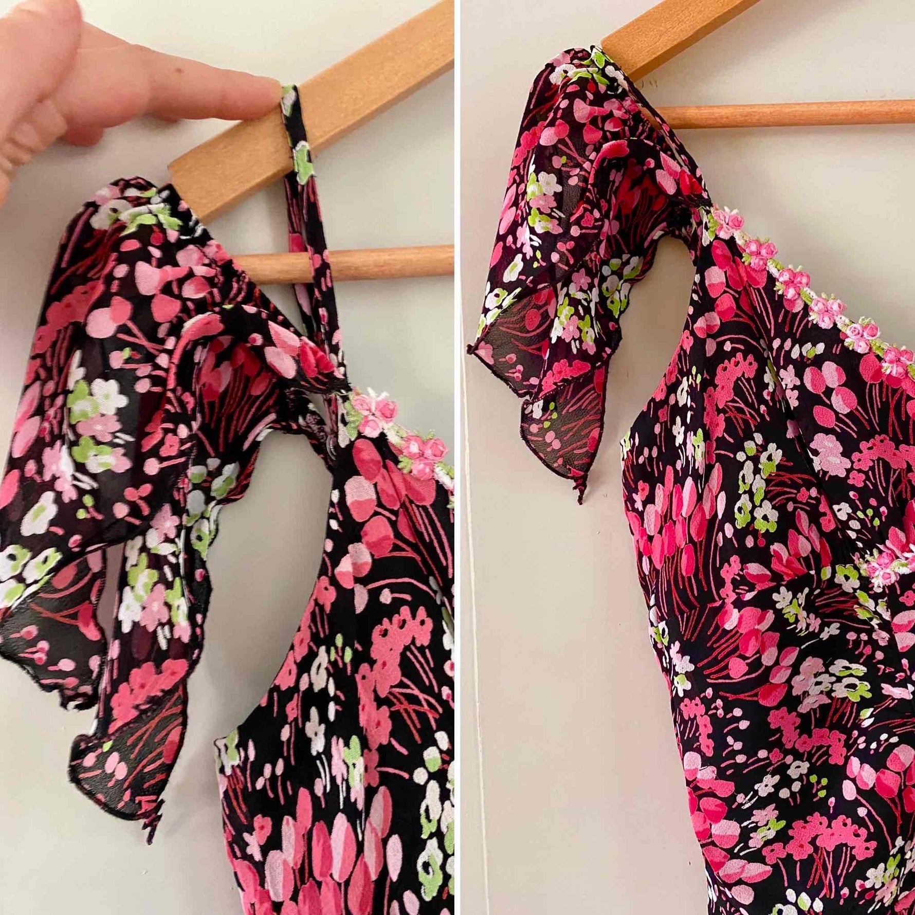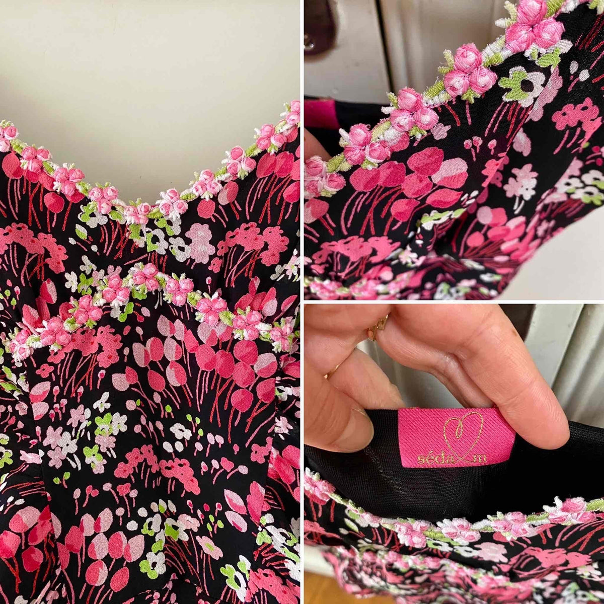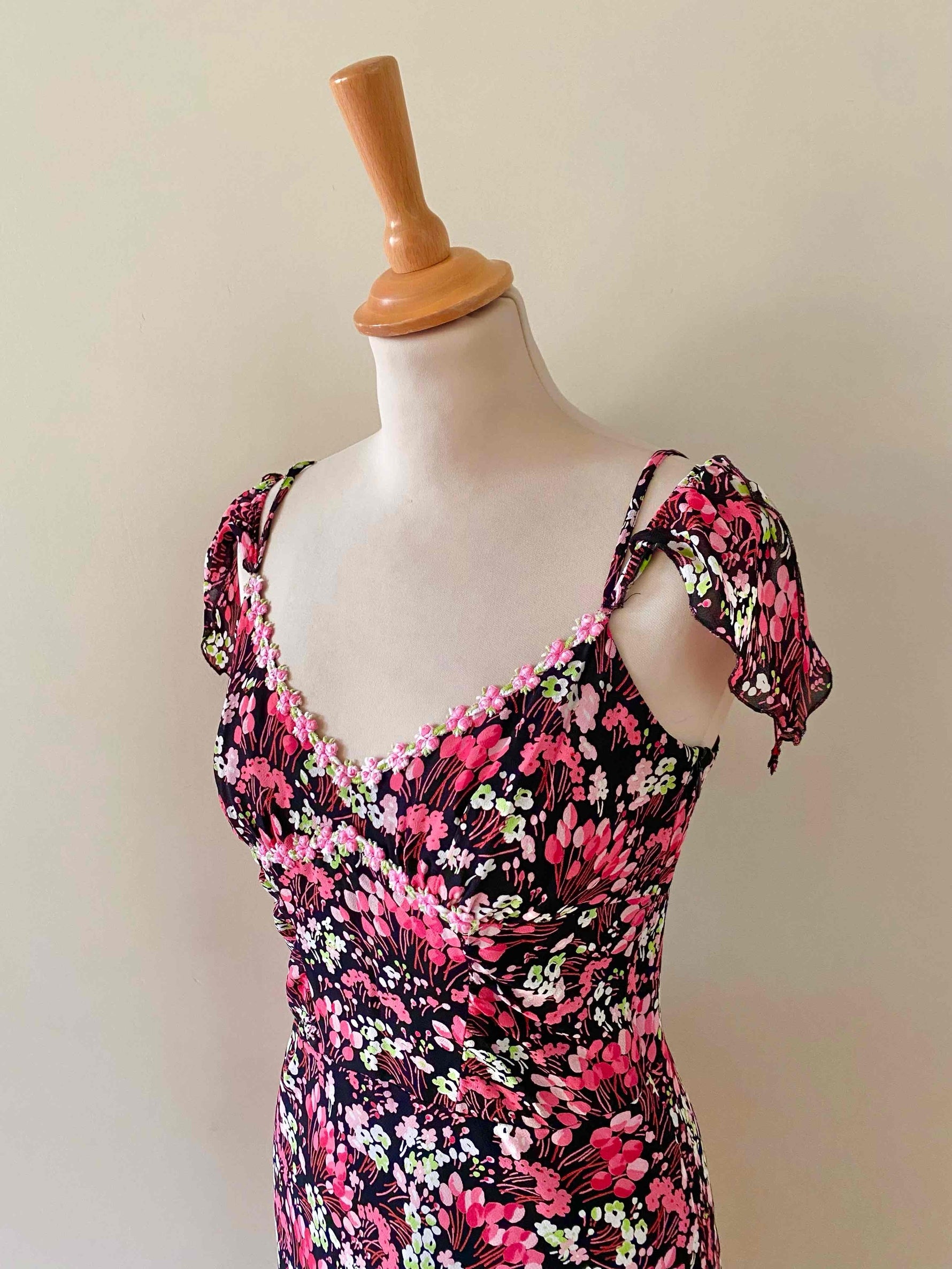 Prix unitaire parMini robe à fleurs en voile viscose noire imprimée petites fleurs roses fuschias et vert anis, doublée, poitrine froncée et brodé d’un ruban fleuri, doubles bretelles spaghettis réglables et une volantée, fermeture éclaire sur le côté, alain manoukian y2k, taille 36 portée ici sur un mannequin T36.