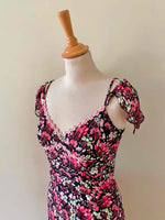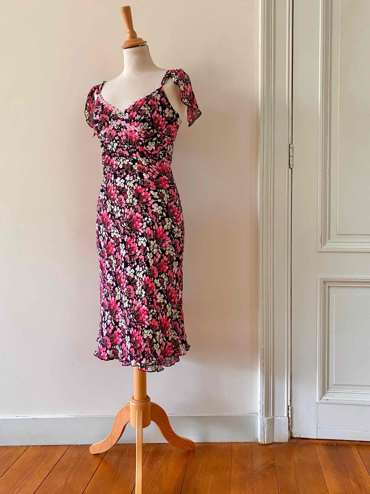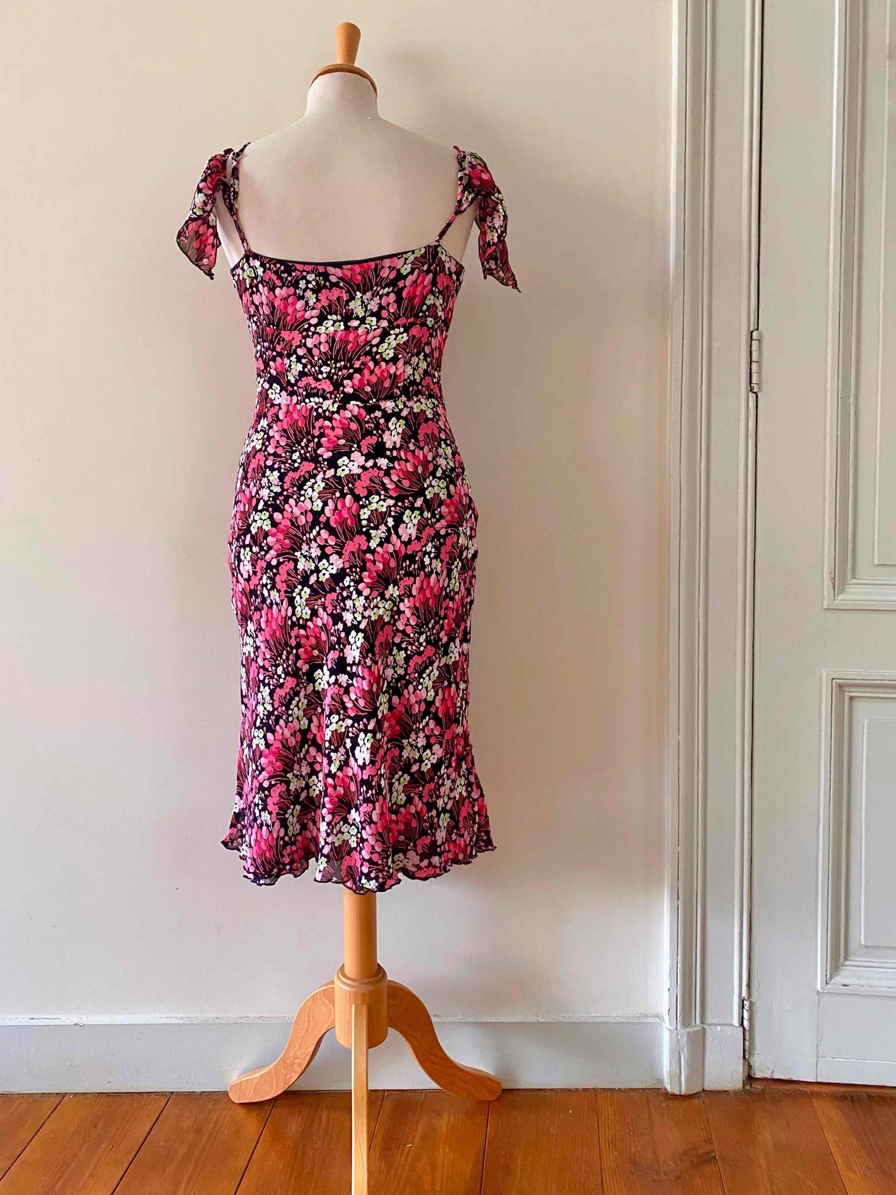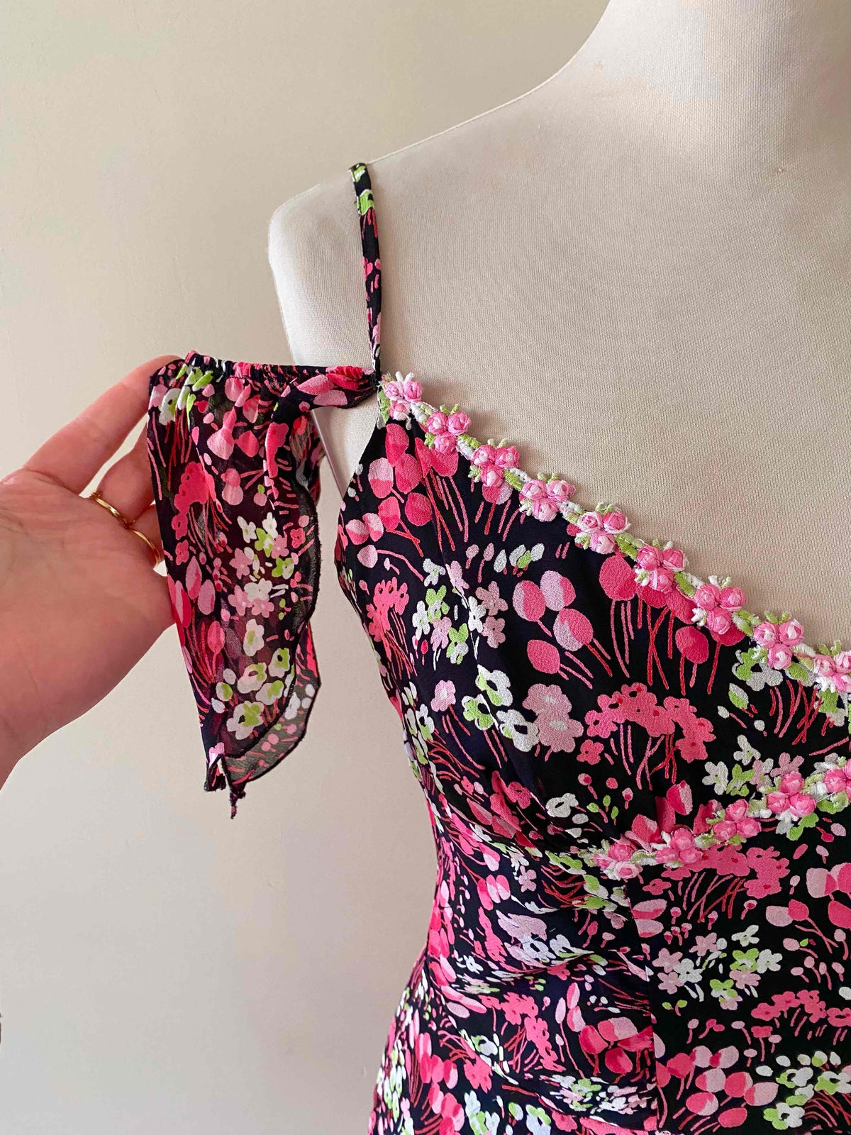 Prix unitaire parMini robe à fleurs en voile viscose noire imprimée petites fleurs roses fuschias et vert anis, doublée, poitrine froncée et brodé d’un ruban fleuri, doubles bretelles spaghettis réglables et une volantée, fermeture éclaire sur le côté, alain manoukian y2k, taille 36 portée ici sur un mannequin T36.