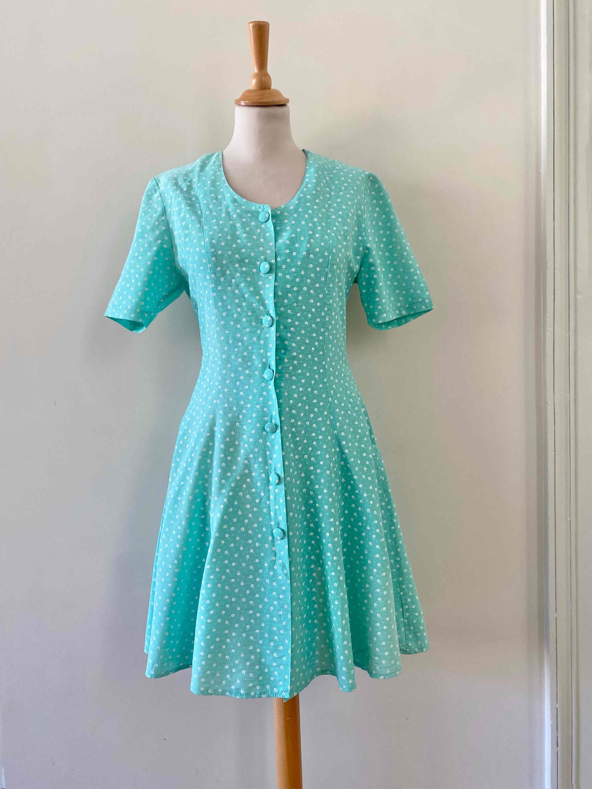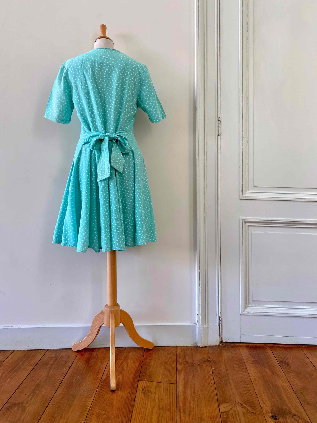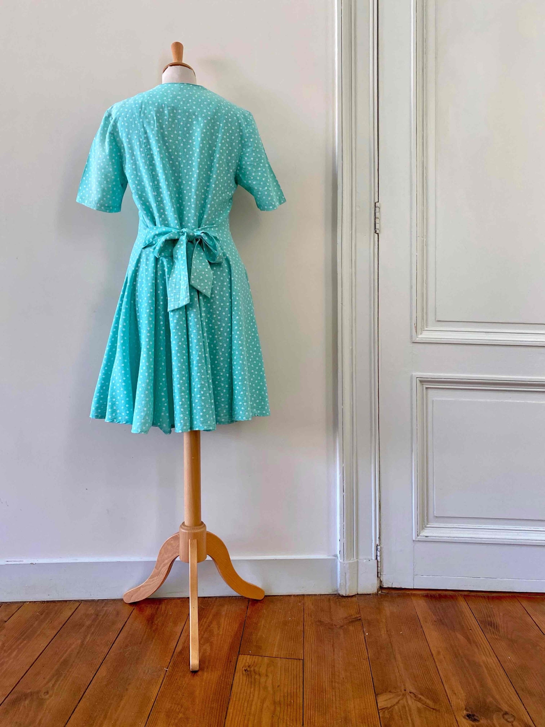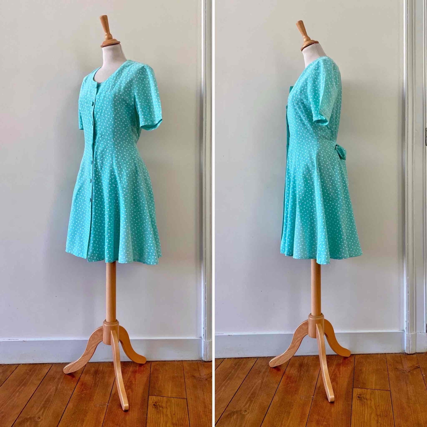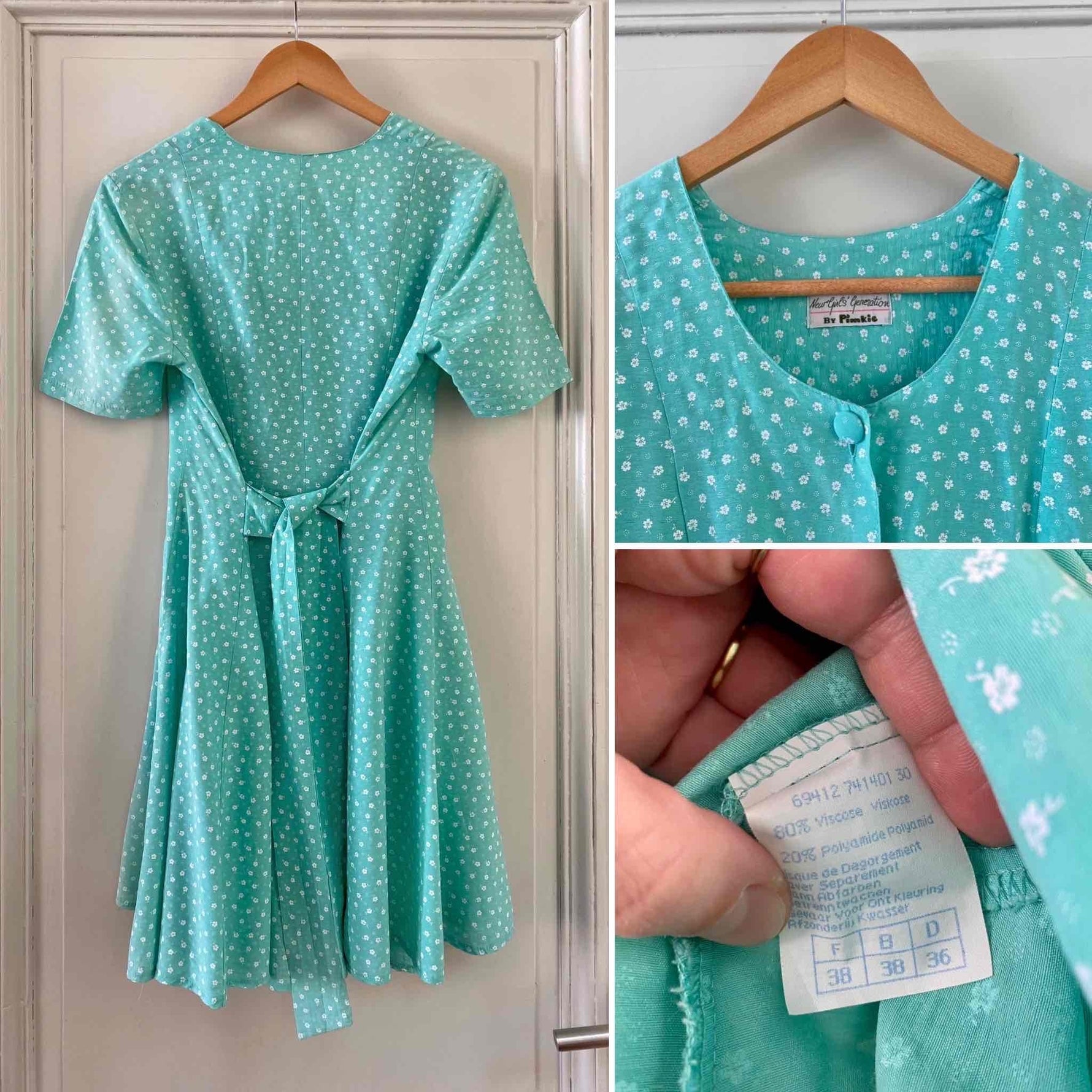 Prix unitaire parMini robe à fleurs, en viscose vert menthe à l’eau imprimée minis fleurs et pois blancs, boutonnée par boutons recouverts, taille dos à nouer par deux longs liens, années 90’s, taille actuelle 36 portée ici sur un mannequin T36.