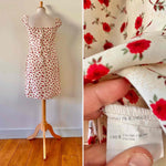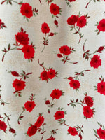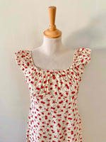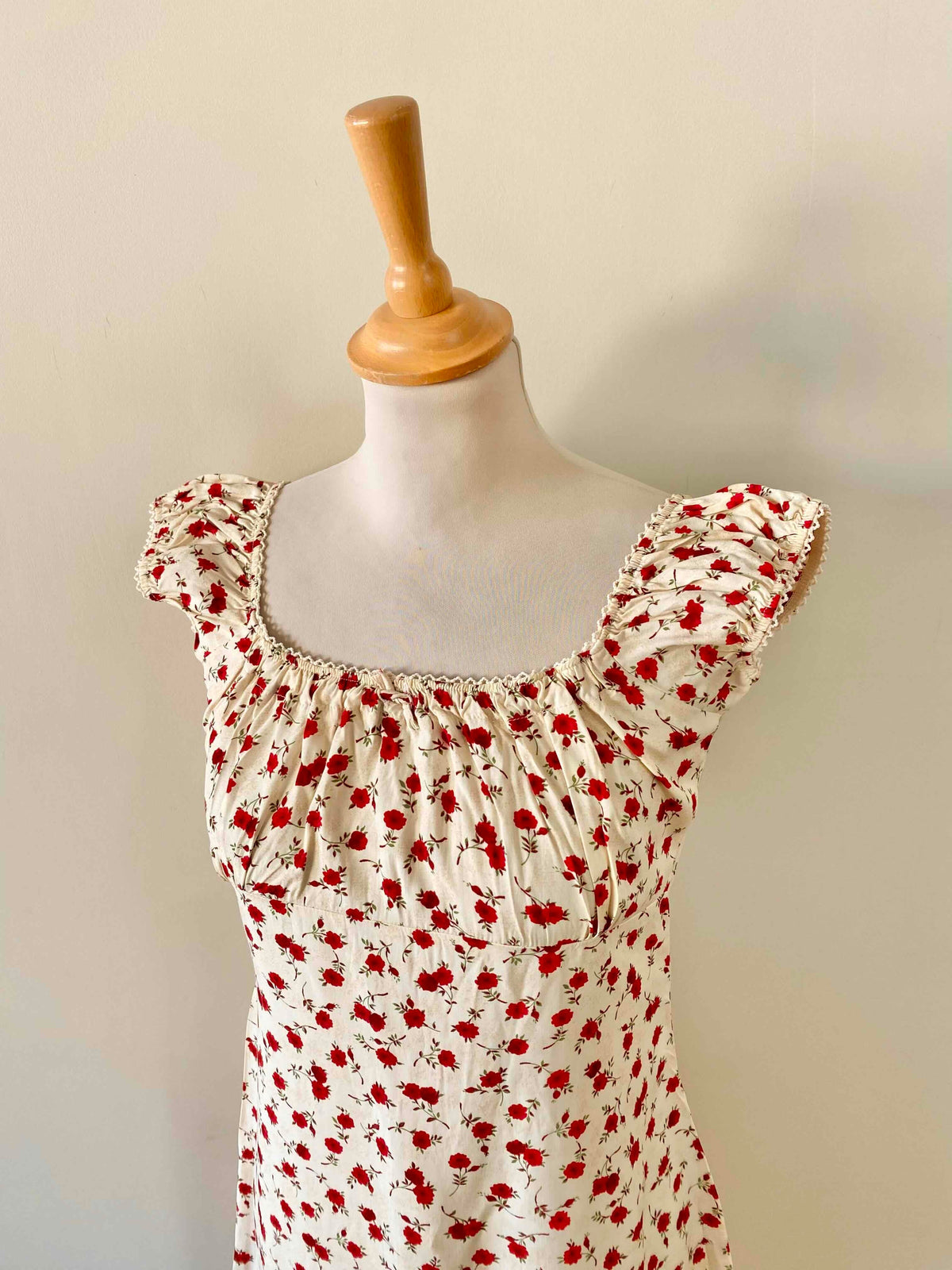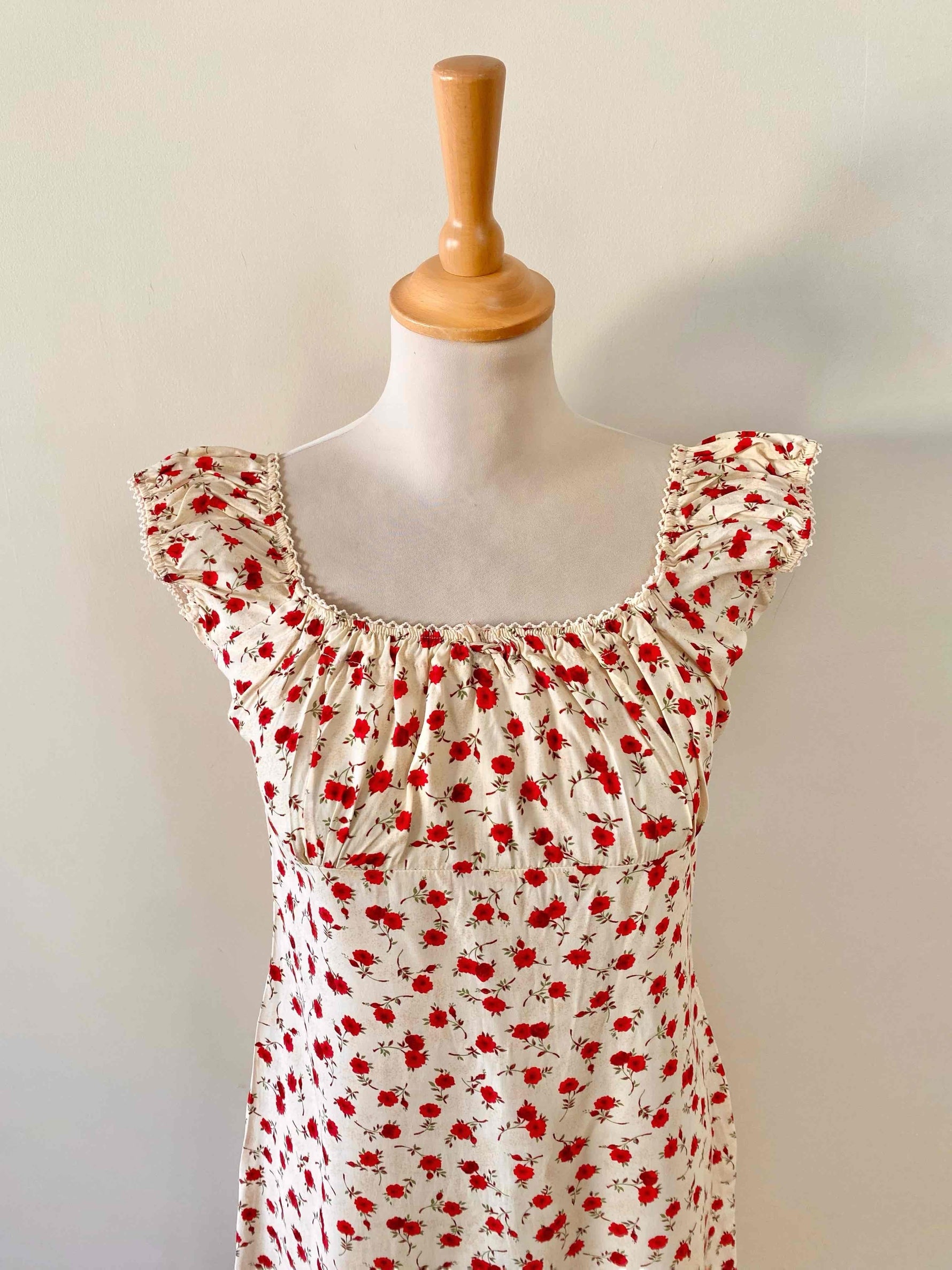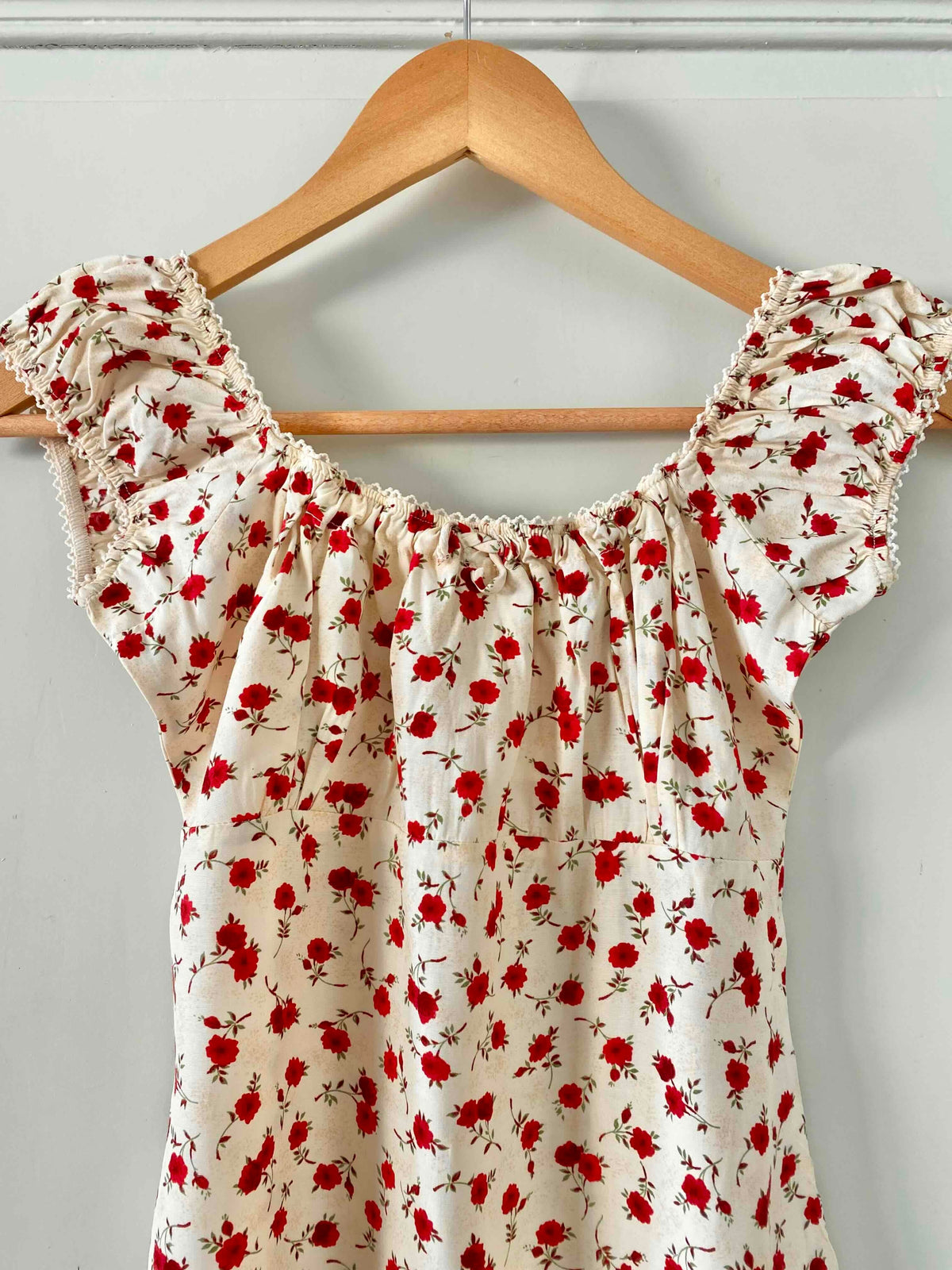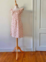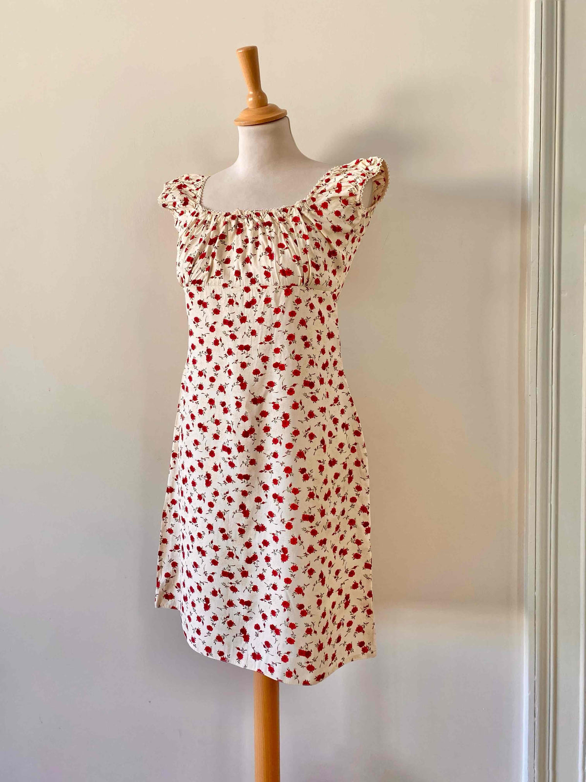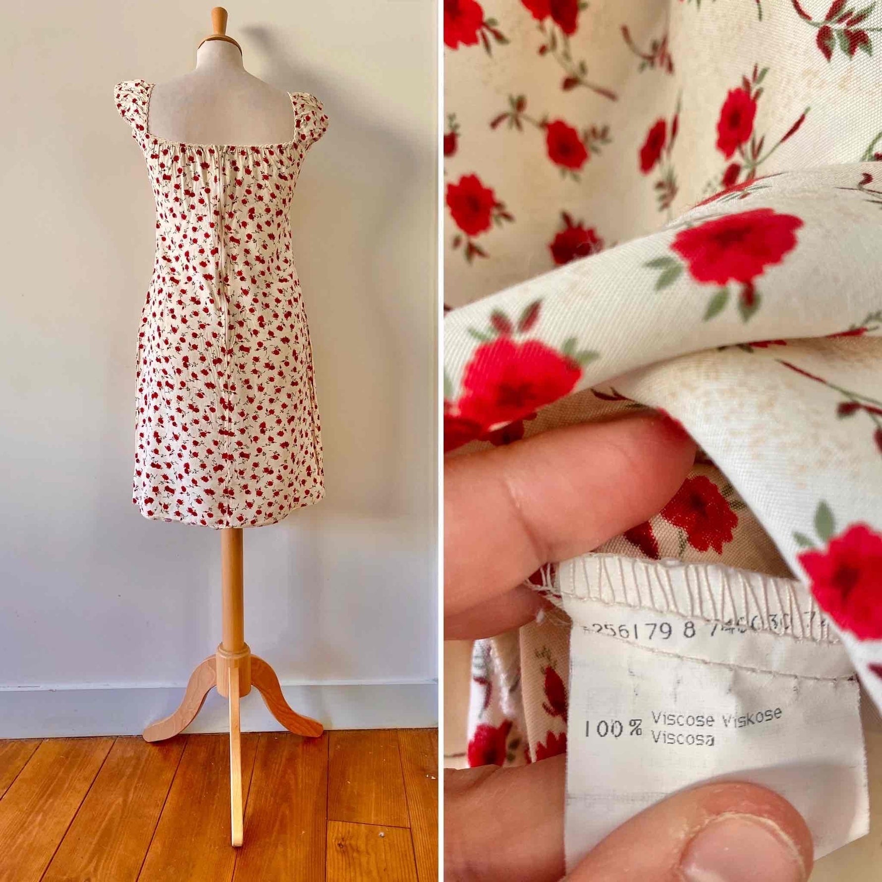 Mini robe à fleurs en viscose écrue imprimée petites fleurs rouges, vertes et beiges, manches ballons à porter openshoulders, encolure élastique et poitrine froncée à nouer, années 90’s, taille 36 portée ici sur un mannequin T36, aisselles 44cm.