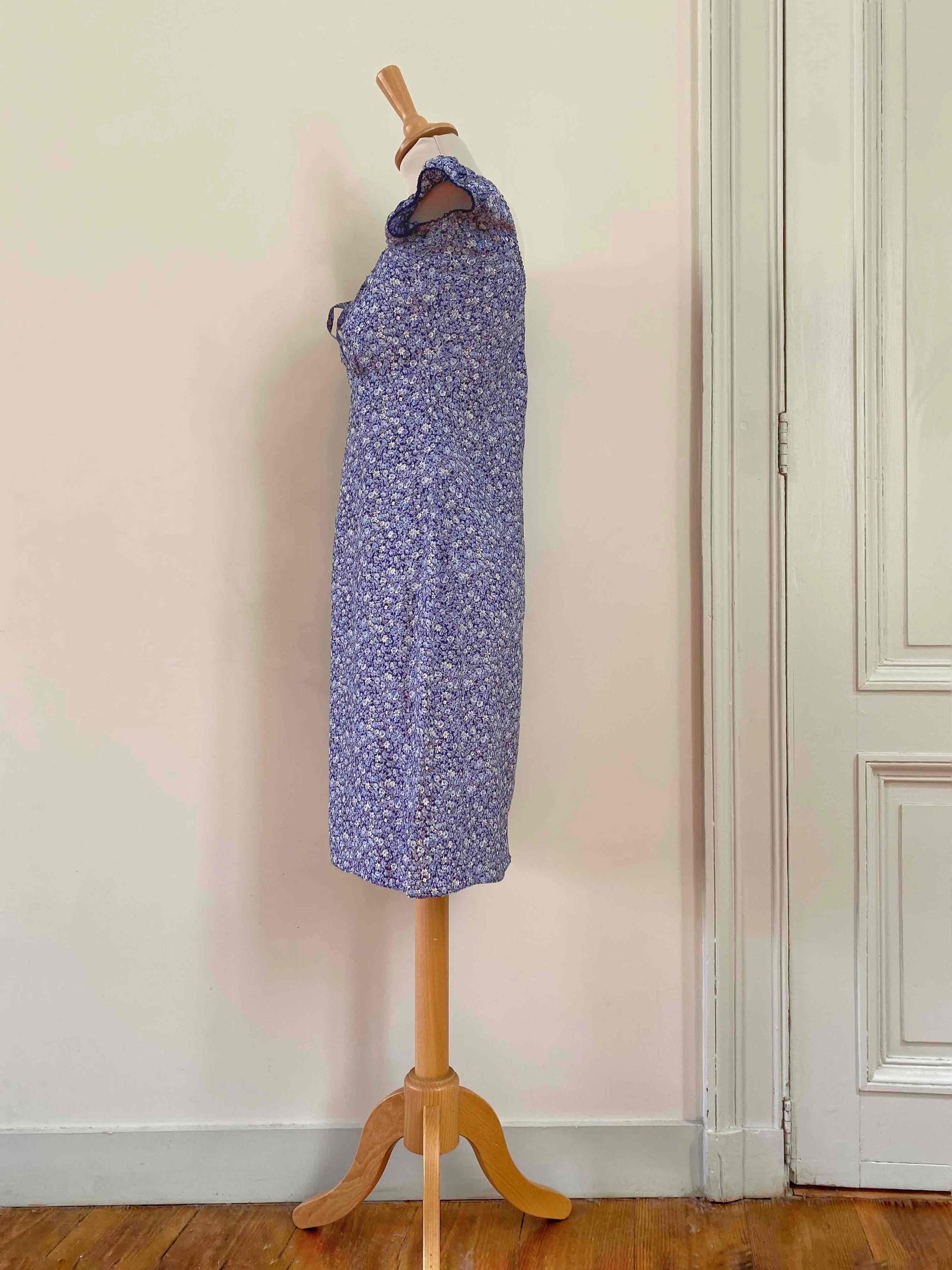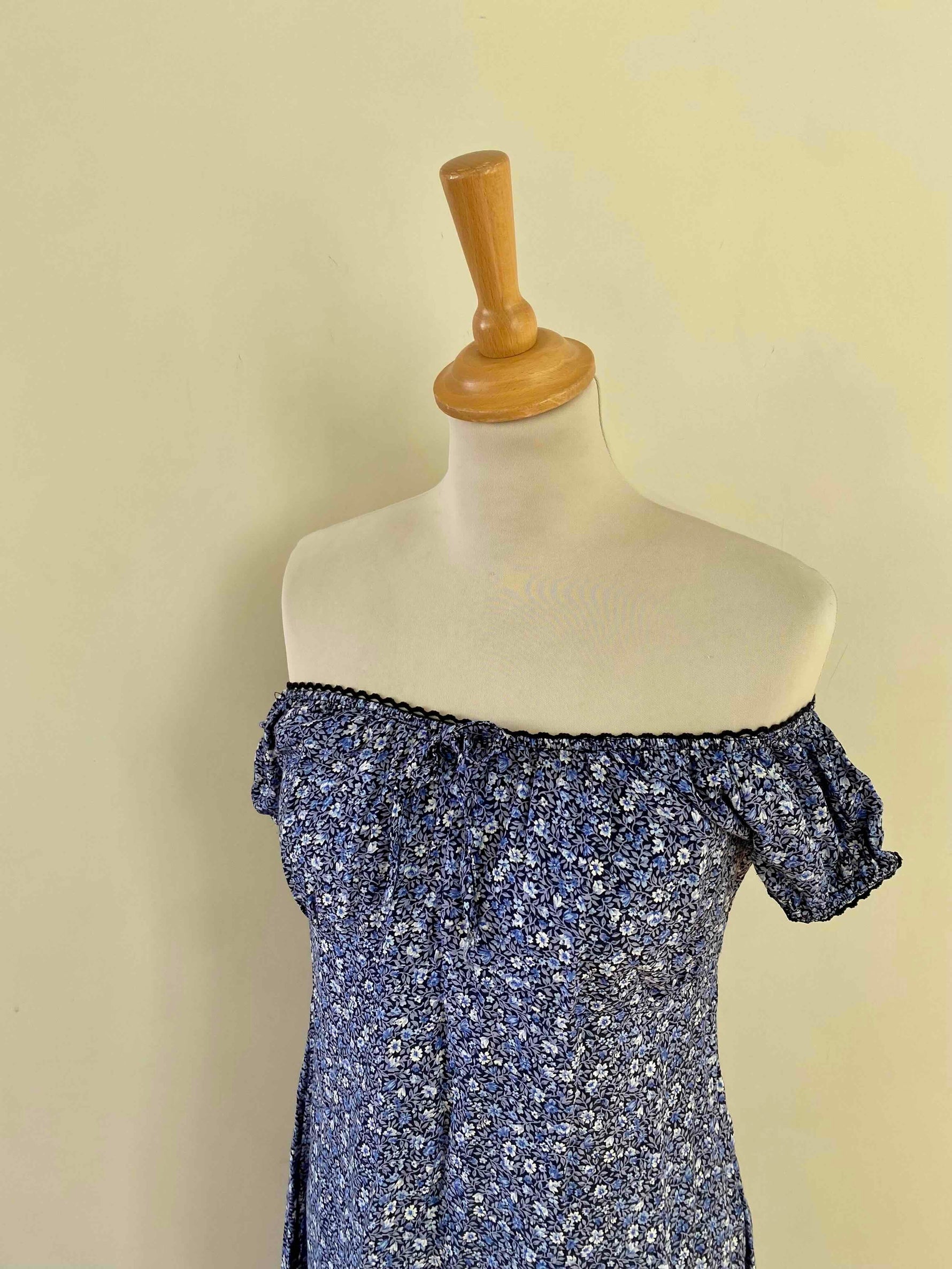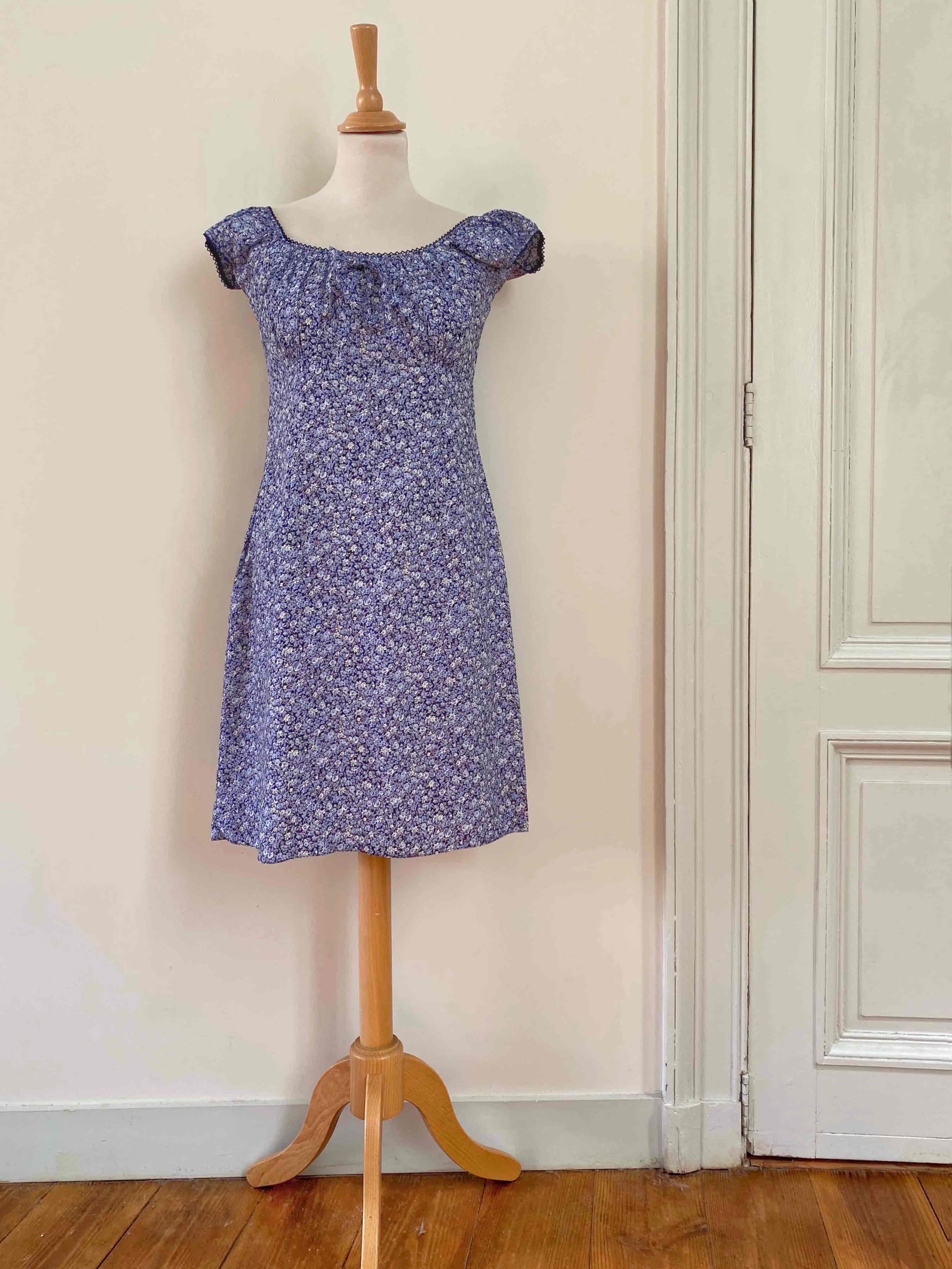Prix unitaire parMini robe à fleurs en viscose bleue imprimé petites fleurs bleues ciel, marine, blanches, encolure corsage et manches ballons élastiques piquot à porter open-shoulder, fabriquée en France, taille 36 portée ici sur un mannequin T36, aisselles 43cm.