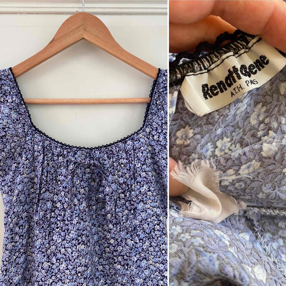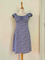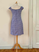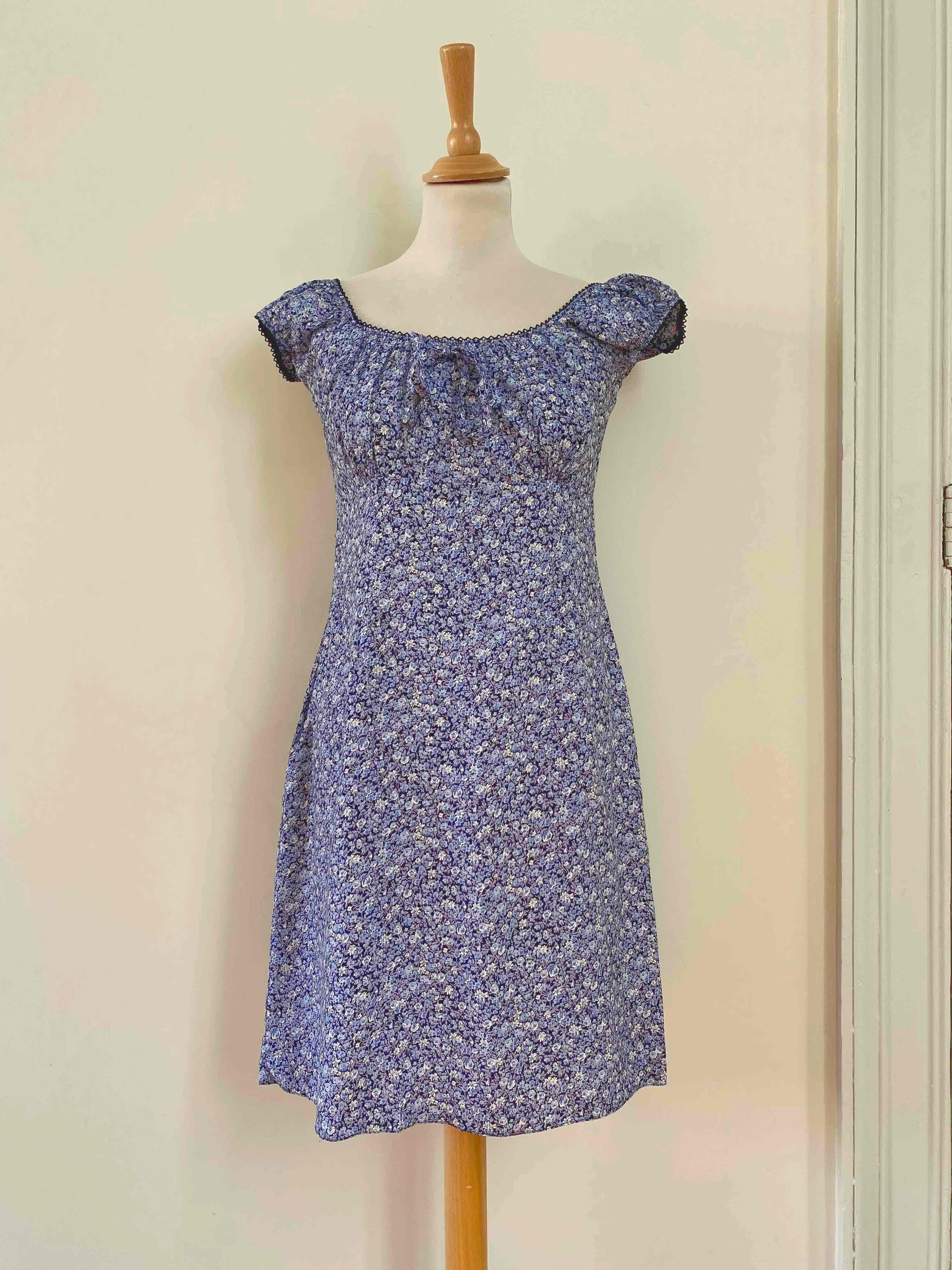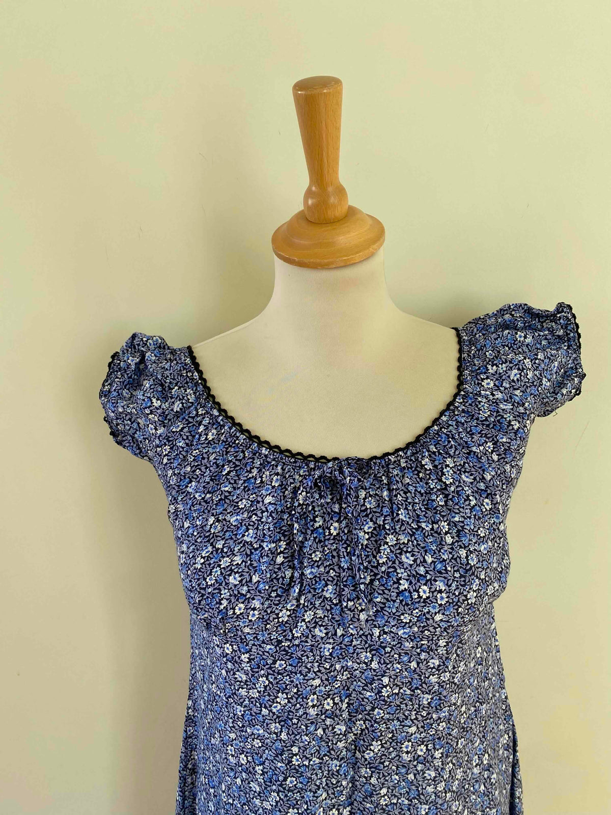 Prix unitaire parMini robe à fleurs en viscose bleue imprimé petites fleurs bleues ciel, marine, blanches, encolure corsage et manches ballons élastiques piquot à porter open-shoulder, fabriquée en France, taille 36 portée ici sur un mannequin T36, aisselles 43cm.
