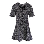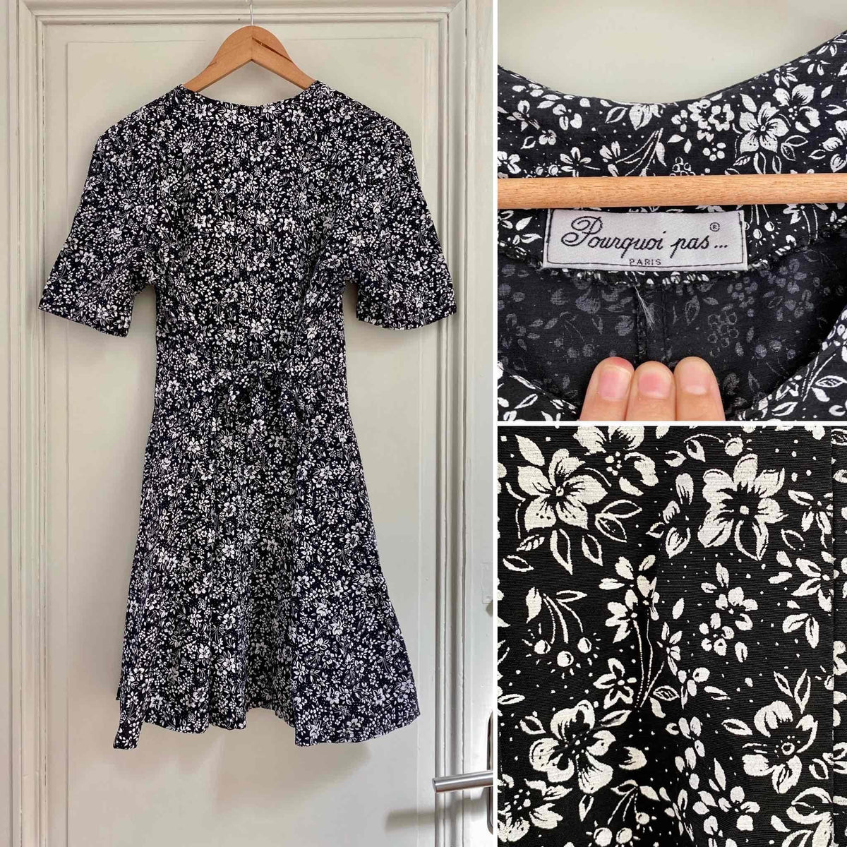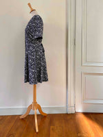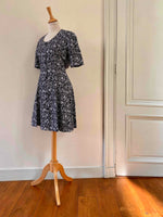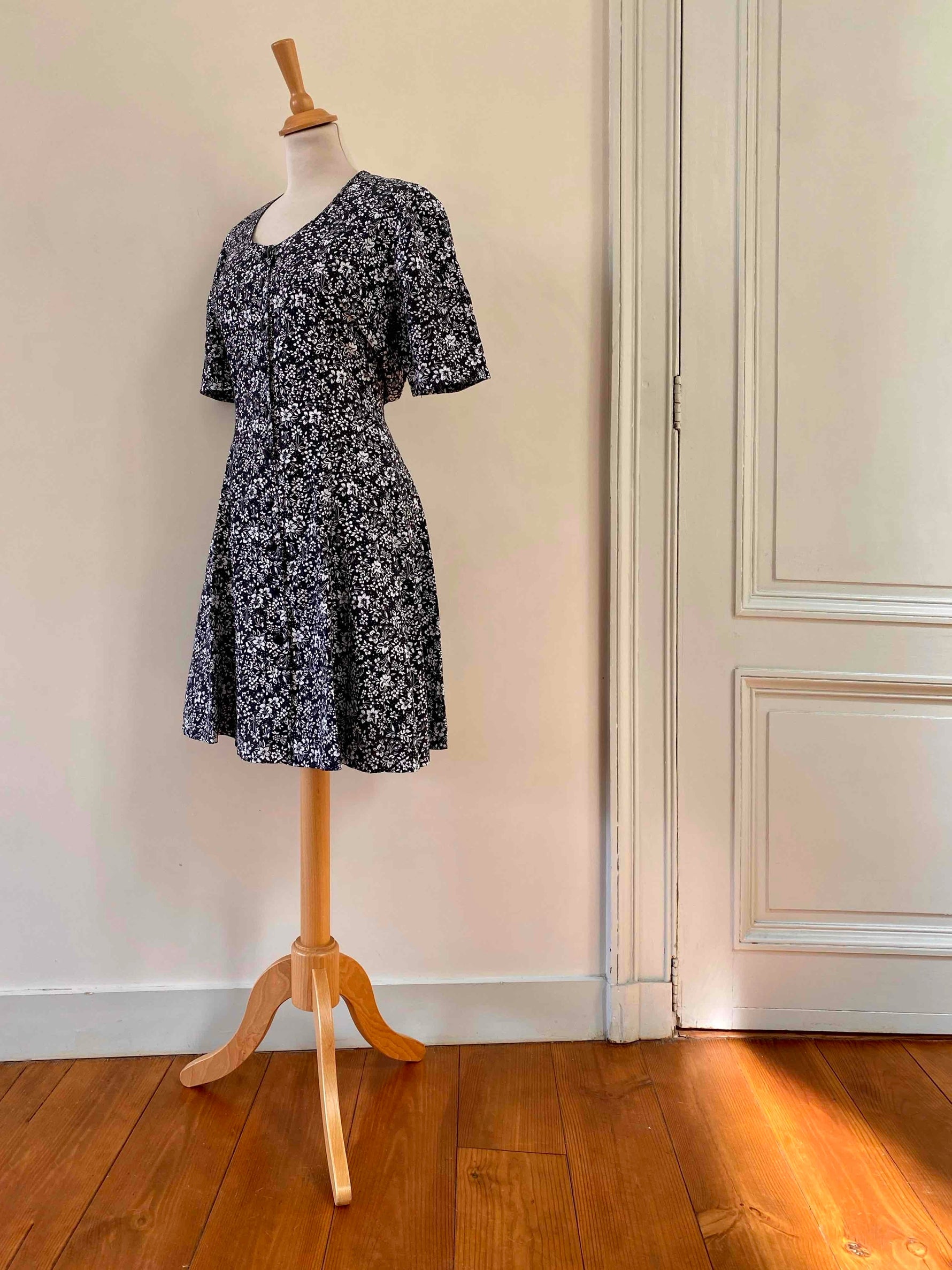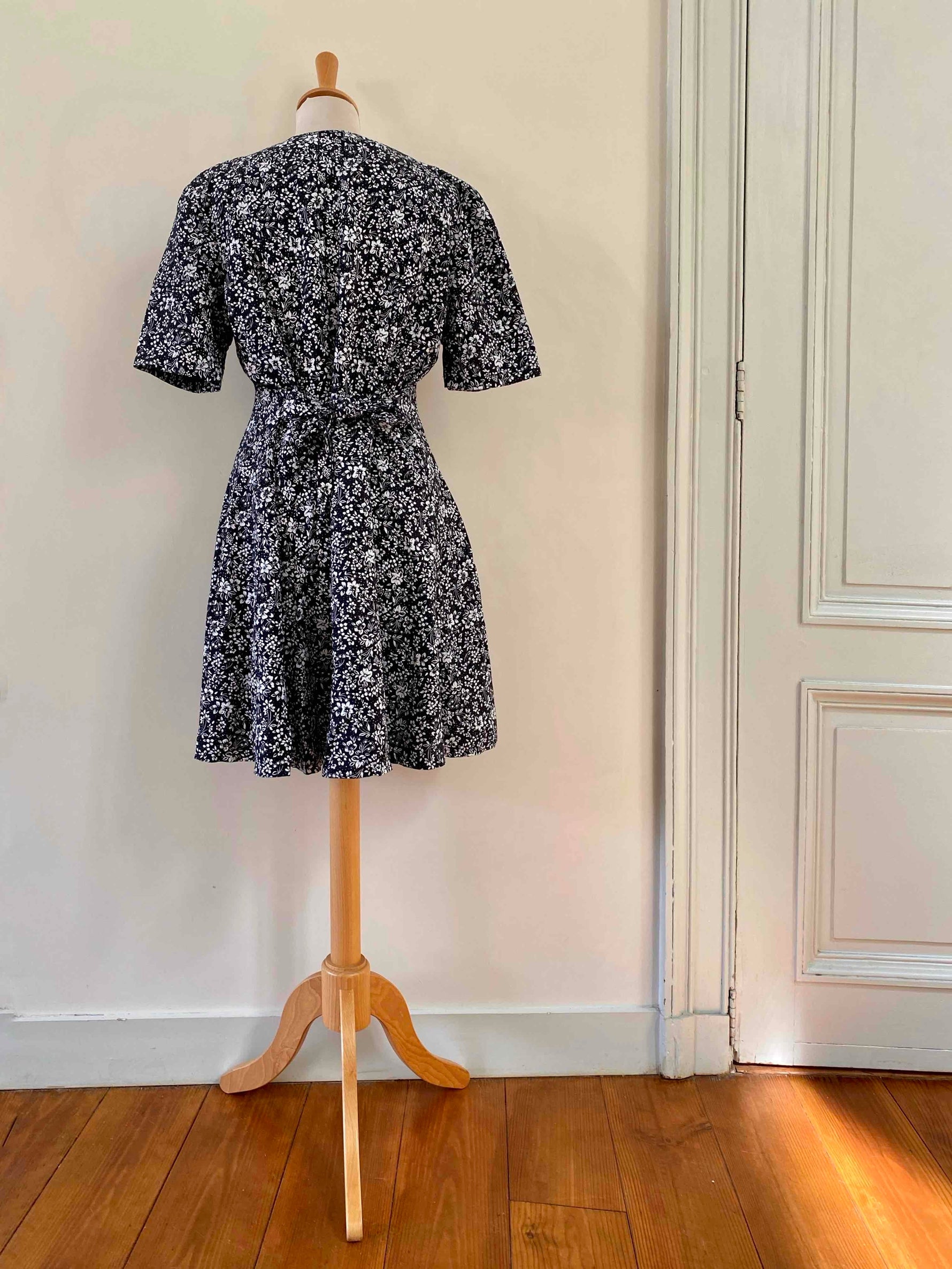 Mini robe à fleurs, en viscose noire imprimée minis fleurs, pois, et cerises blancs, boutonnée, taille dos à nouer, fit and flare, fabriquée en France, taille 36 portée ici sur un mannequin T36, aisselles 45cm.