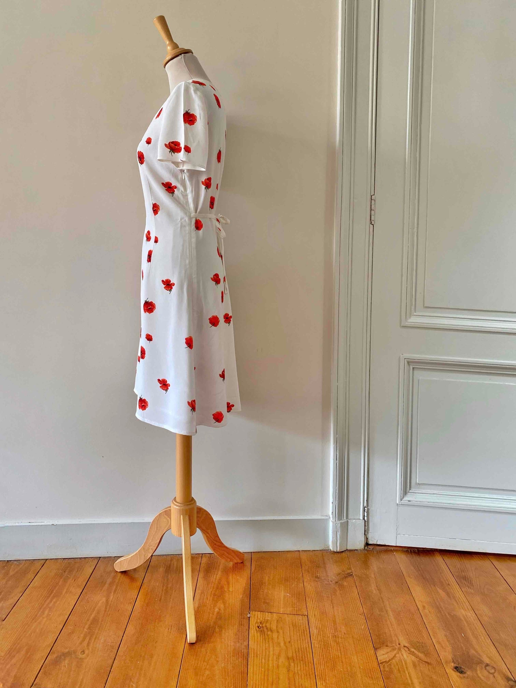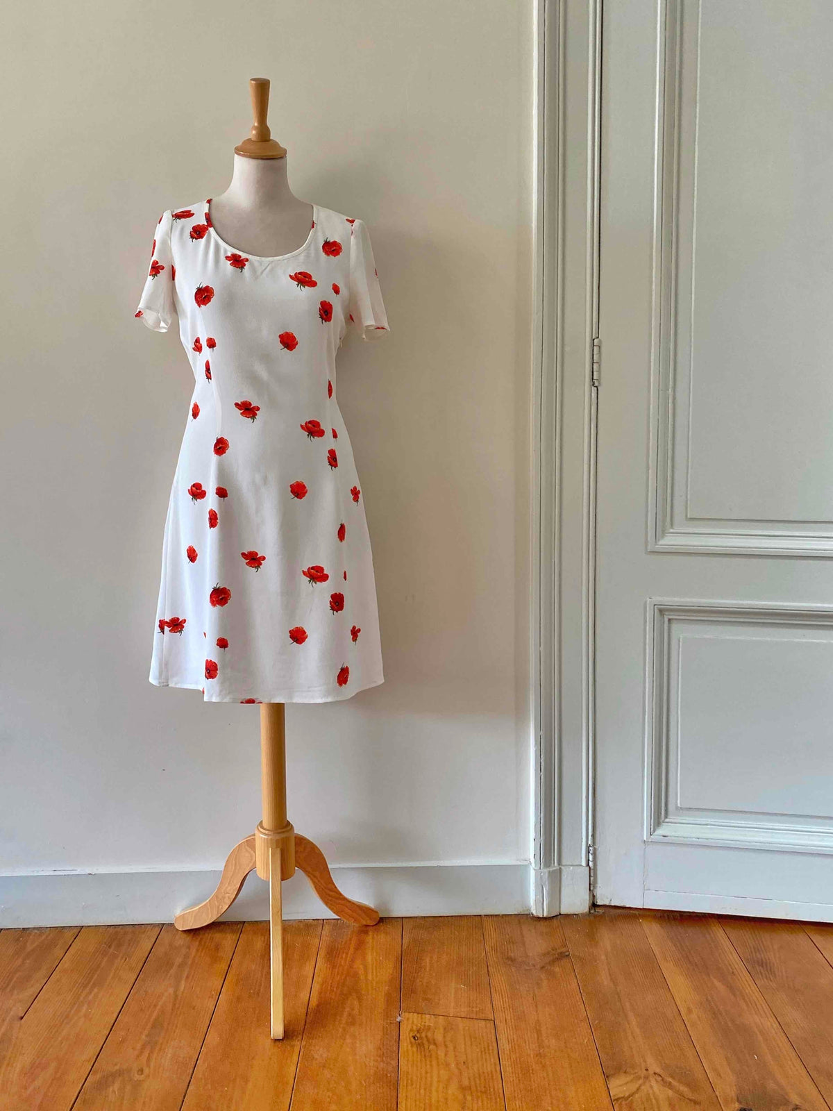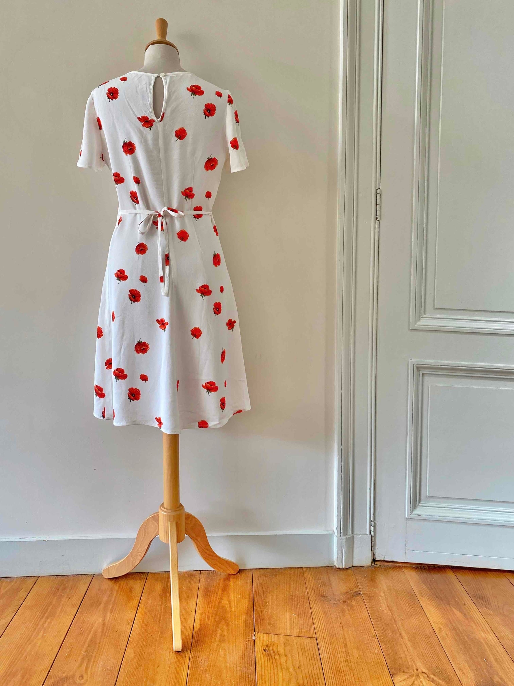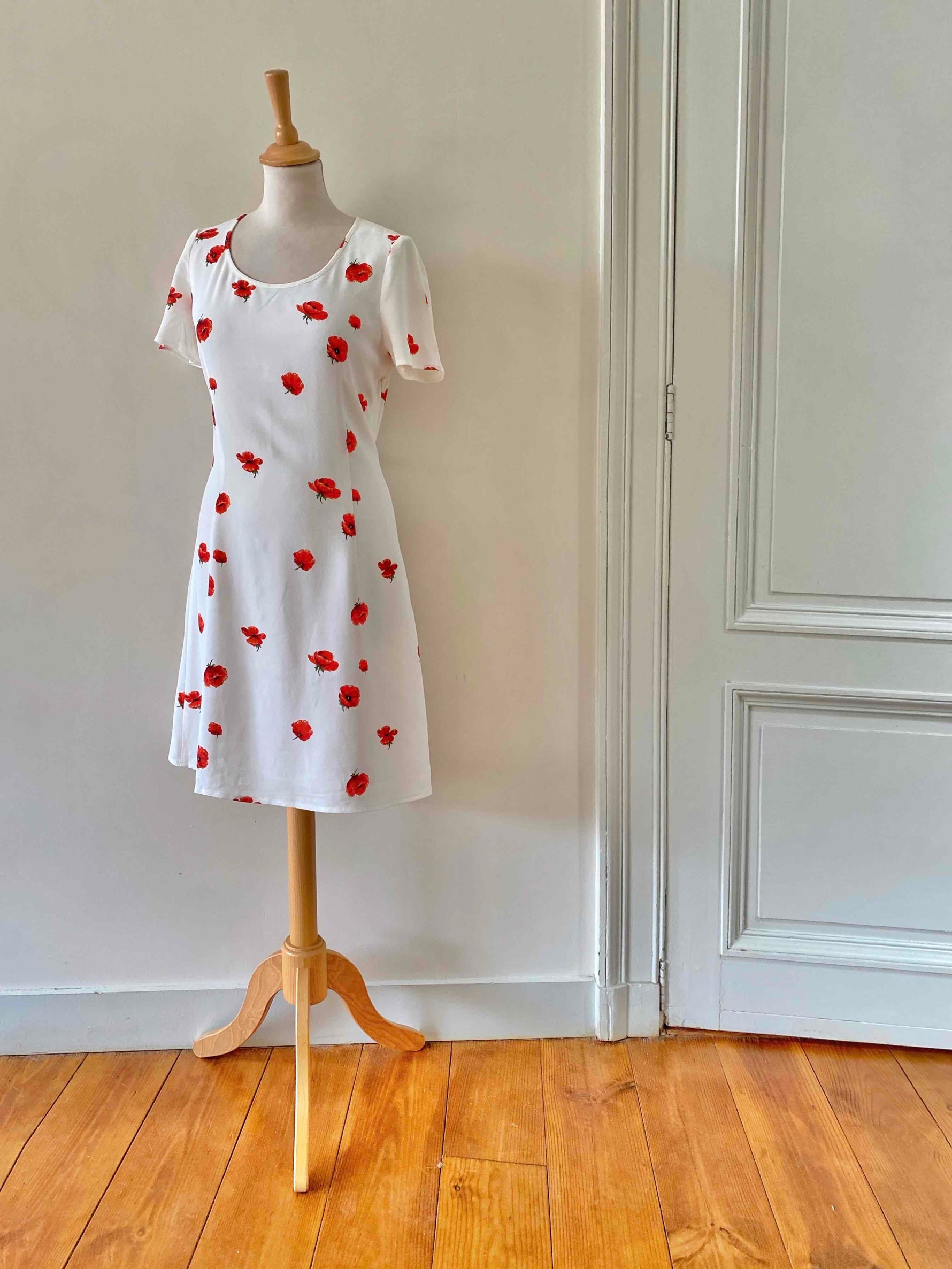 Prix unitaire parMini robe à fleurs Cacharel, en viscose blanche imprimée coquelicots rouges vif et verts, taille à nouer devant ou dos, fermeture éclaire côté, goutte boutonnée col dos, fabriquée en Italie, taille 36 actuelle portée ici sur un mannequin T36, aisselles 44cm.