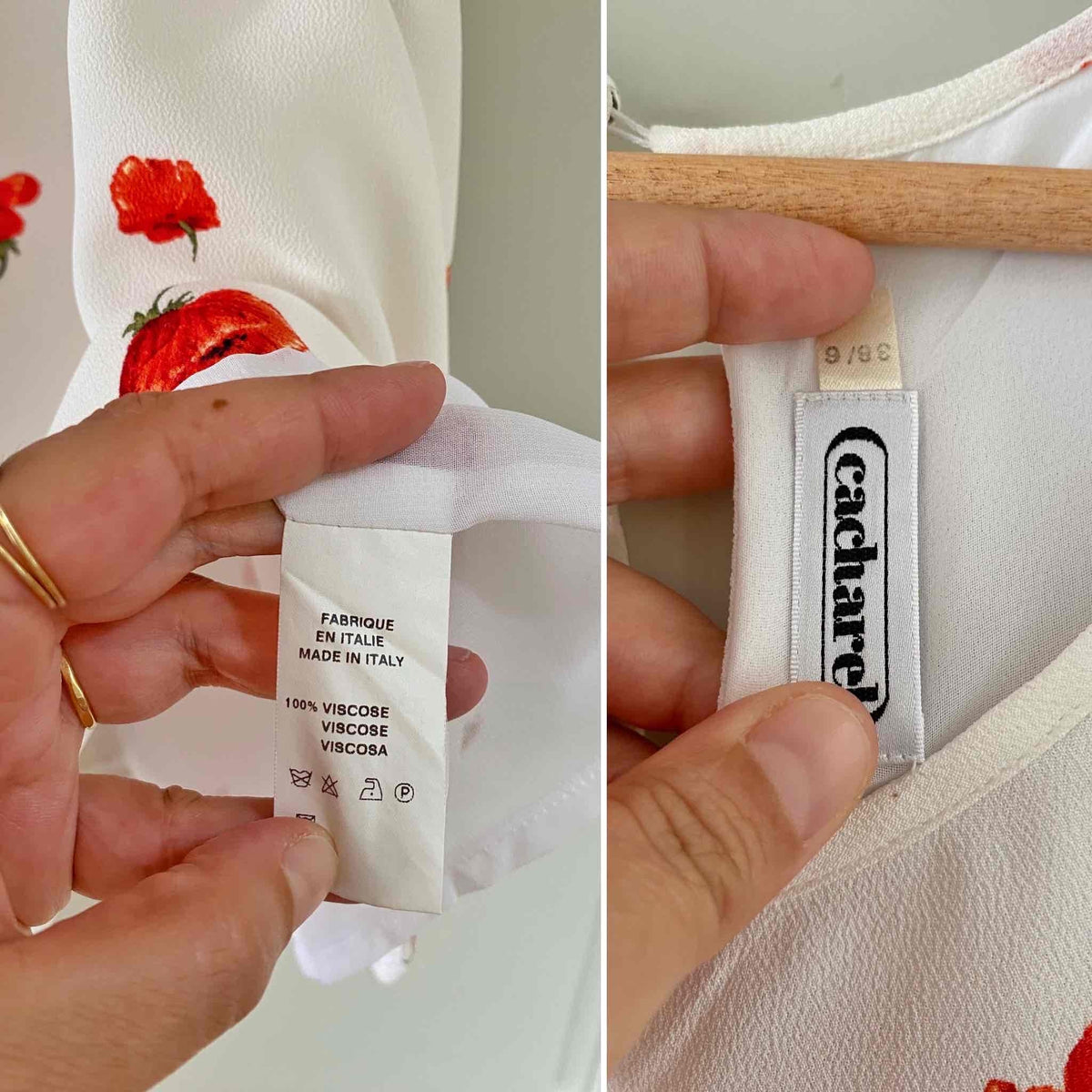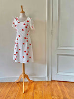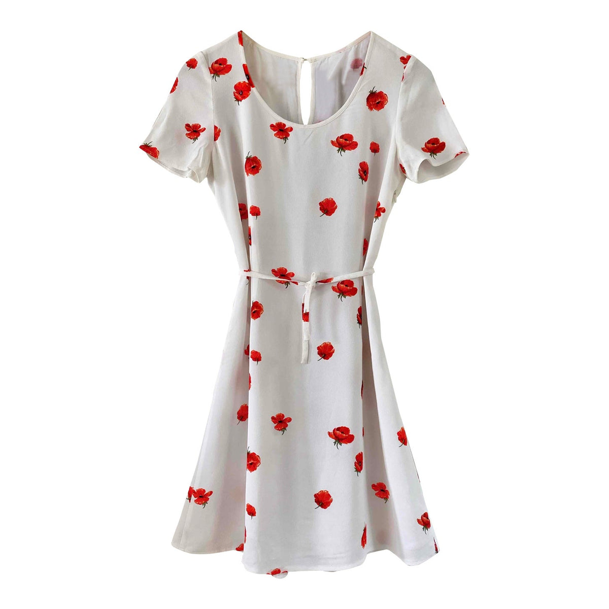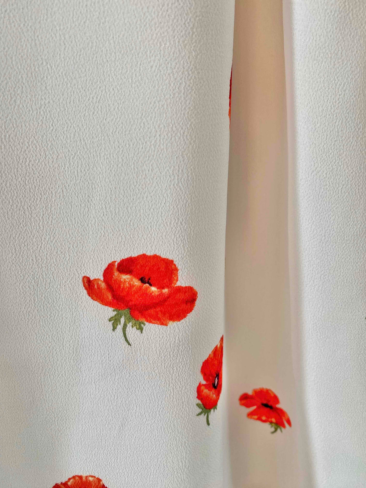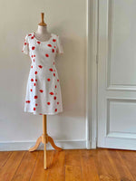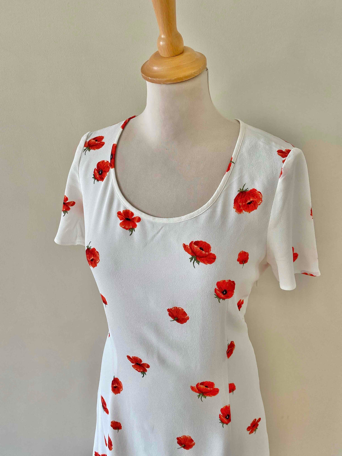 Prix unitaire parMini robe à fleurs Cacharel, en viscose blanche imprimée coquelicots rouges vif et verts, taille à nouer devant ou dos, fermeture éclaire côté, goutte boutonnée col dos, fabriquée en Italie, taille 36 actuelle portée ici sur un mannequin T36, aisselles 44cm.