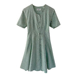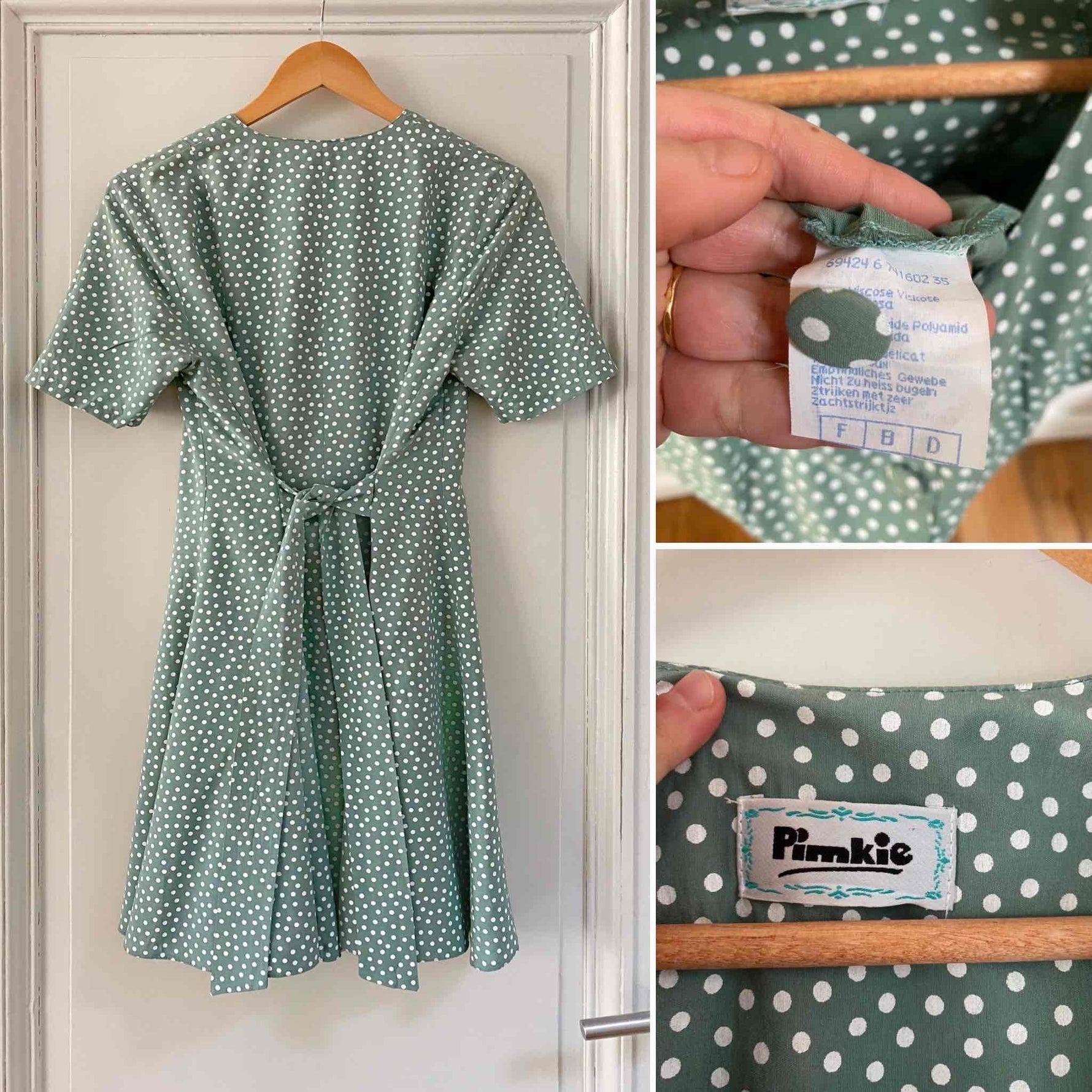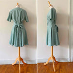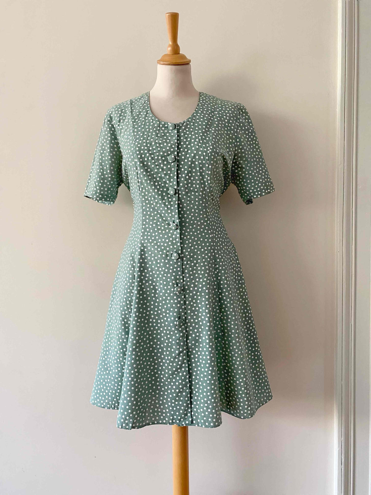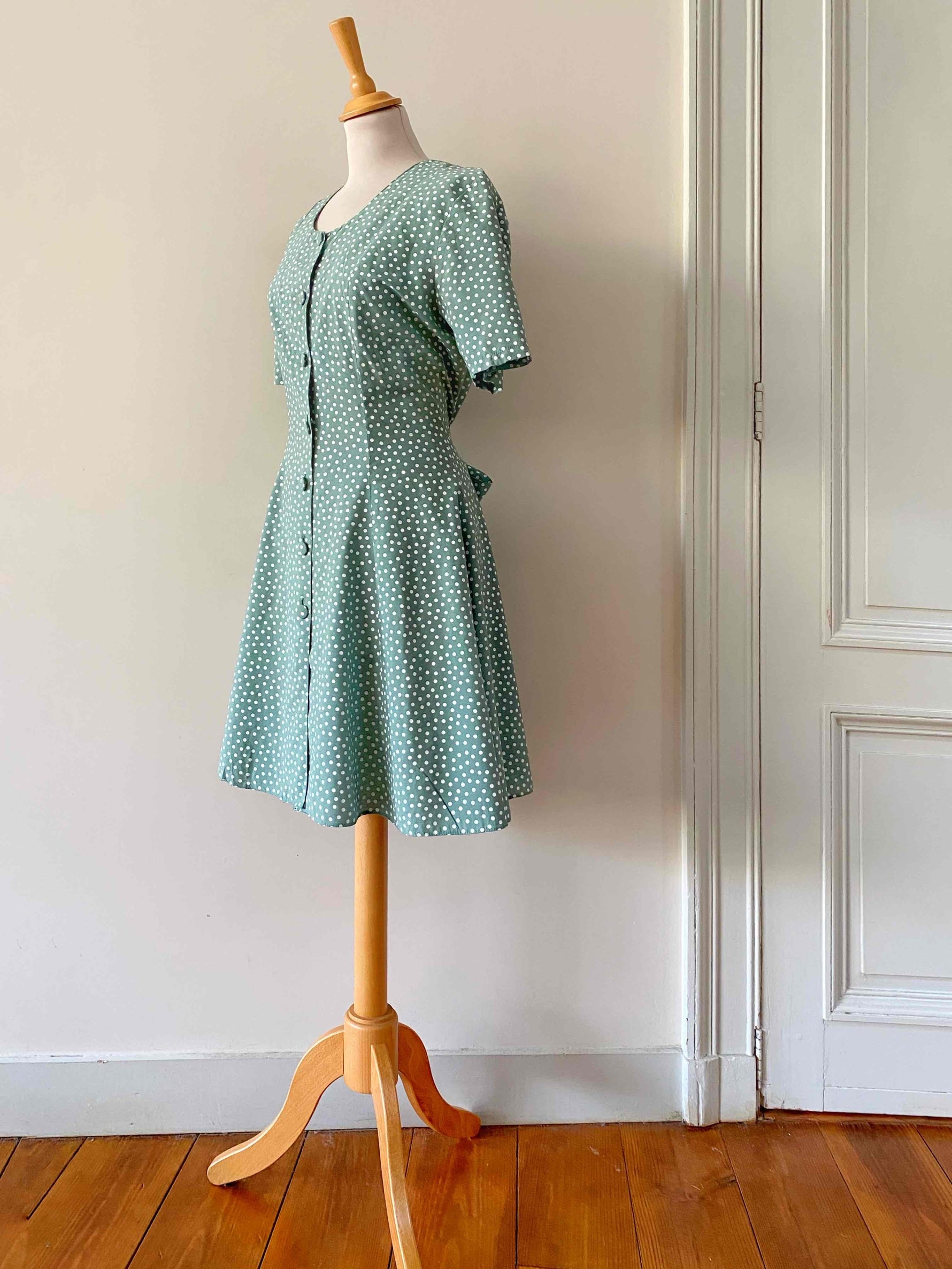 Mini robe à pois en viscose vert amande imprimée pois blancs, boutons recouverts ton sur ton, large ceinture à nouer taille dos, taille 36 portée ici sur un mannequin T36, aisselles 44cm.