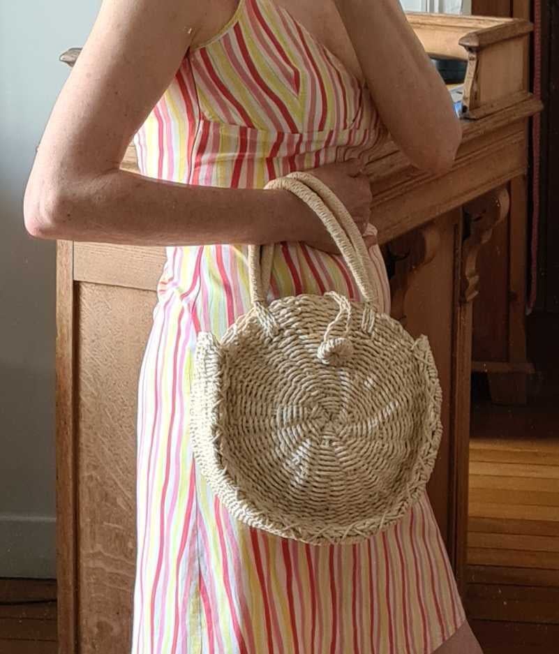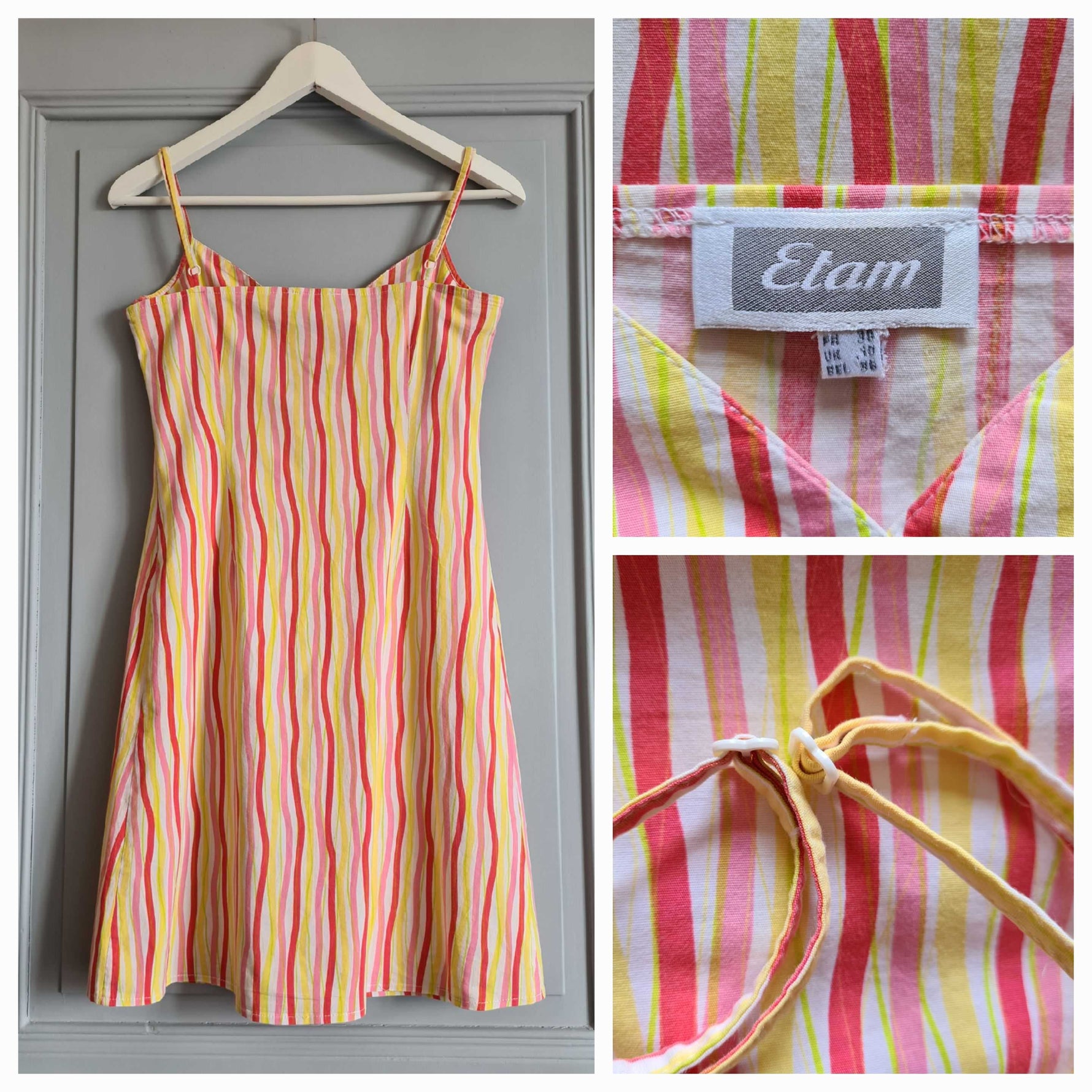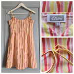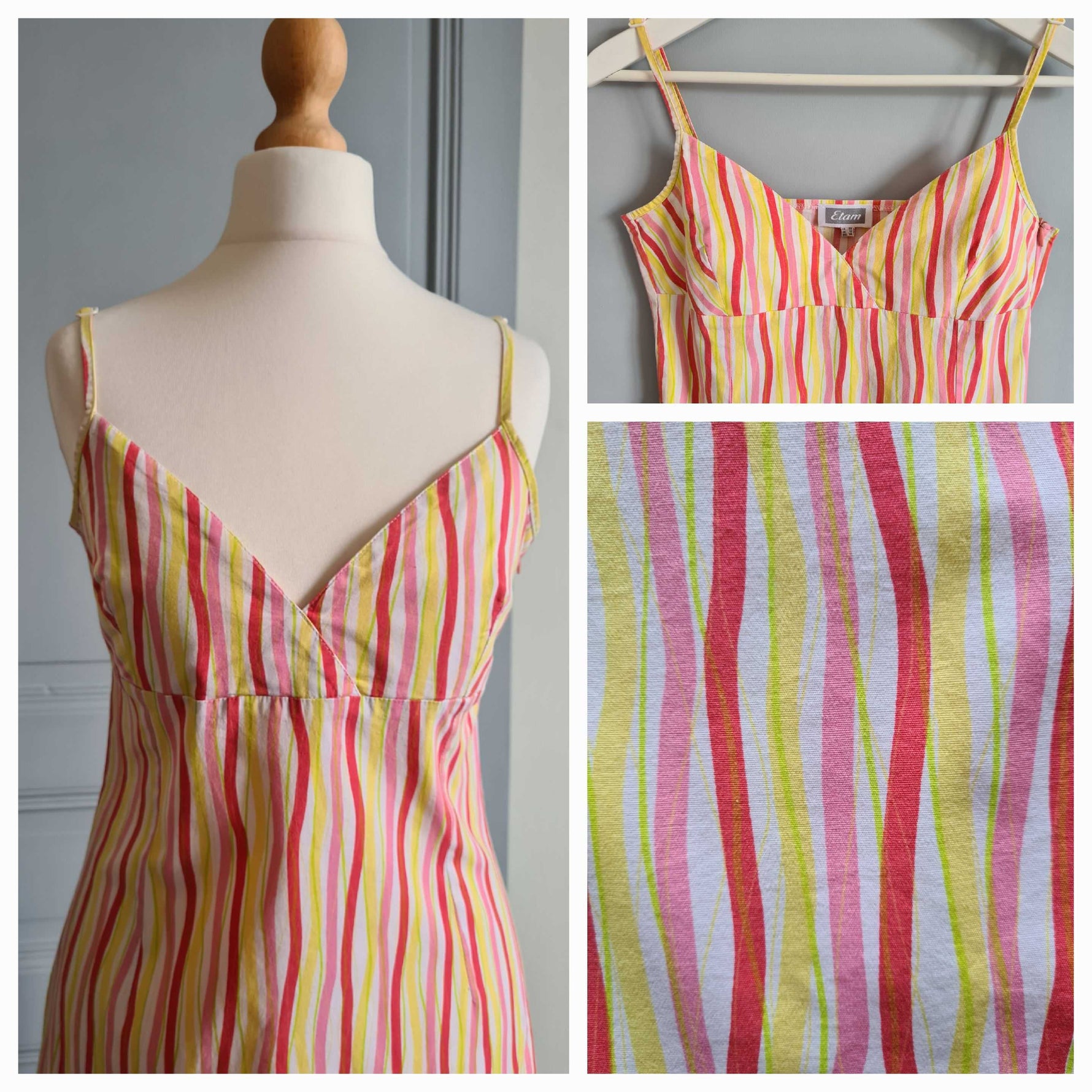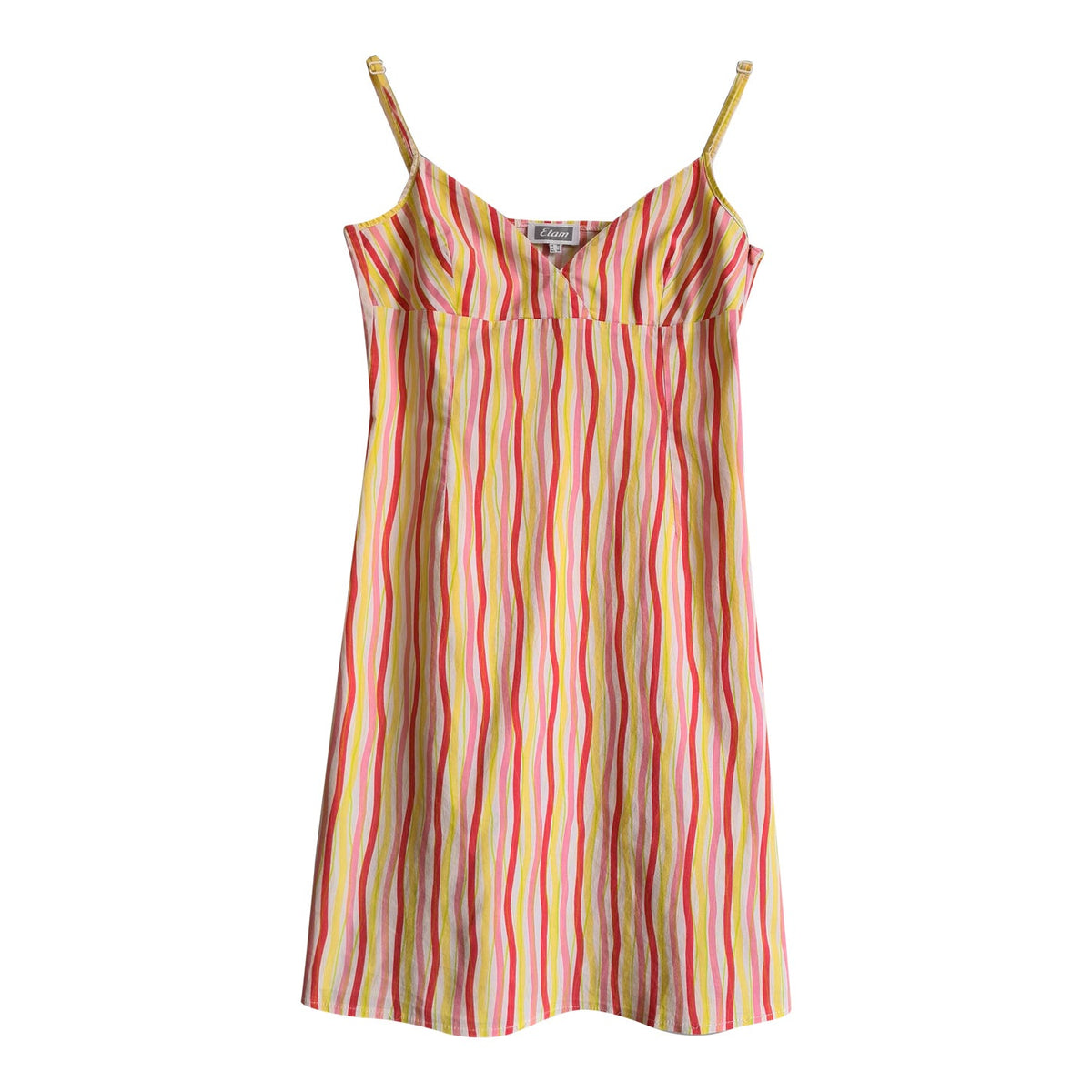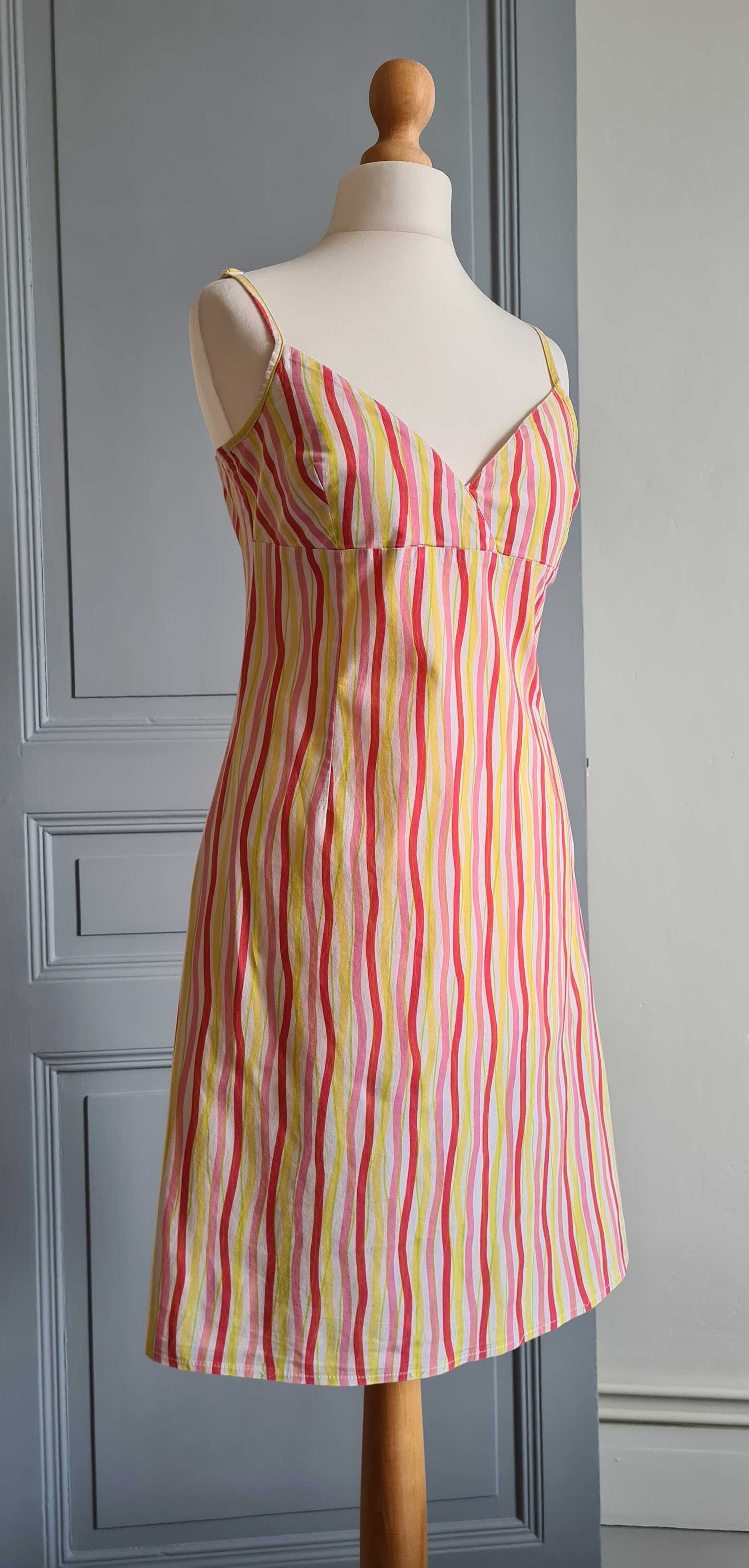 Prix unitaire parMini robe à bretelles, à rayures ondulées, couleur jaune, rose et corail sur fond blanc, taille haute, corsage poitrine croisé, jupe trapèze. Zippée côté. Bretelles réglables. Poitrine 41 cm.