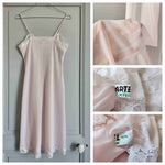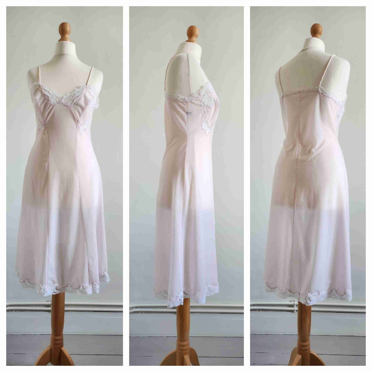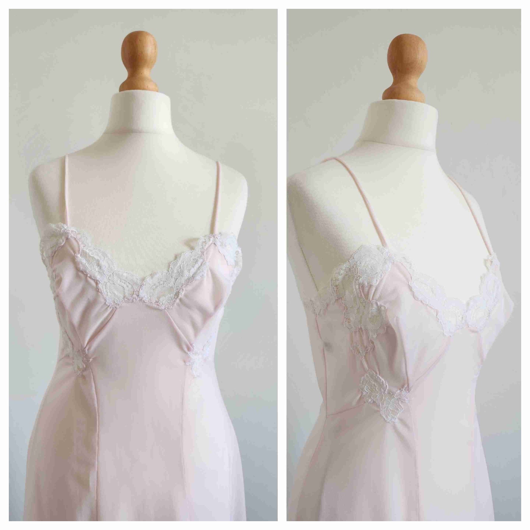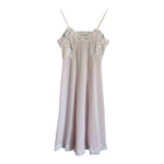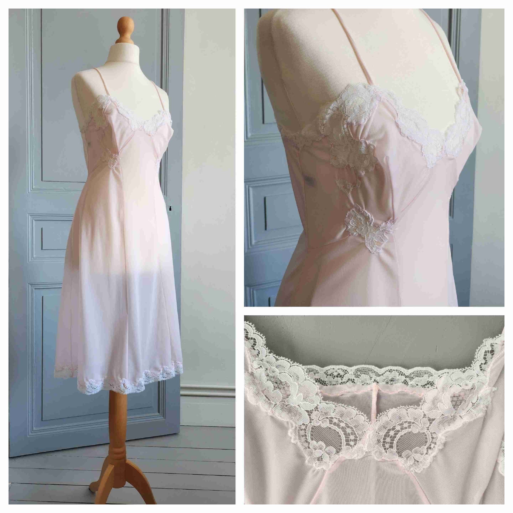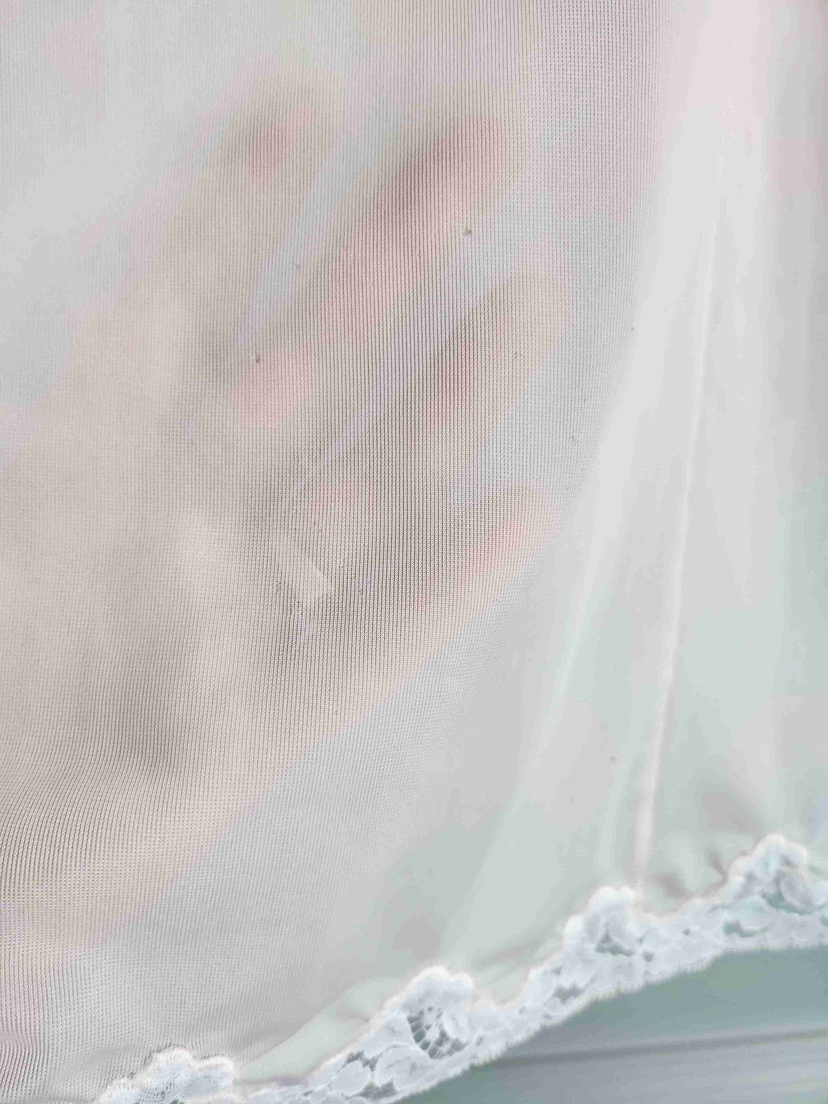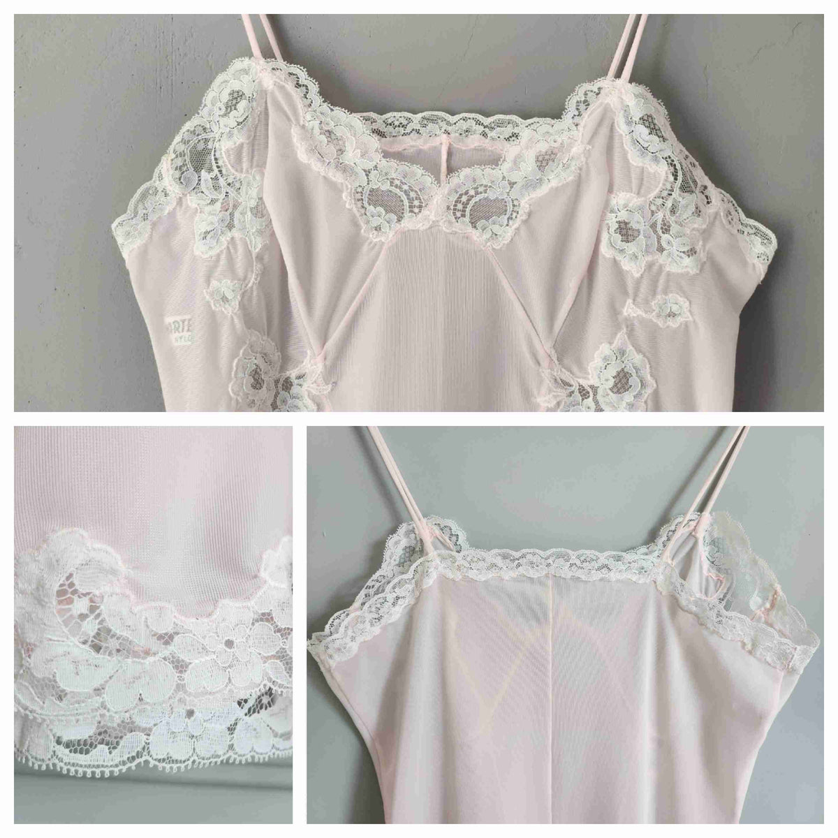 Prix unitaire parNuisette lingerie en voile rose pastel à dentelle blanche, bretelles spaghetti, empiècement pinces poitrine, taille haute cintrée. Transparente. Poitrine 38 cm.
