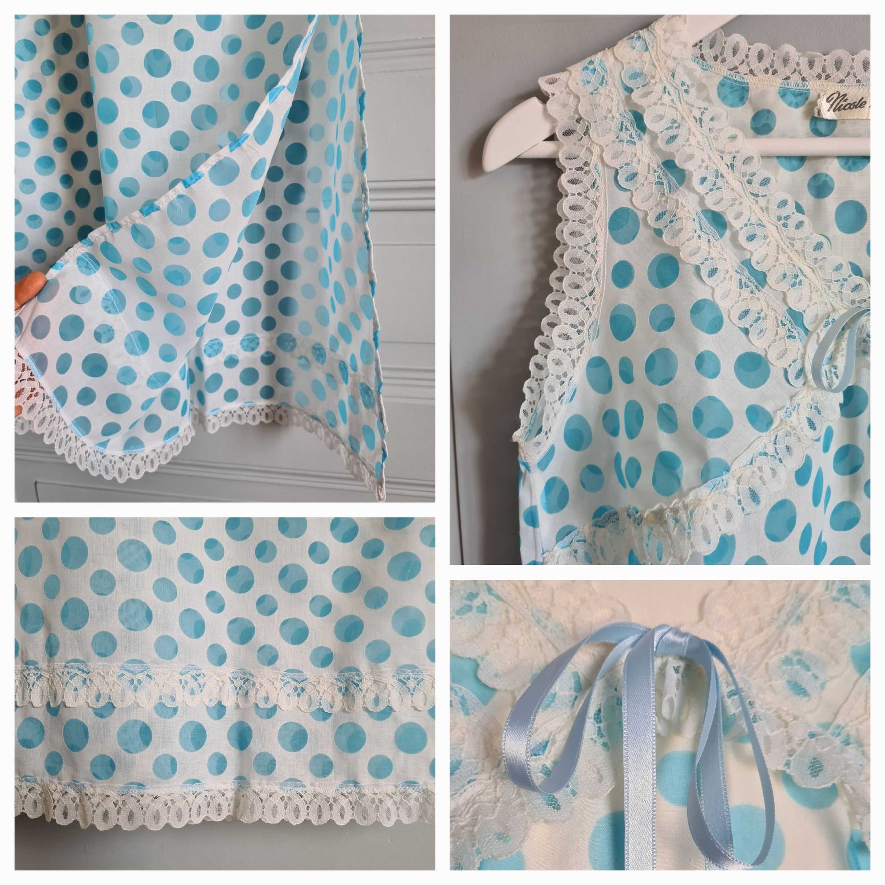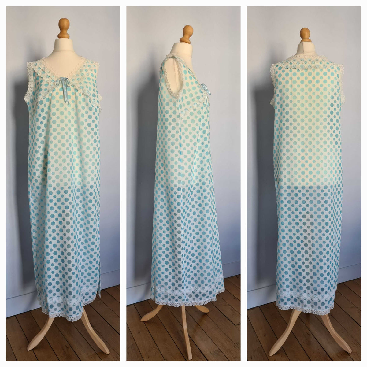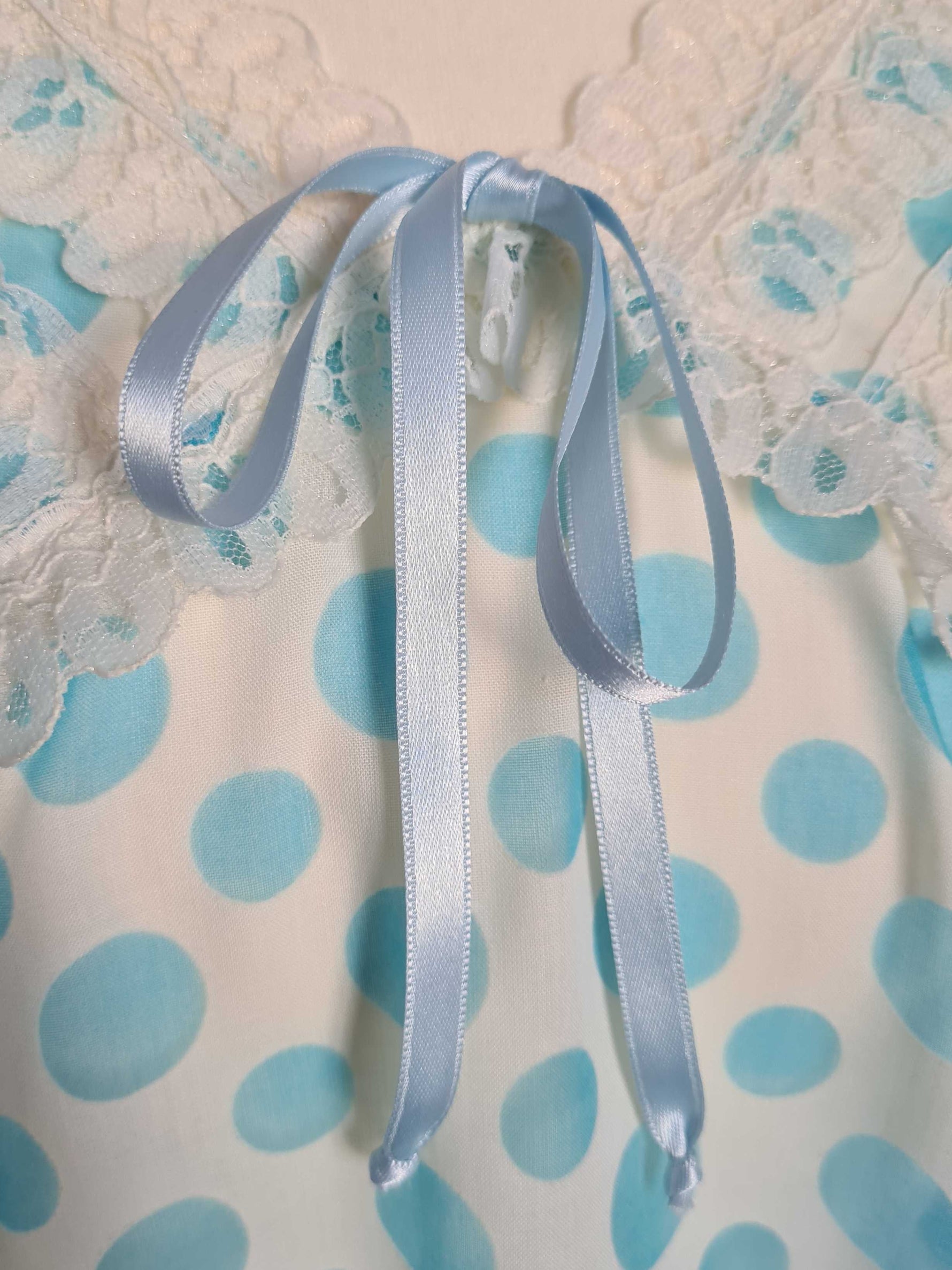Prix unitaire parNoisette longue blanche à pois bleu ciel, corsage et base décorés de dentelle. Coupe fluide. Le tissu est assez transparent. Fente sur un côté. Poitrine 48 cm.