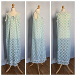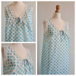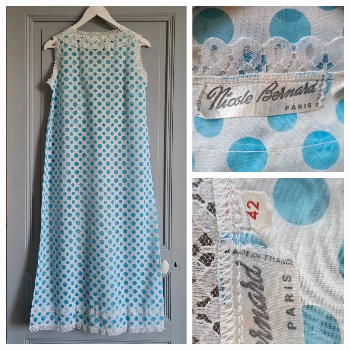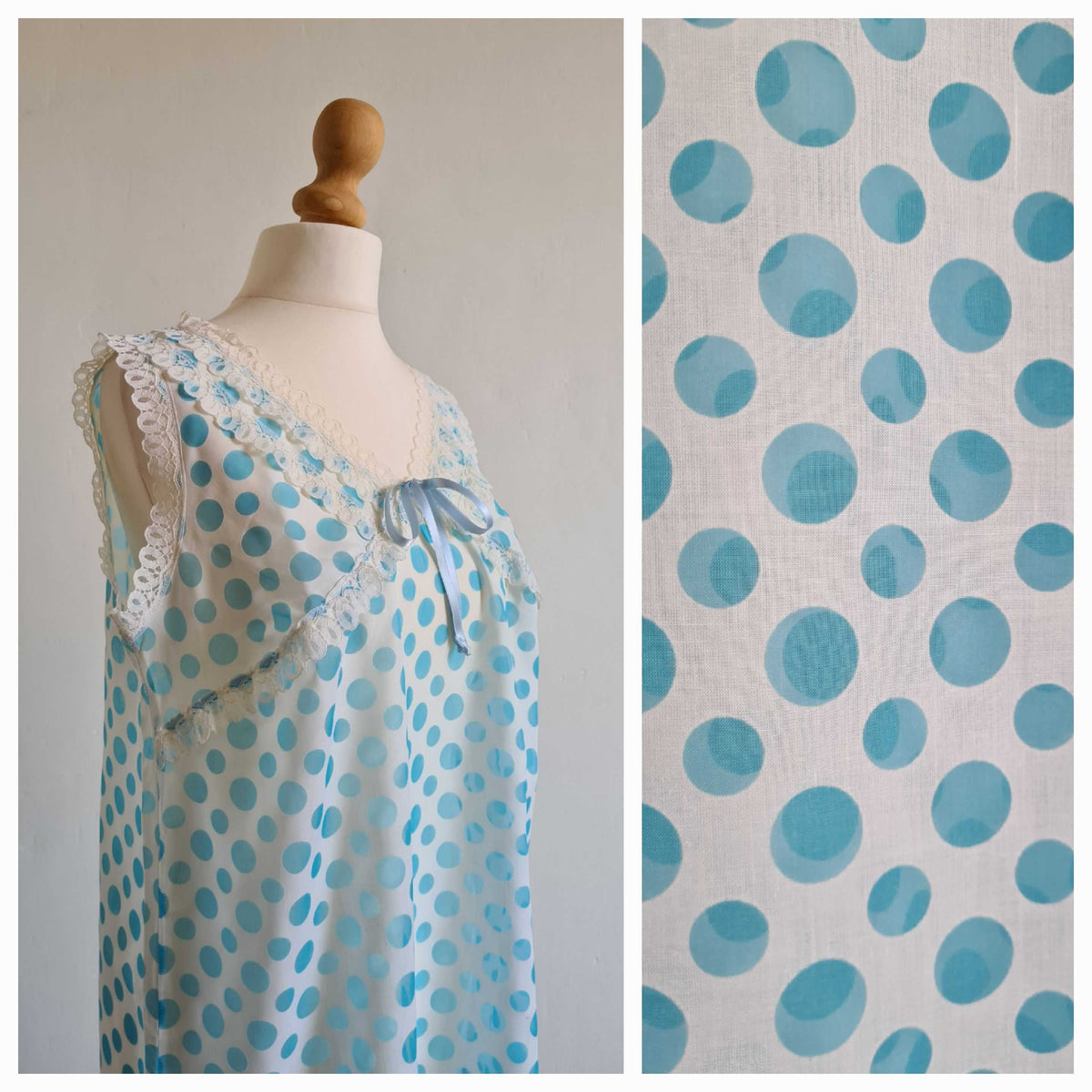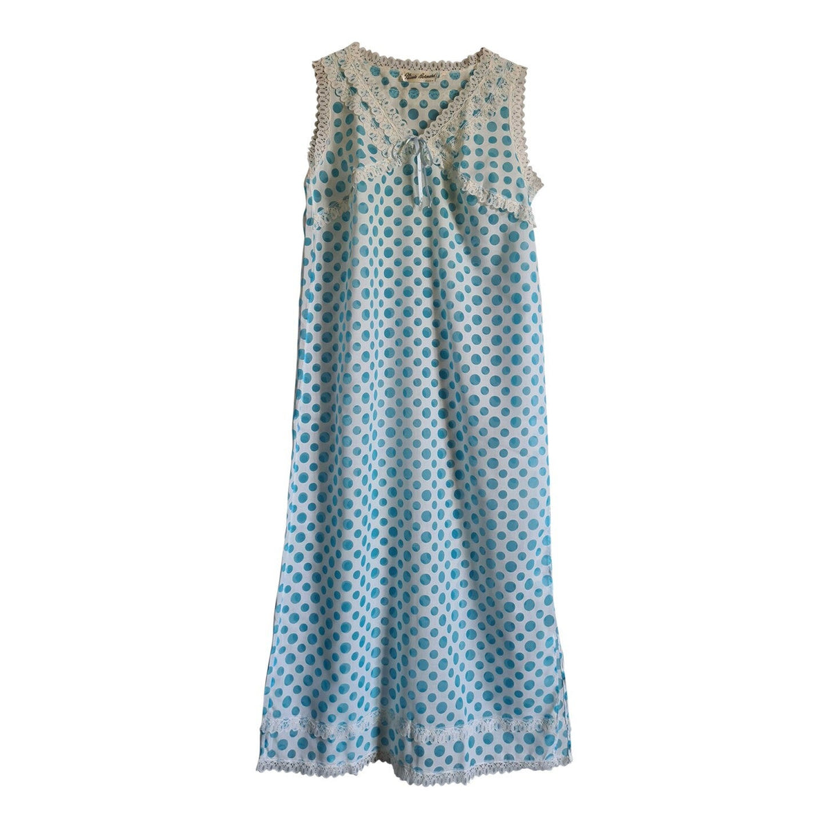 Prix unitaire parNoisette longue blanche à pois bleu ciel, corsage et base décorés de dentelle. Coupe fluide. Le tissu est assez transparent. Fente sur un côté. Poitrine 48 cm.