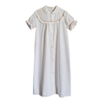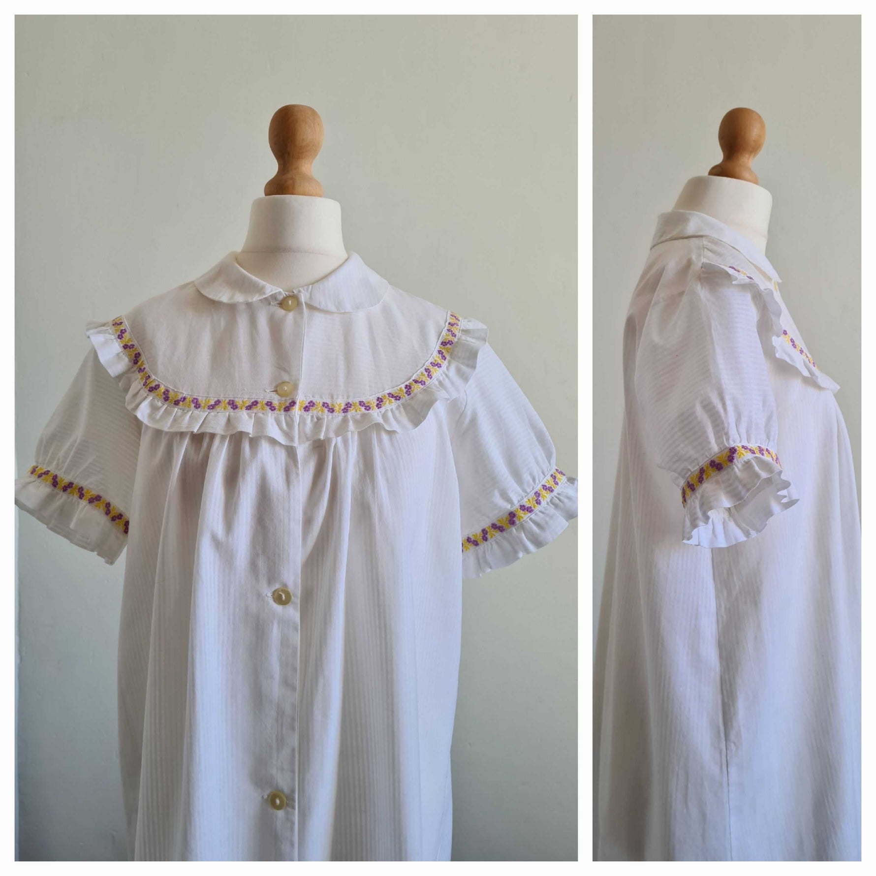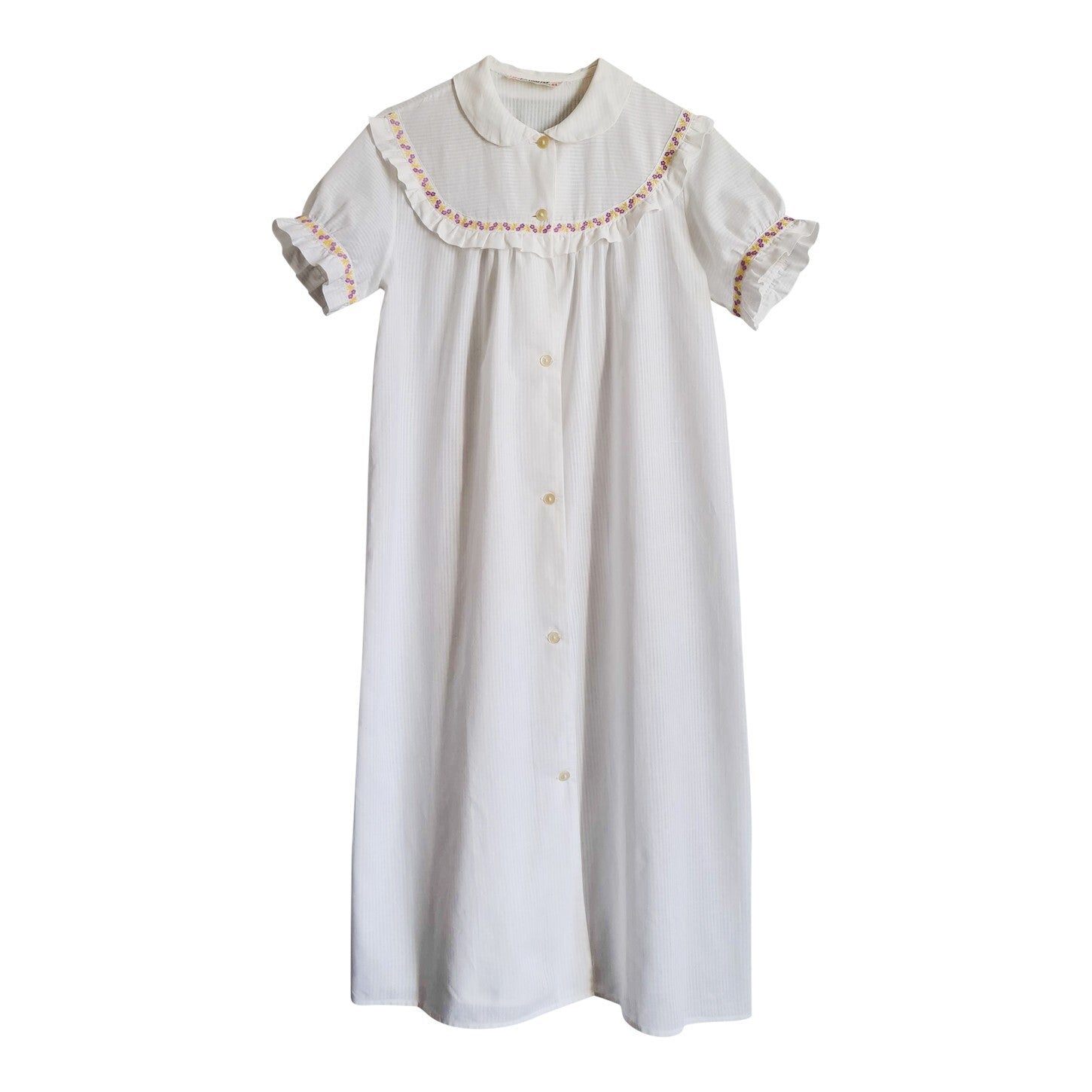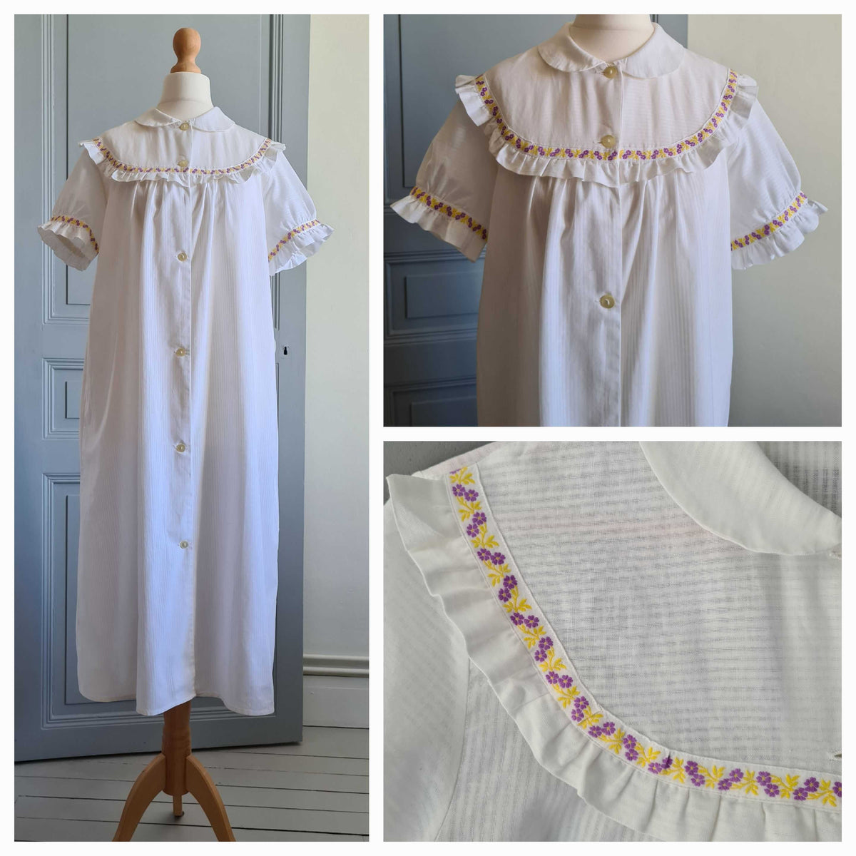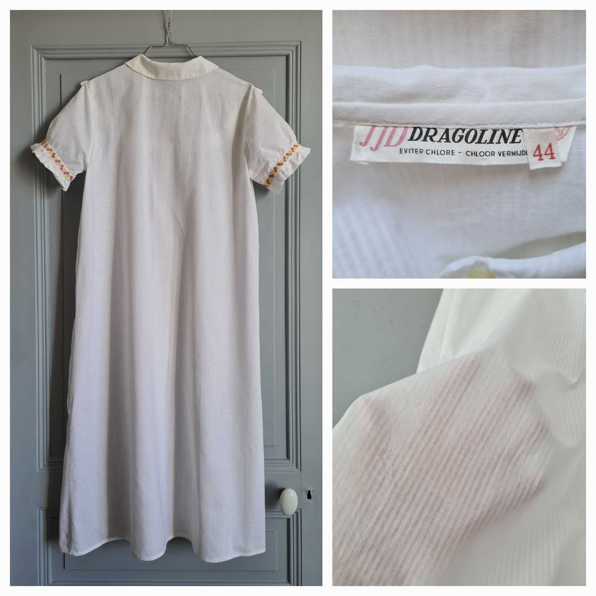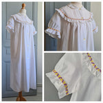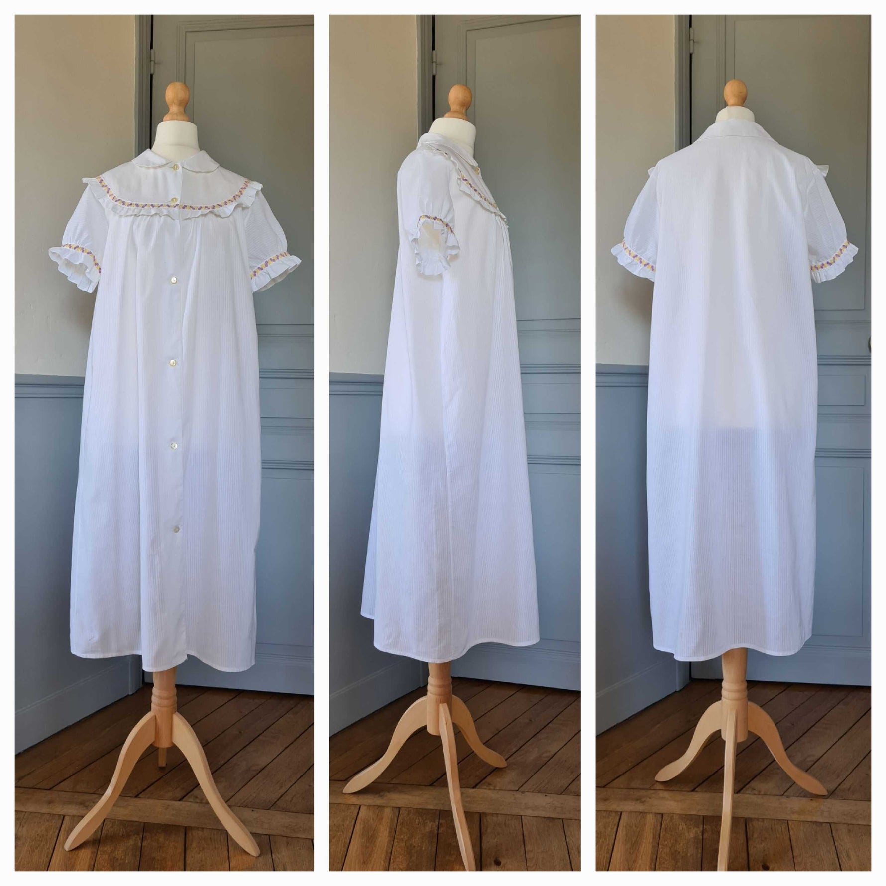 Robe nuisette à col Claudine en coton blanc, manches courtes bouffantes, plastron et bordures des manches à volants et galon brodé de petites fleurs jaunes et lilas, boutonnée devant, coupe trapèze plissée sous le plastron. Coton légèrement transparent, à texture rayée. Poitrine 49 cm.
