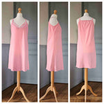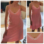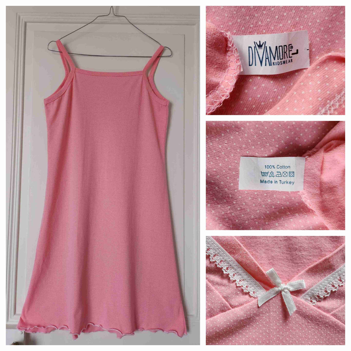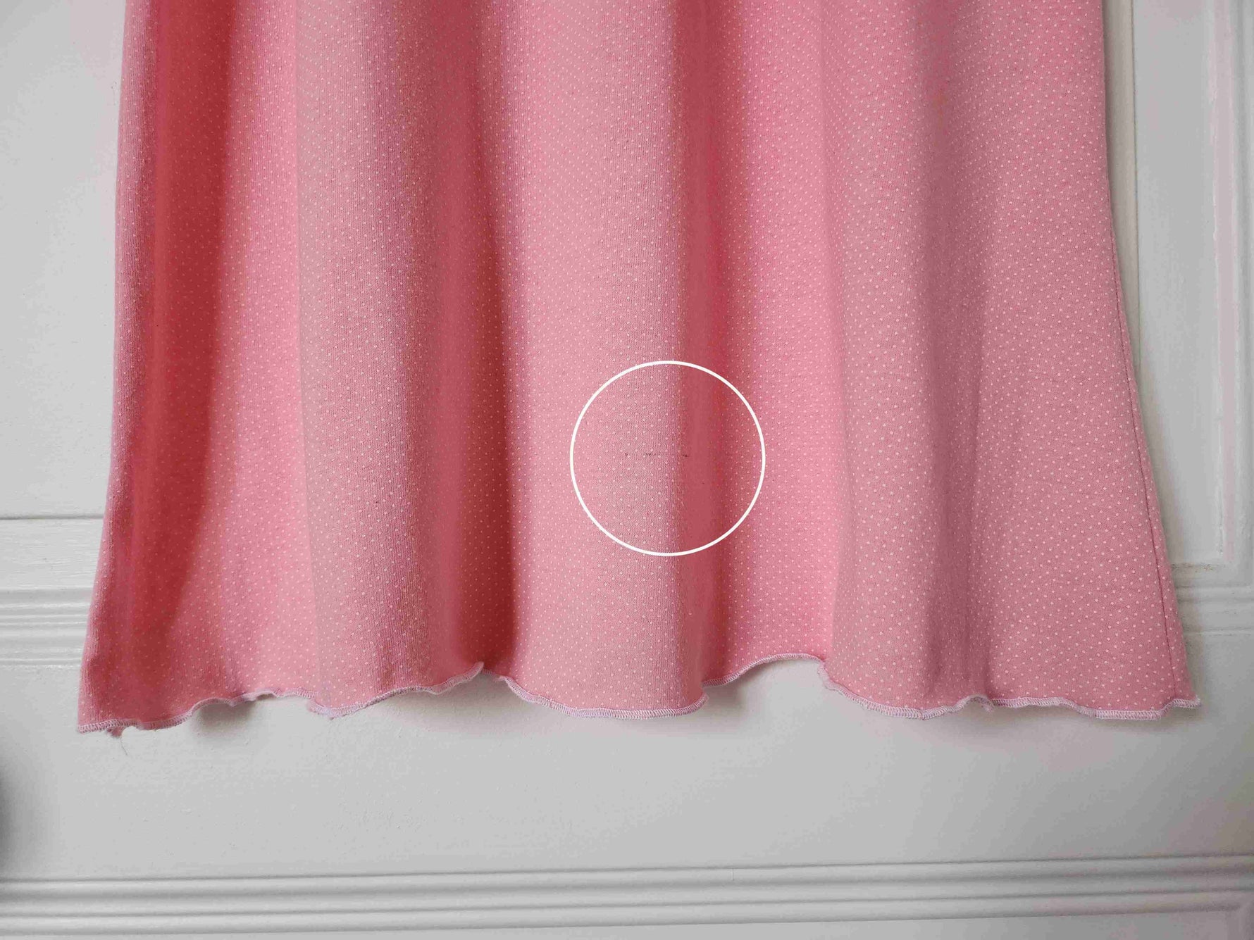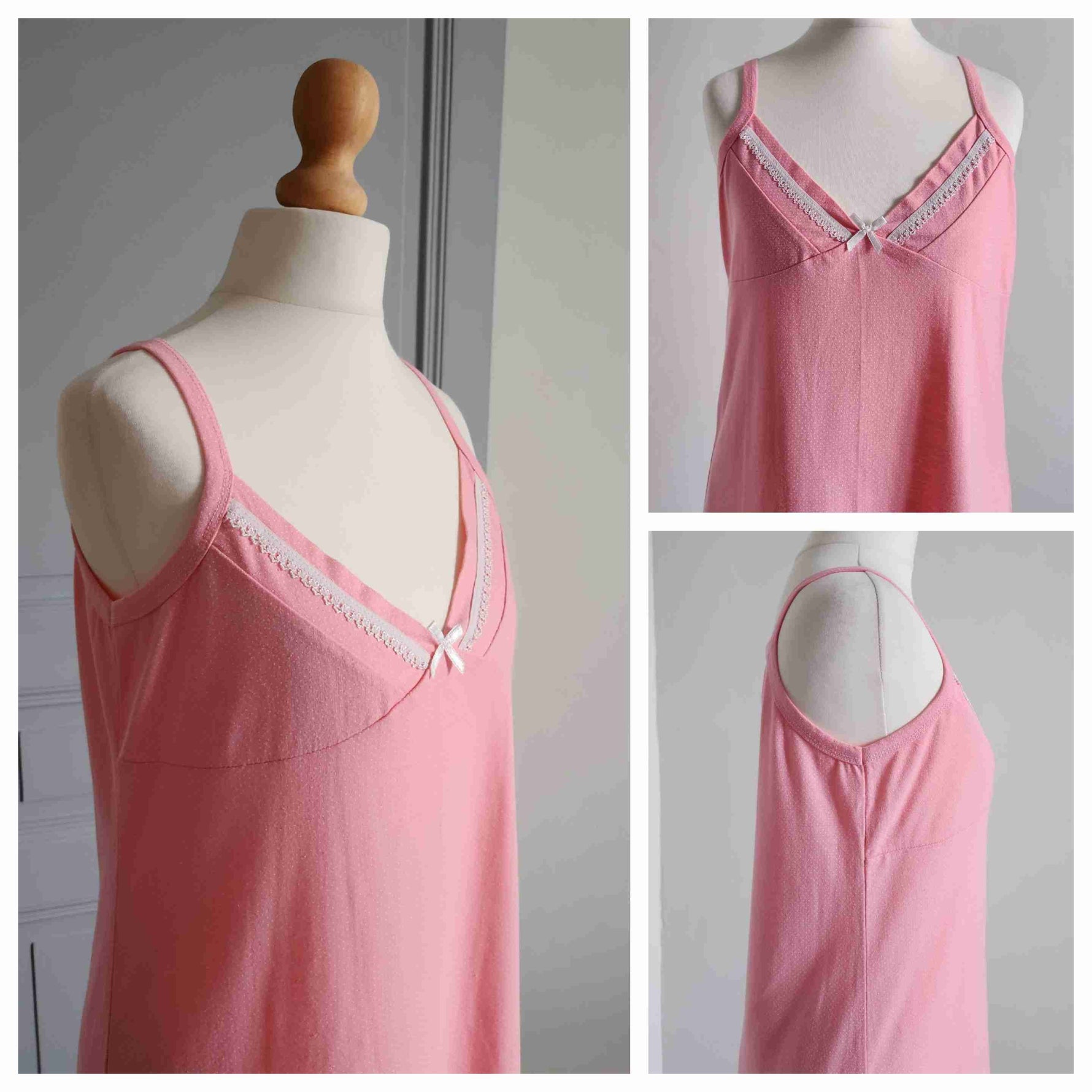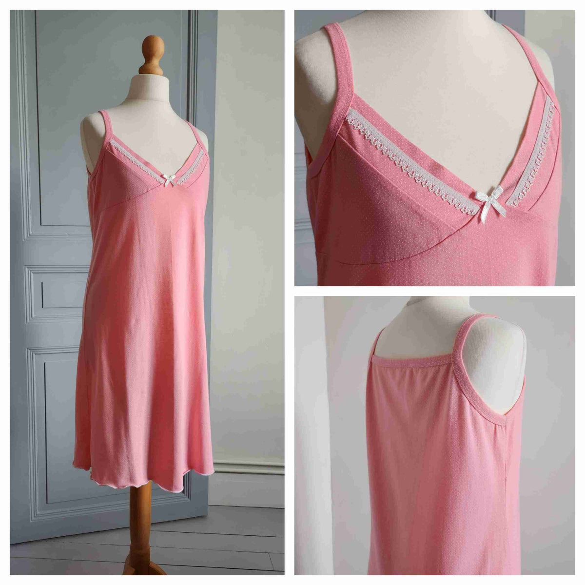 Prix unitaire parNuisette en coton rose à points blancs, bretelles fixes, empiècement poitrine, détail dentelle blanc. Coupe trapèze, bas volanté. Porté sur les photos par une taille 36. Poitrine 43 cm.