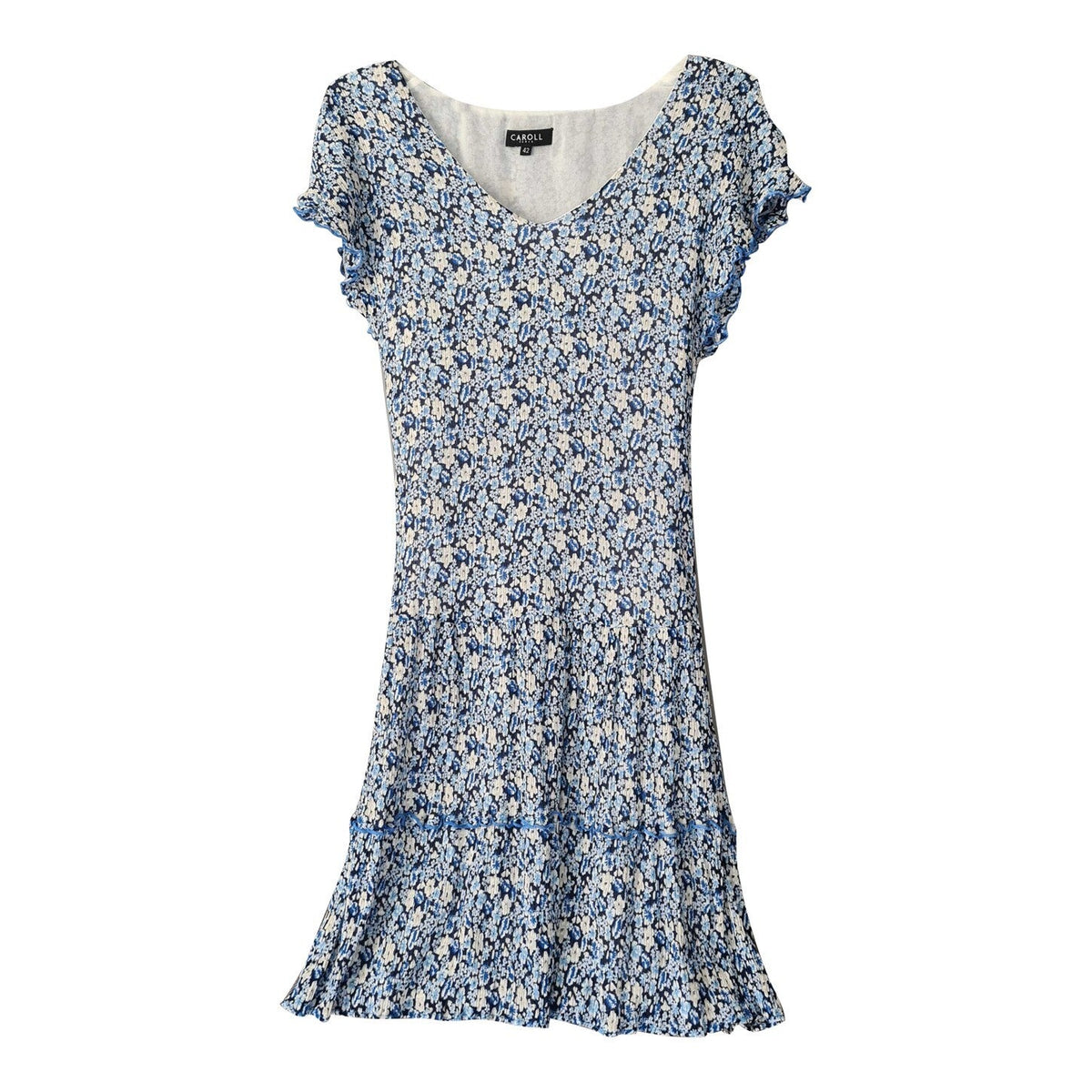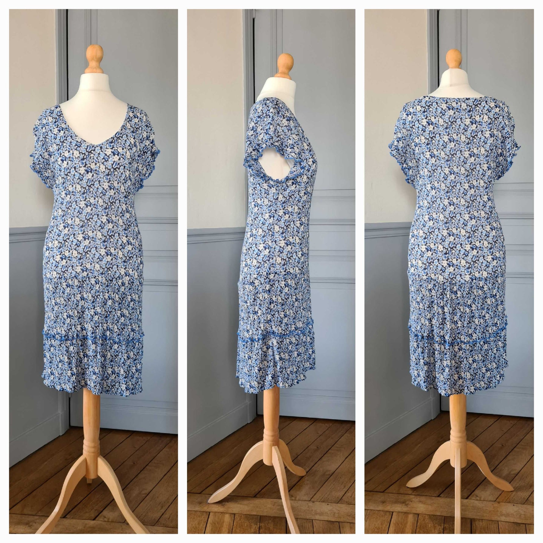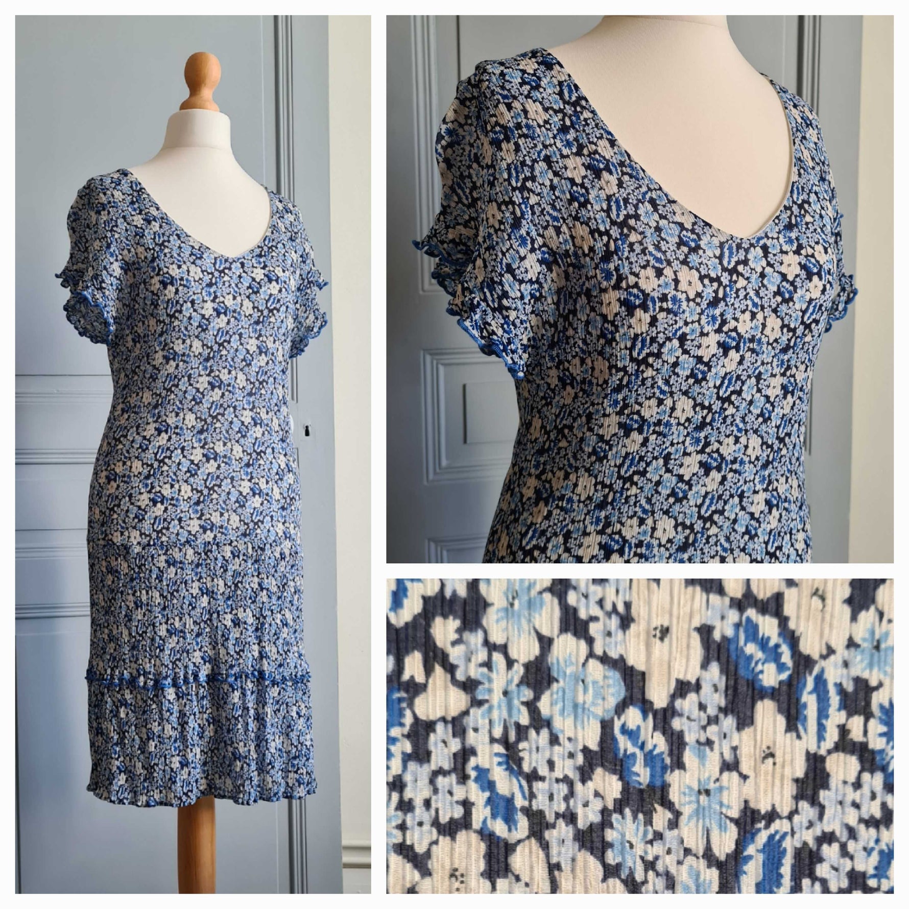 Prix unitaire parRobe en viscose et soie, imprimé petites fleurs tons bleus et blanc, sans manches. Matière gaufrée avec élasticité. Coupe près du corps. Festons en bordure des emmanchures et sur la jupe. Doublée. Marque Caroll, fabriquée en France. Poitrine 44 cm.
