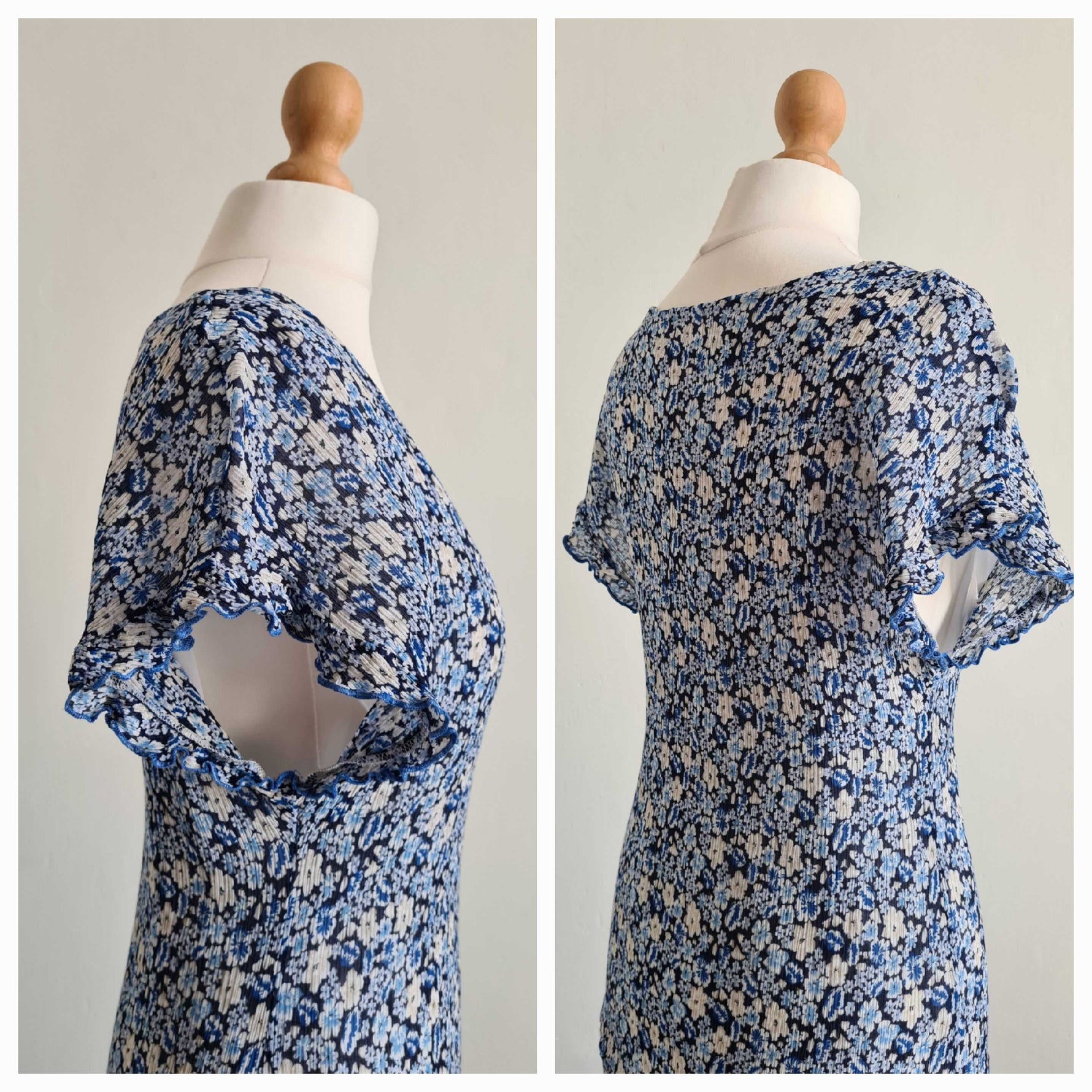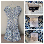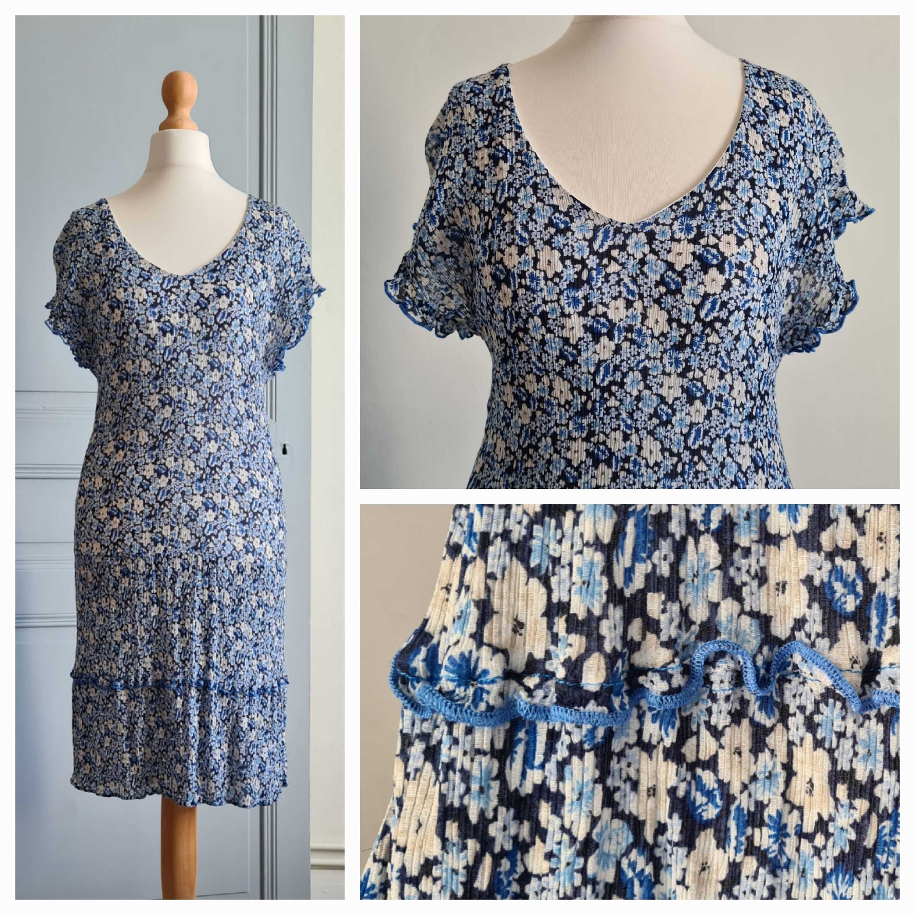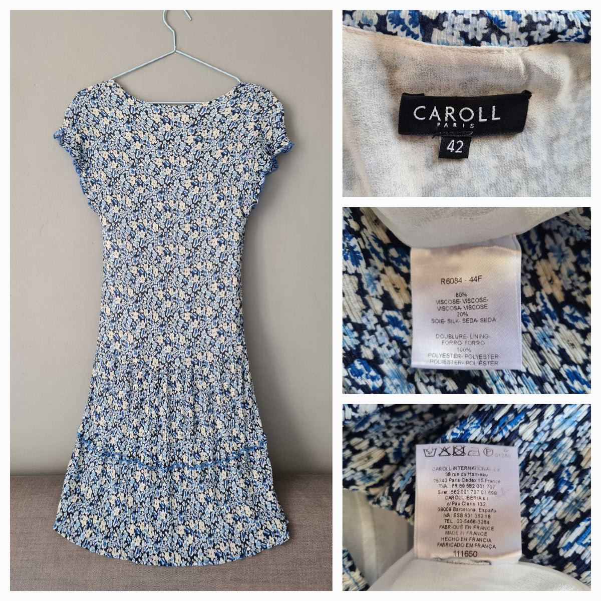 Prix unitaire parRobe en viscose et soie, imprimé petites fleurs tons bleus et blanc, sans manches. Matière gaufrée avec élasticité. Coupe près du corps. Festons en bordure des emmanchures et sur la jupe. Doublée. Marque Caroll, fabriquée en France. Poitrine 44 cm.