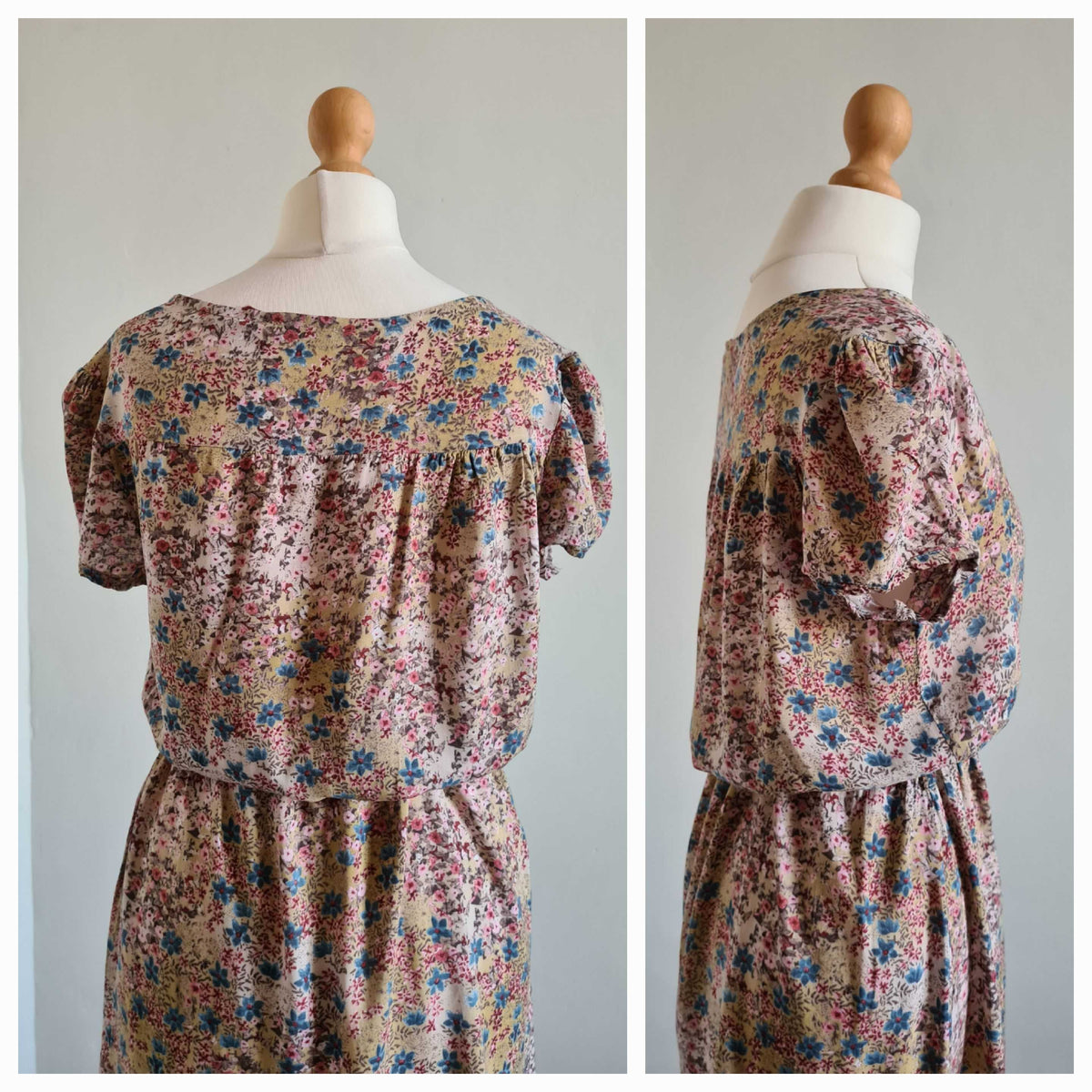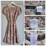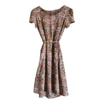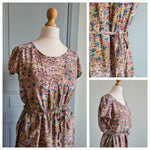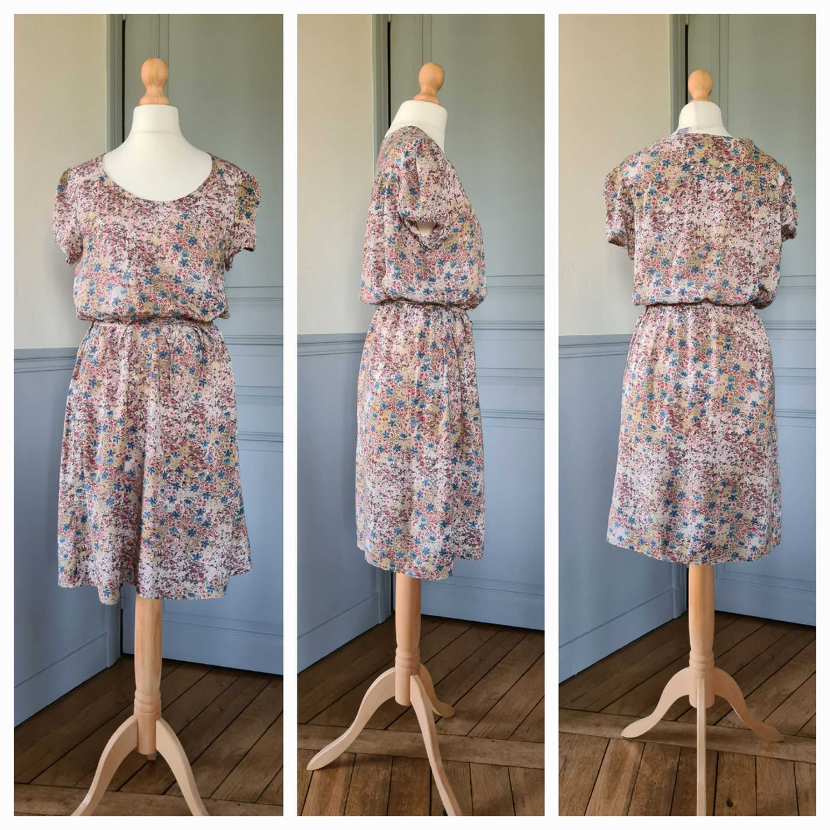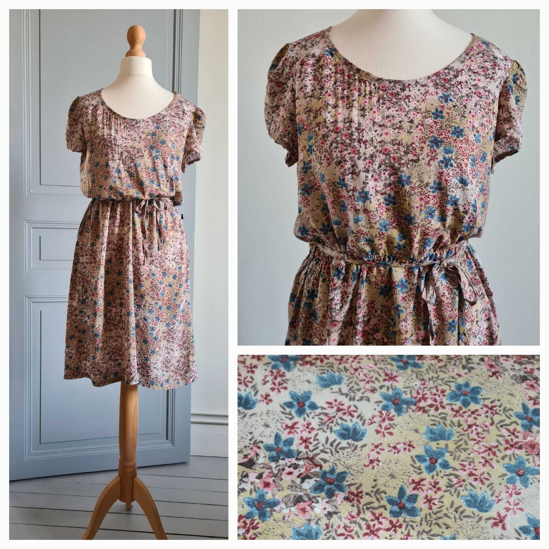 Robe en viscose beige doré à petites fleurs roses et bleues.