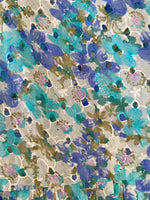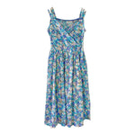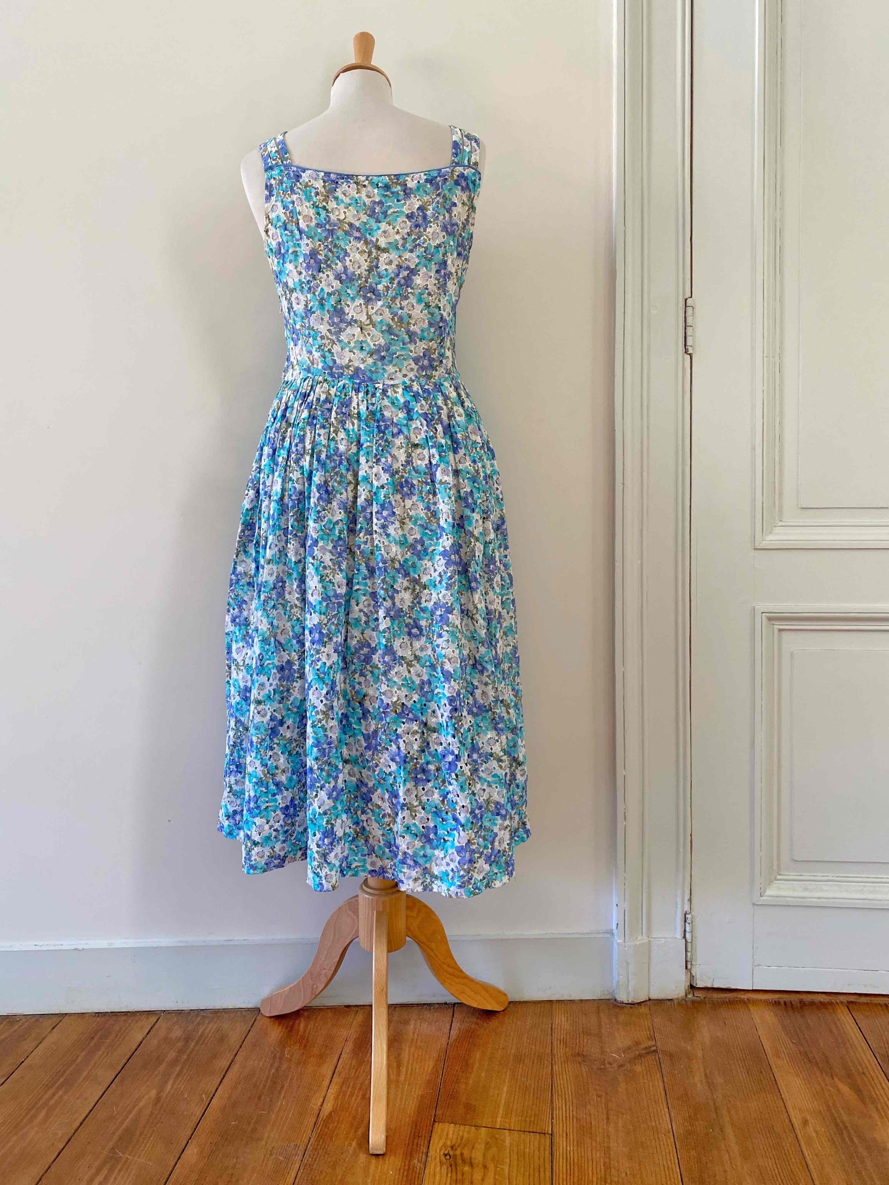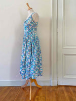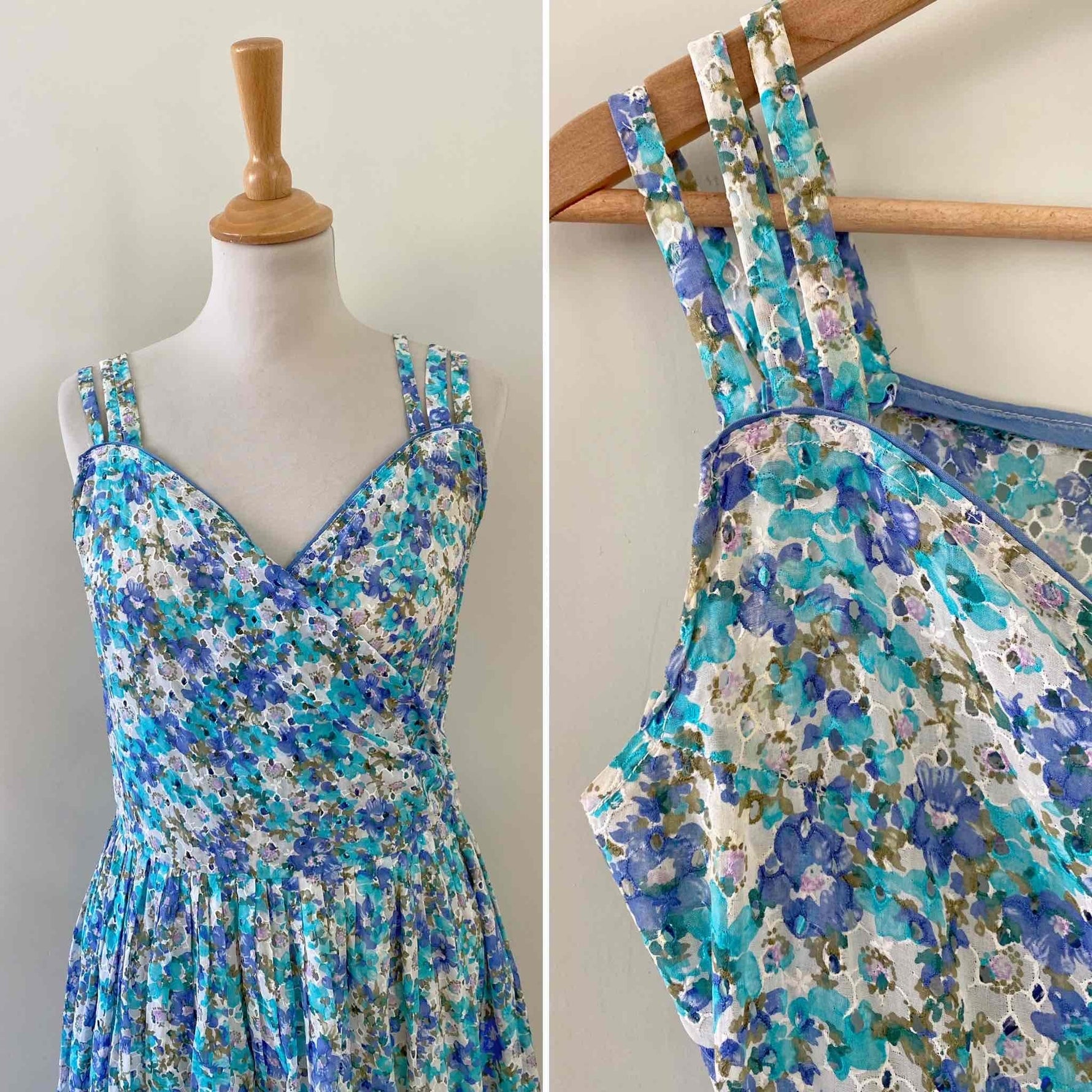Robe en broderies anglaises, coton brodé, ajouré et imprimé de fleurs lilas, bleu ciel et vert prairie, bretelles triples fines, encolure cache-coeur drapée, bas jupon plissé, confectionnée mains dans les années 60’s, taille 36 portée ici sur un mannequin T36, aisselles 43 cm.