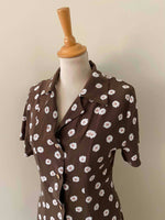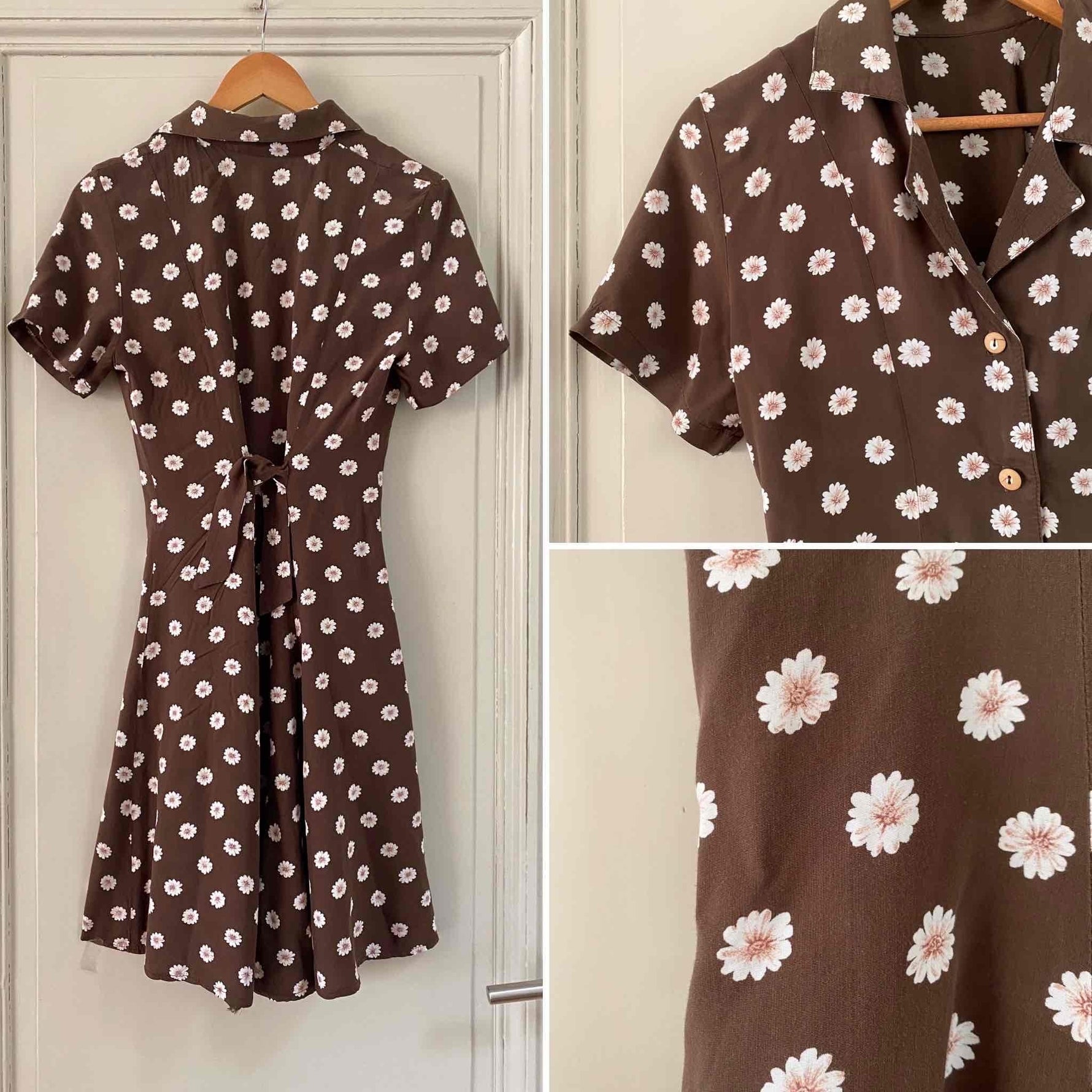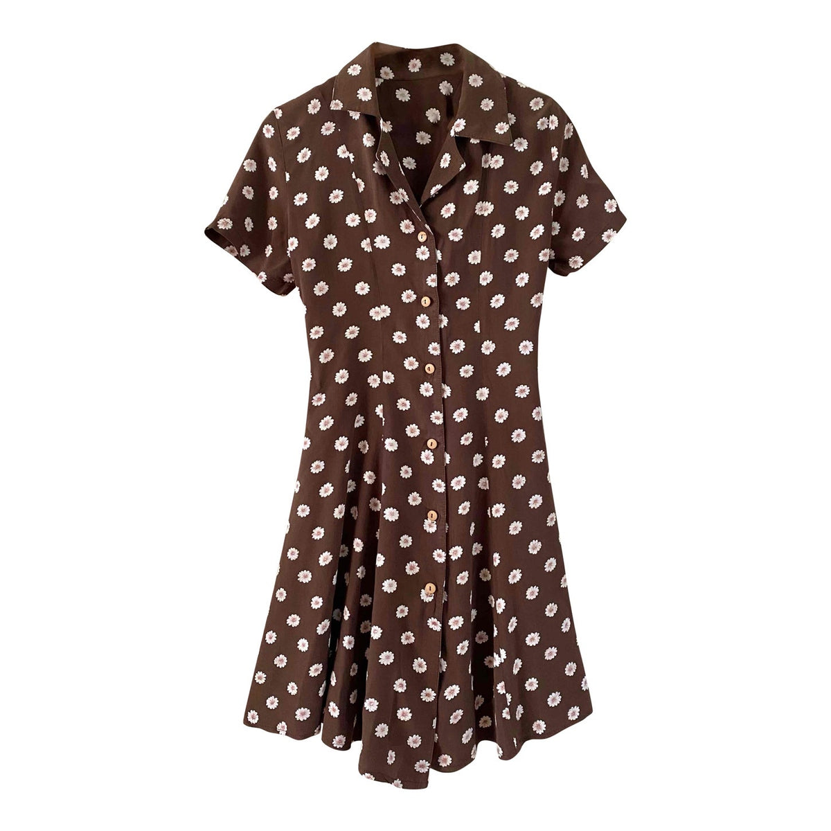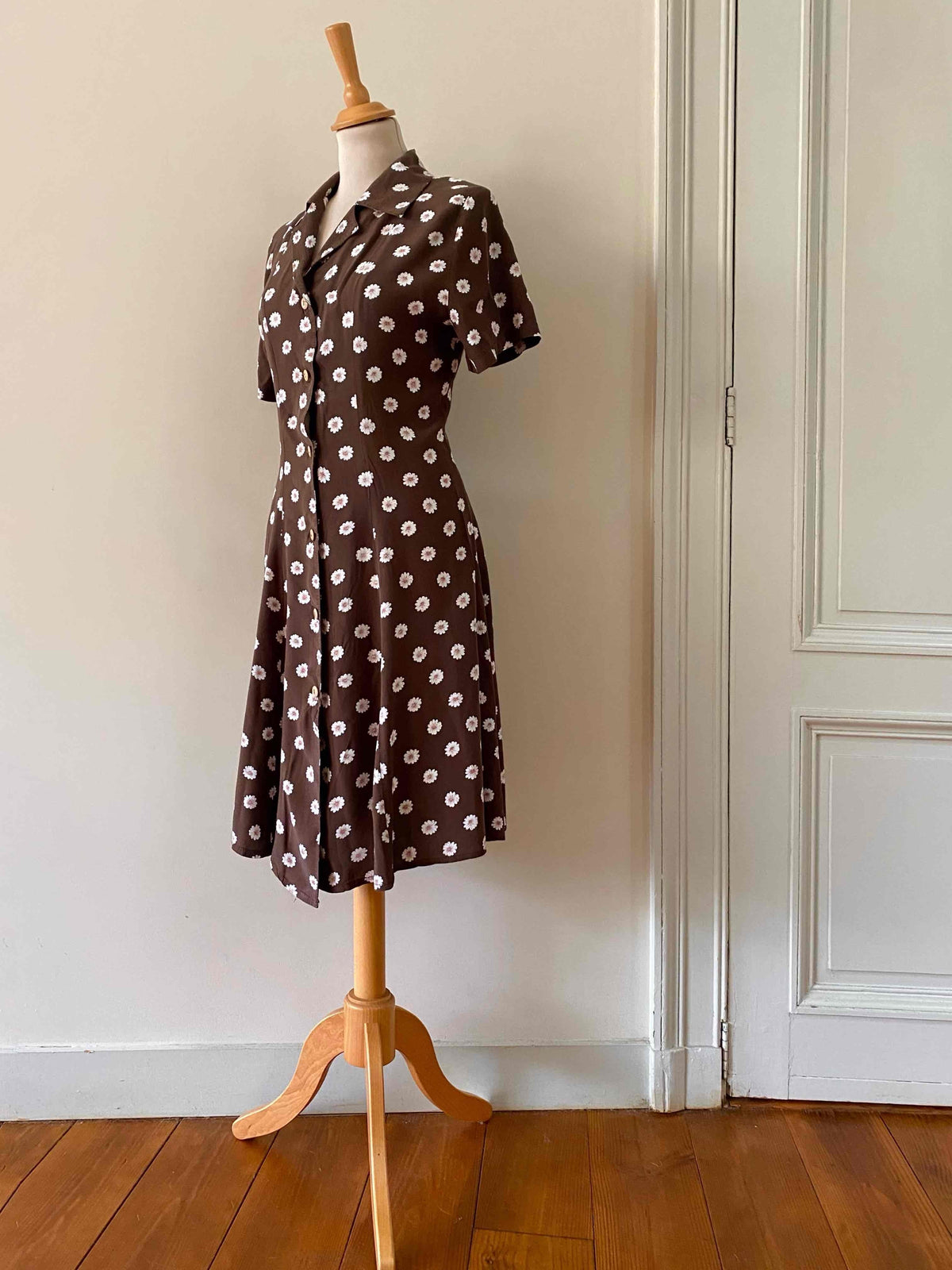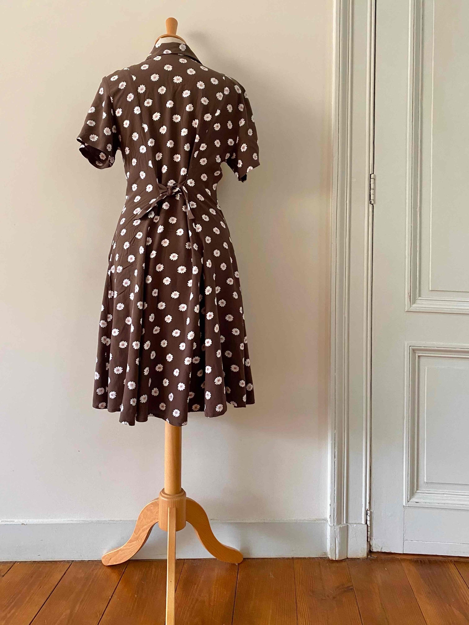 Prix unitaire parRobe chemise à fleurs, en viscose chocolat imprimée fleurs de marguerites blanches et marrons, col chemisier, manches courtes, taille dos à nouer, boutonnée, fabriquée en France, taille 36 portée ici sur un mannequin T36.