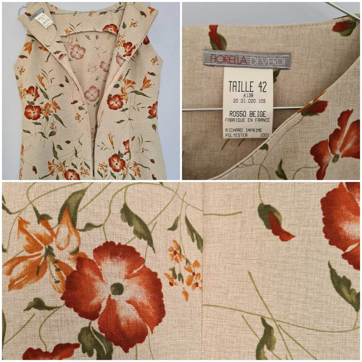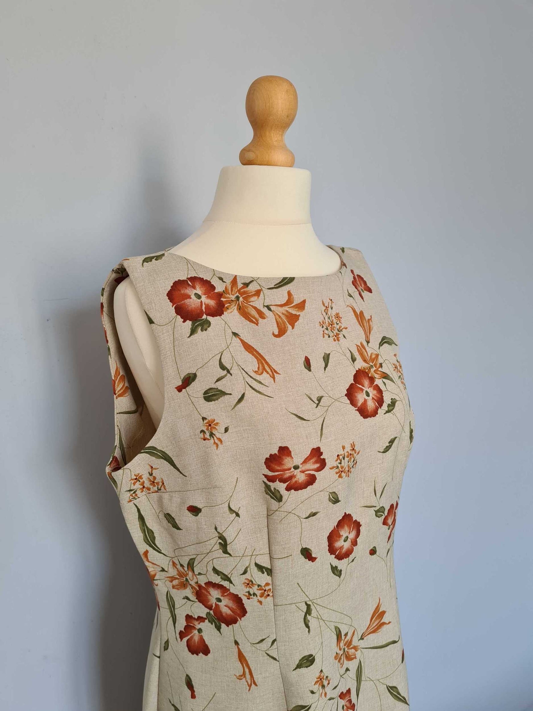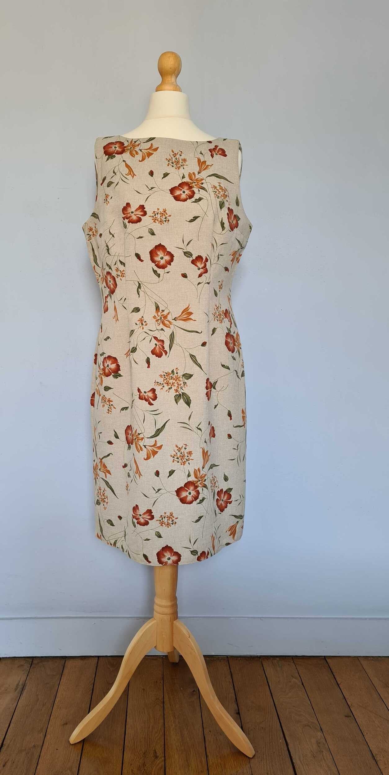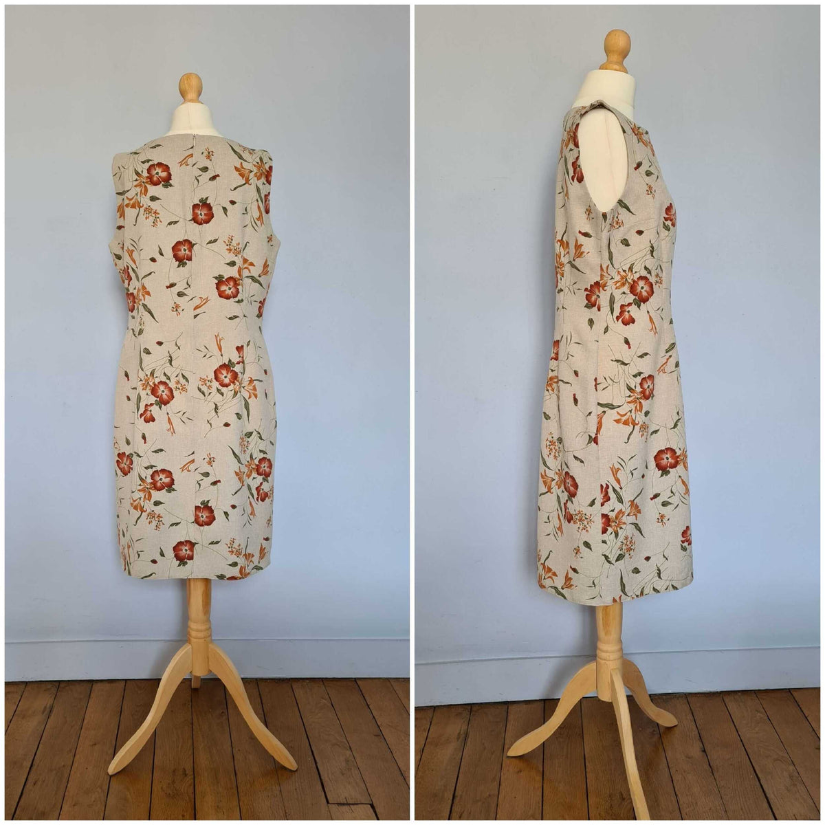 Robe crayon coupe cintrée sans manches, imprimé fleurs corail & kaki sur fond ton lin. Grand zip invisible au dos. Dead stock années 90. Made in France. Poitrine 48 cm.
