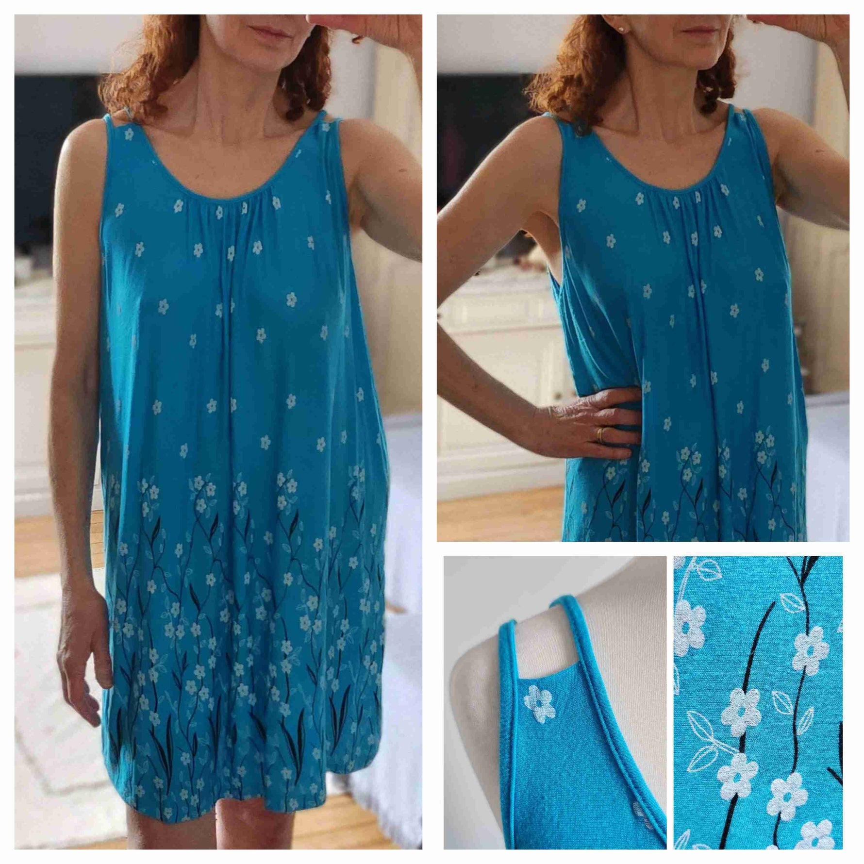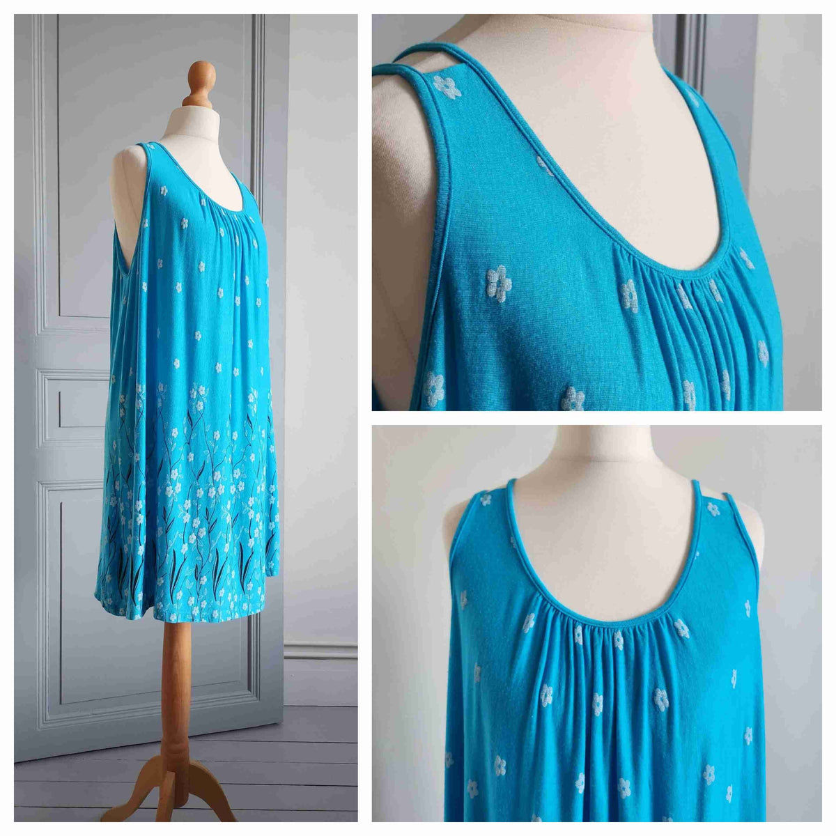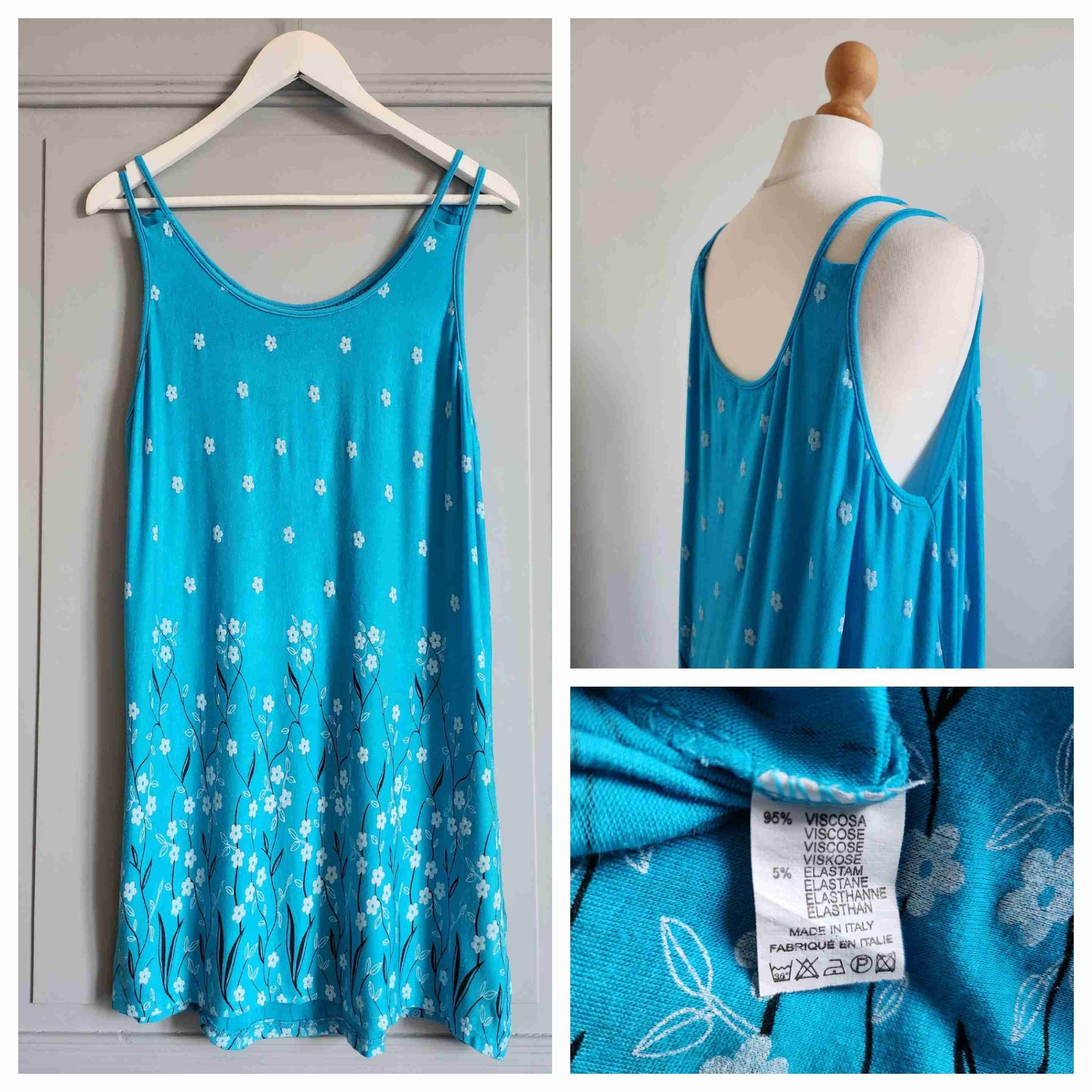 Robe de plage à bretelles, en viscose 95%, bleu ciel, à petites fleurs blanches et motif floral blanc et noir au bas, décolleté froncé, matière stretch, tombé fluide. Fabriqué en Italie. Poitrine 45cm.