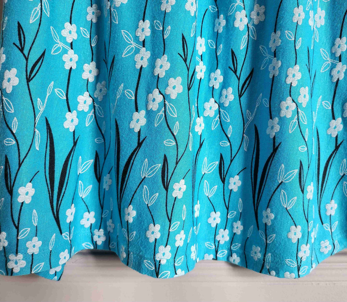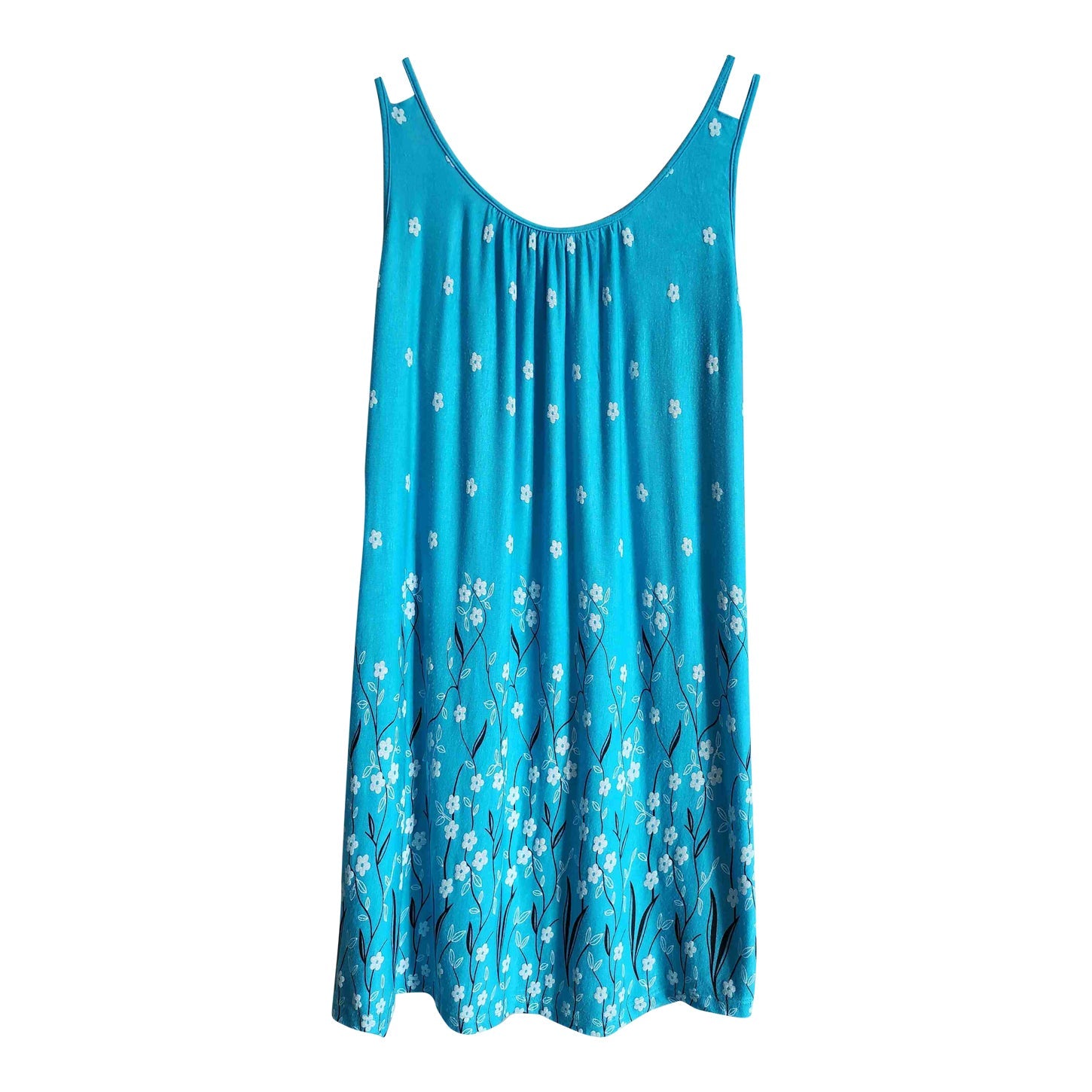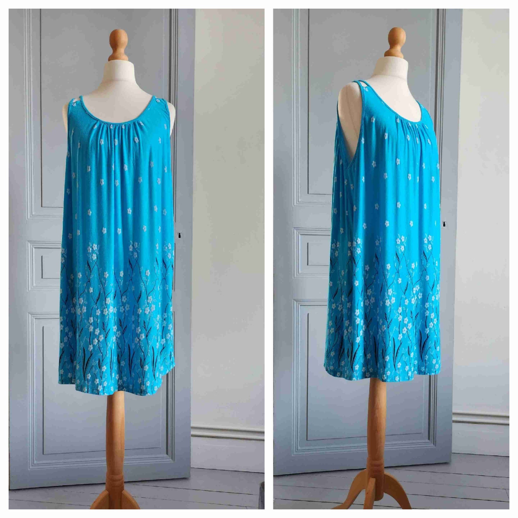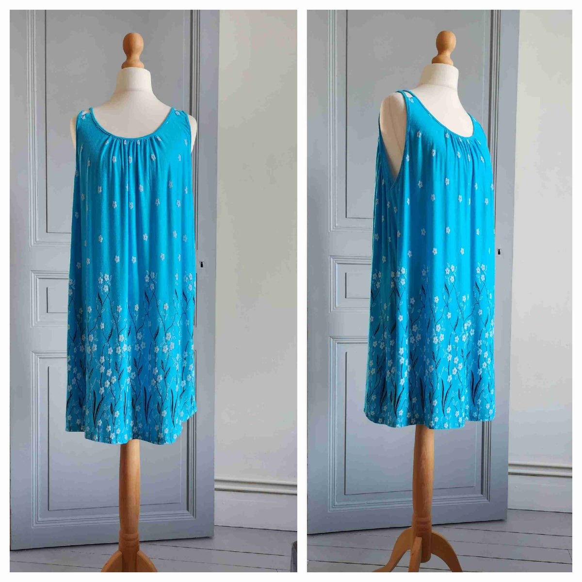 Robe de plage à bretelles, en viscose 95%, bleu ciel, à petites fleurs blanches et motif floral blanc et noir au bas, décolleté froncé, matière stretch, tombé fluide. Fabriqué en Italie. Poitrine 45cm.