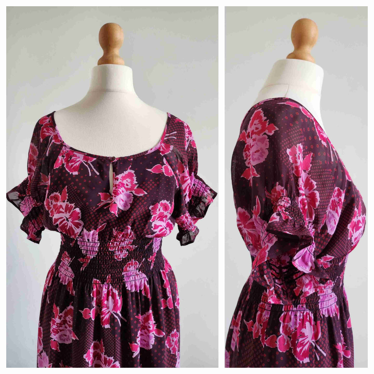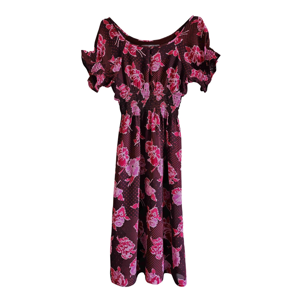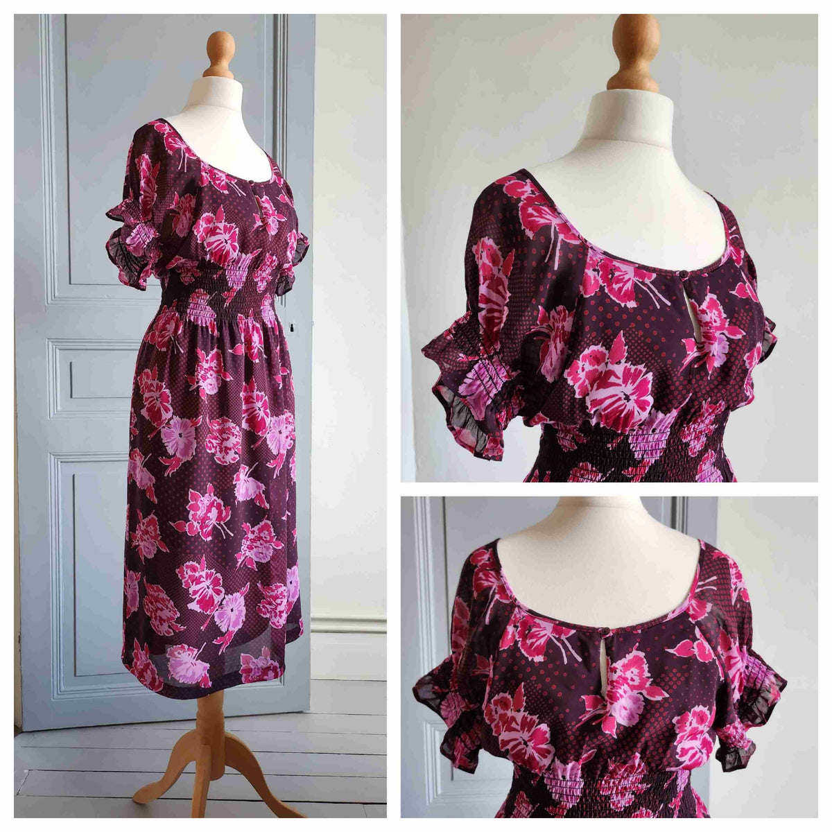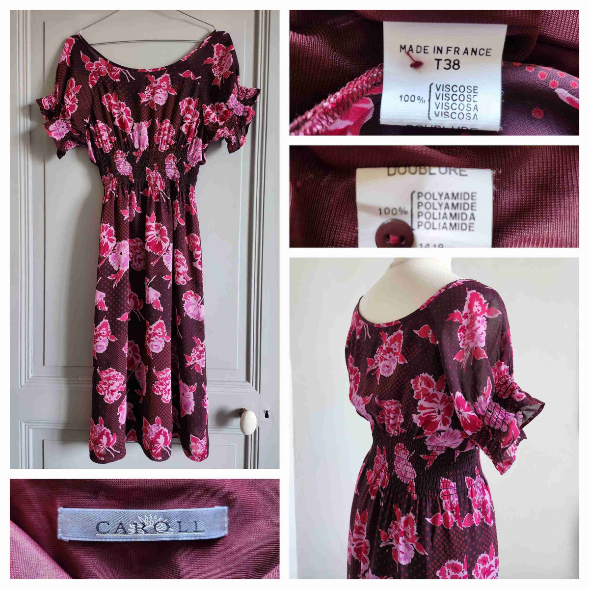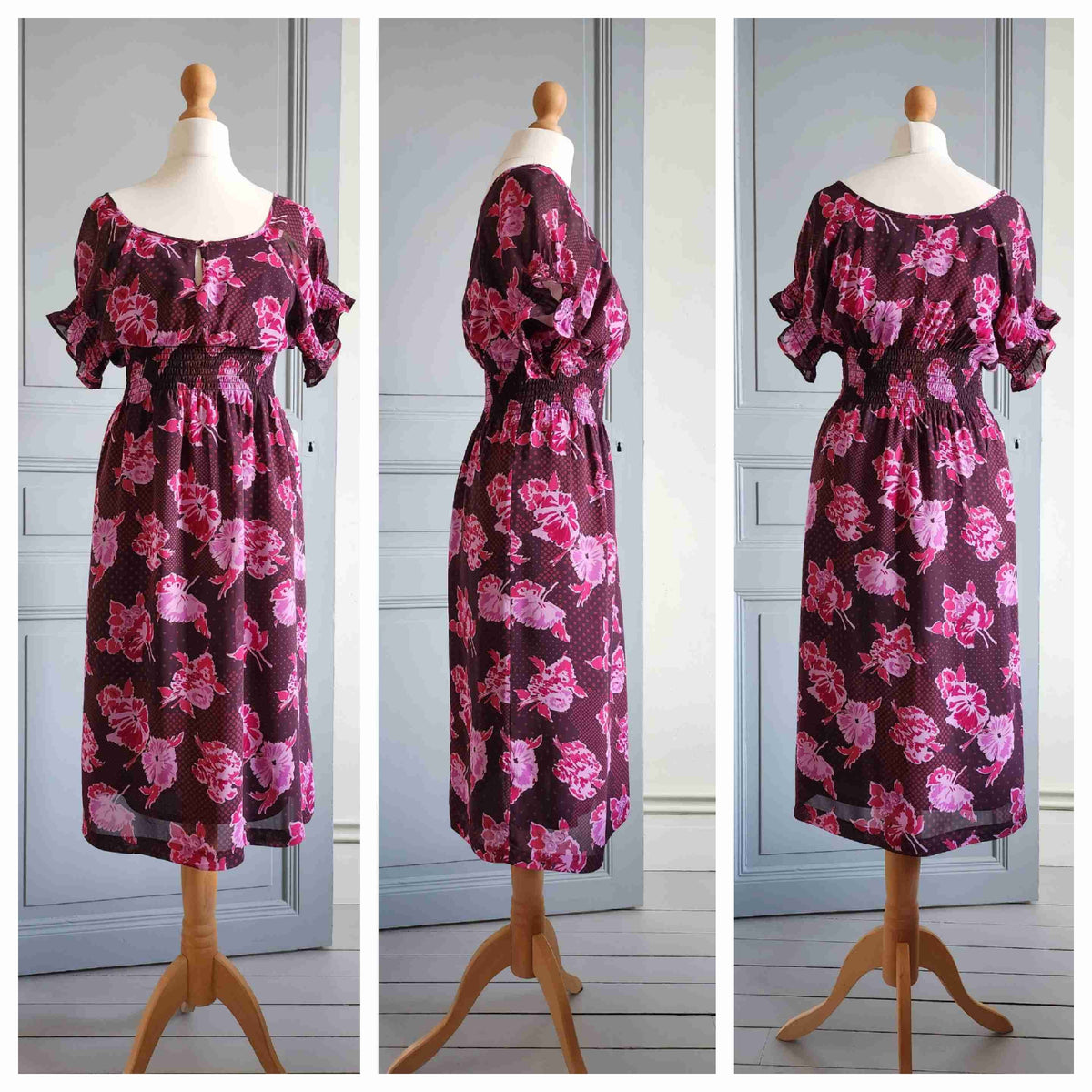 Robe 90's en voile viscose doublé, à pois irréguliers et fleurs roses sur fond bordeaux, manches courtes raglan smockées bouffantes, taille haute, large smock sous poitrine, corsage à décolleté fendu devant et fermé par mini bouton bride. Marque Caroll. Fabriqué en France. Poitrine 35 cm.