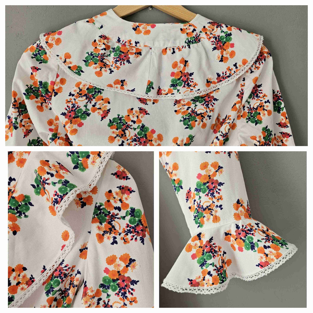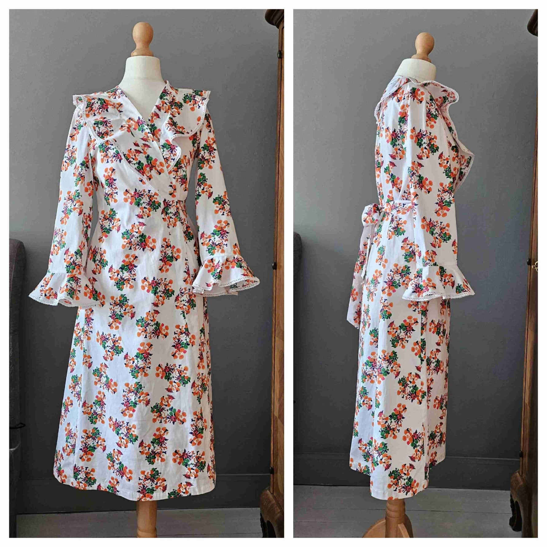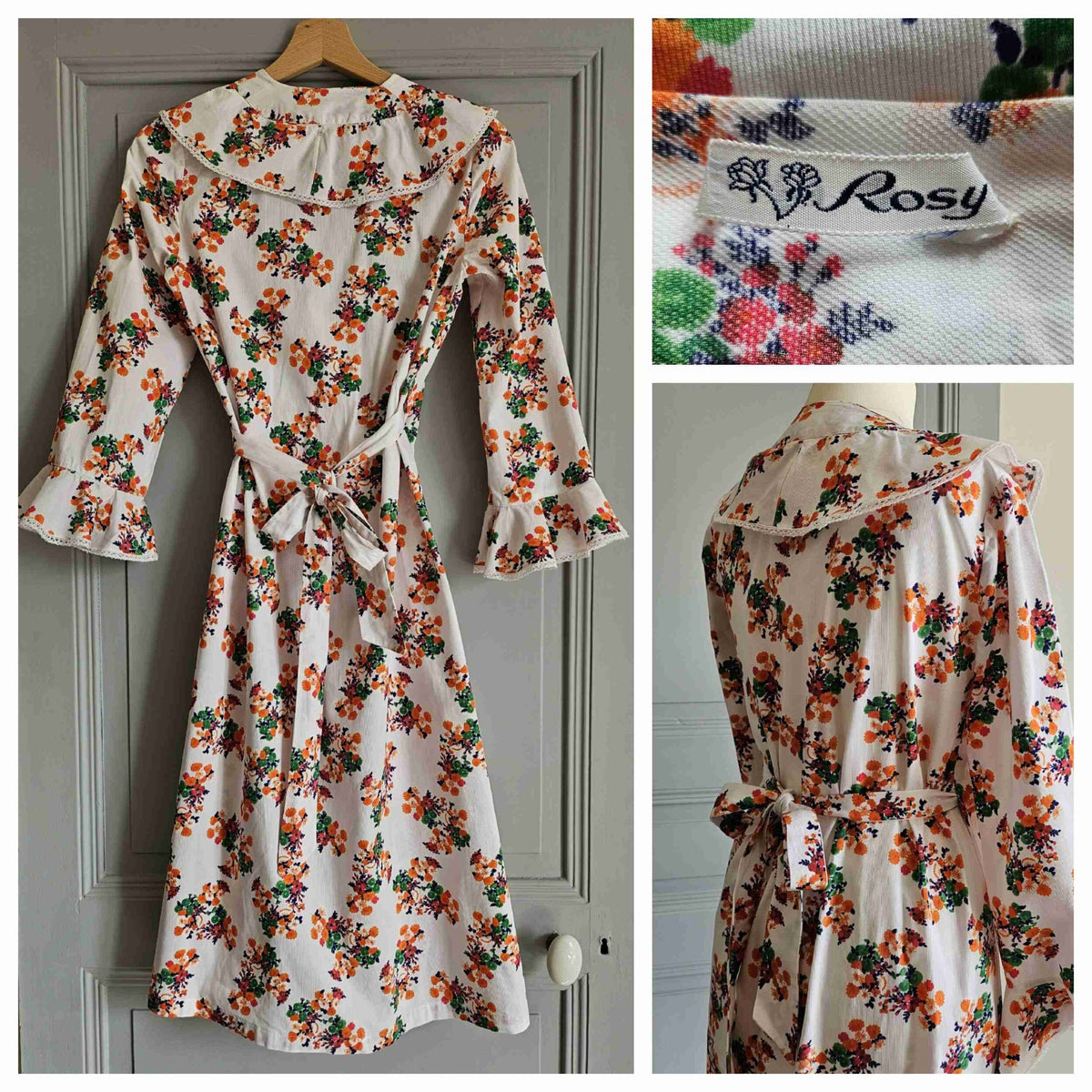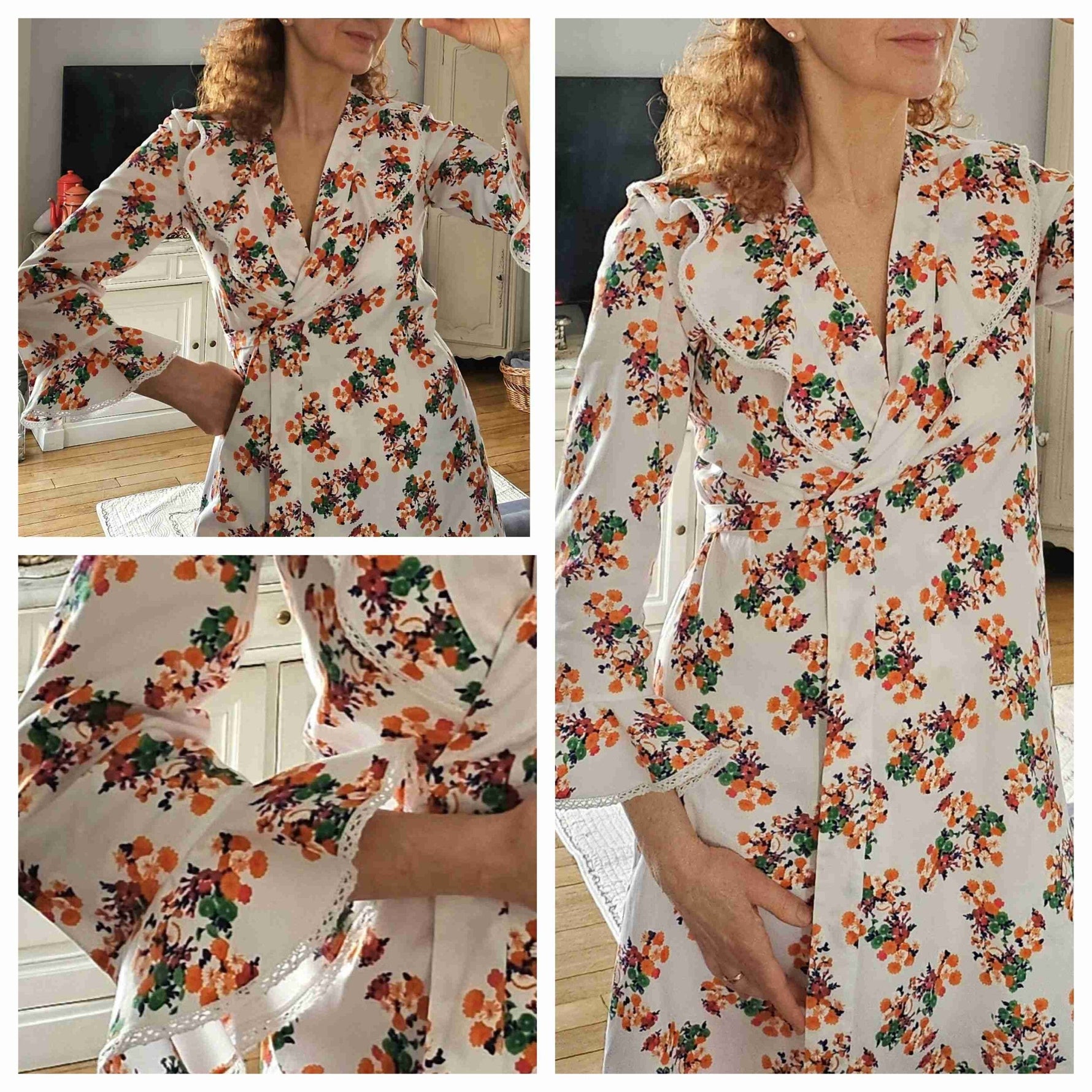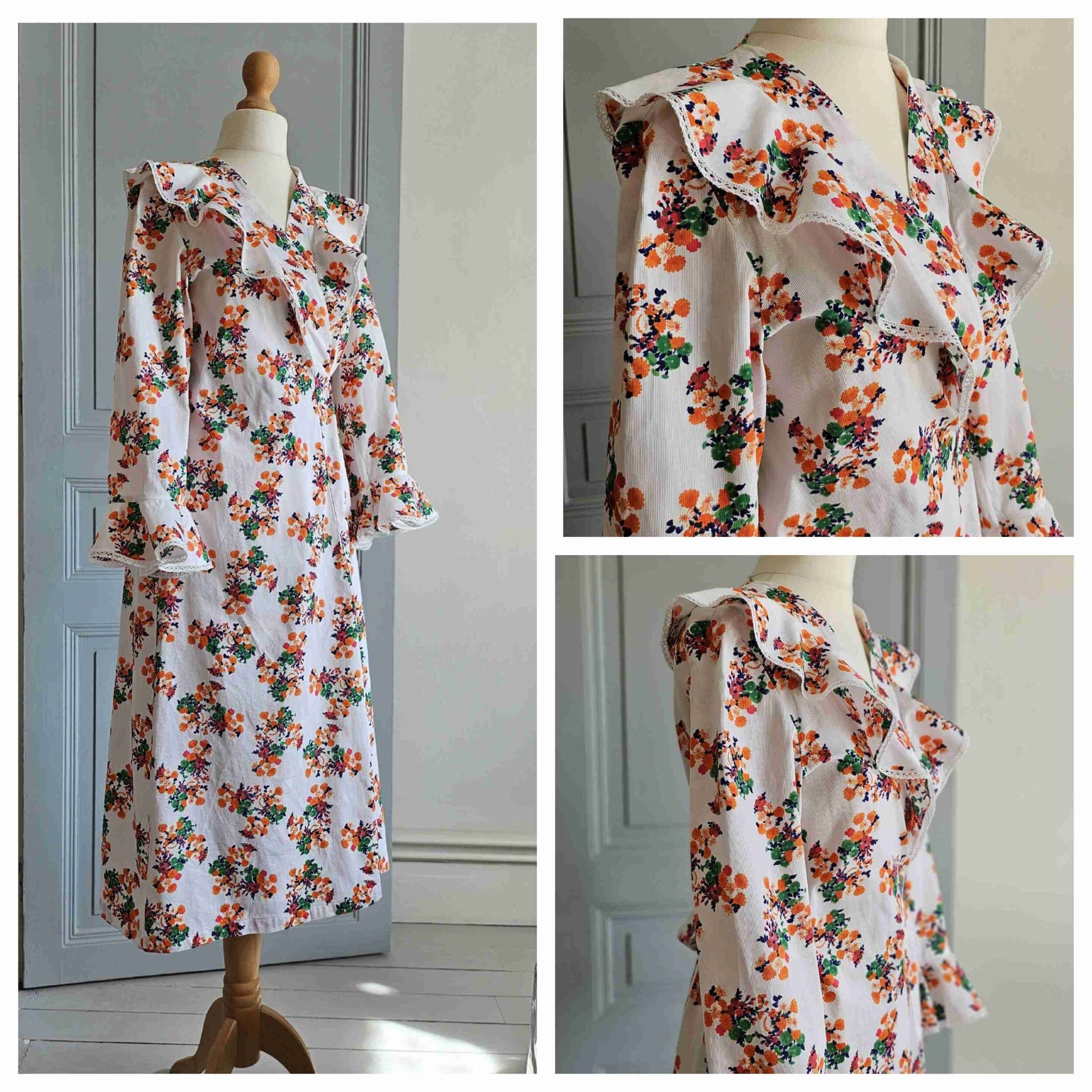 Prix unitaire parRobe portefeuille en coton blanc imprimé floral orange, vert et marine, manches 3/4, grand col et poignets volantés bordés de dentelle crochet, lien intérieur à croiser et nouer à l'arrière. Porté sur les photos par une personne T36. Longueur midi.